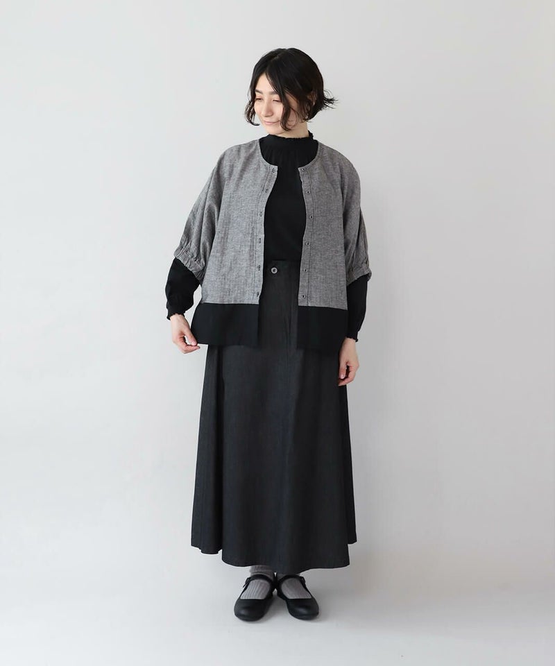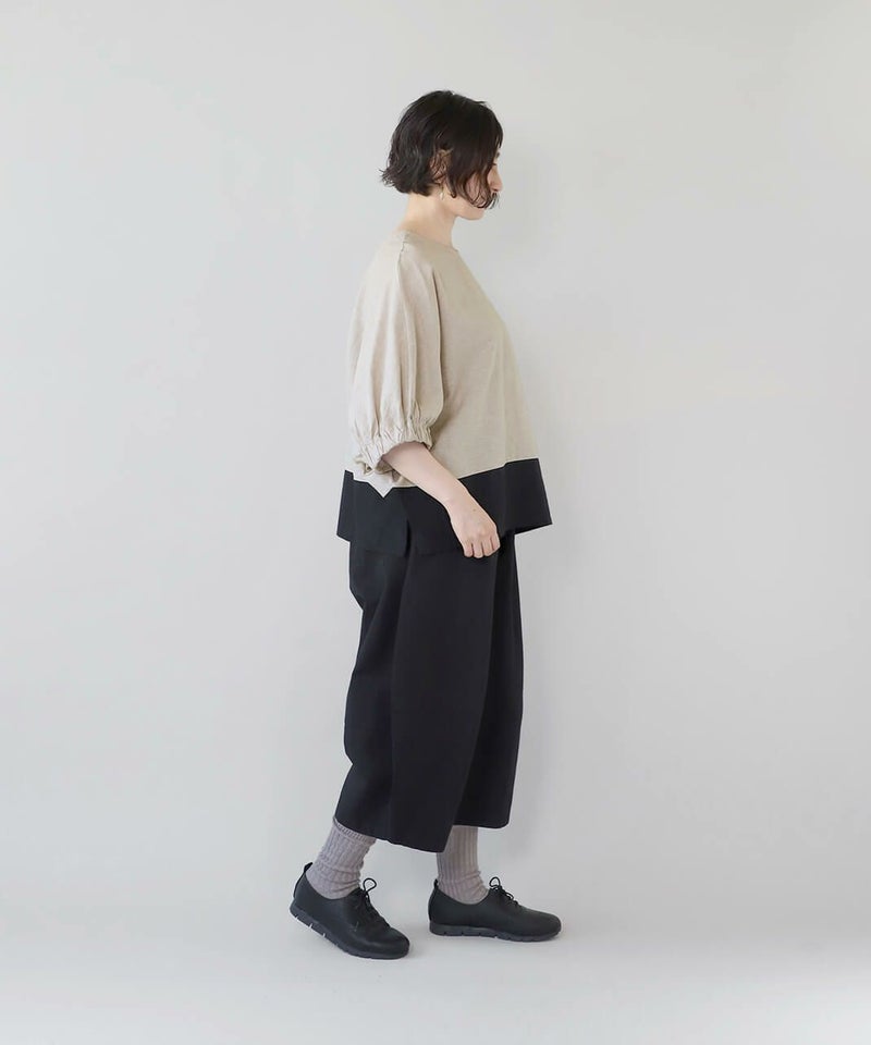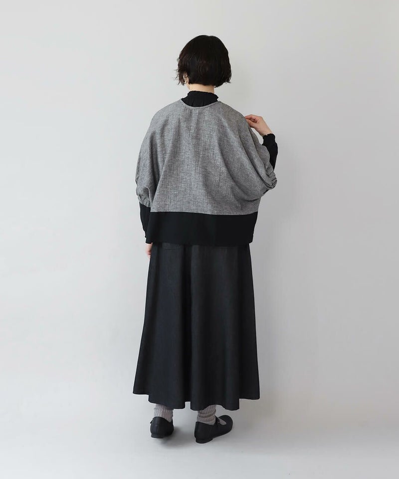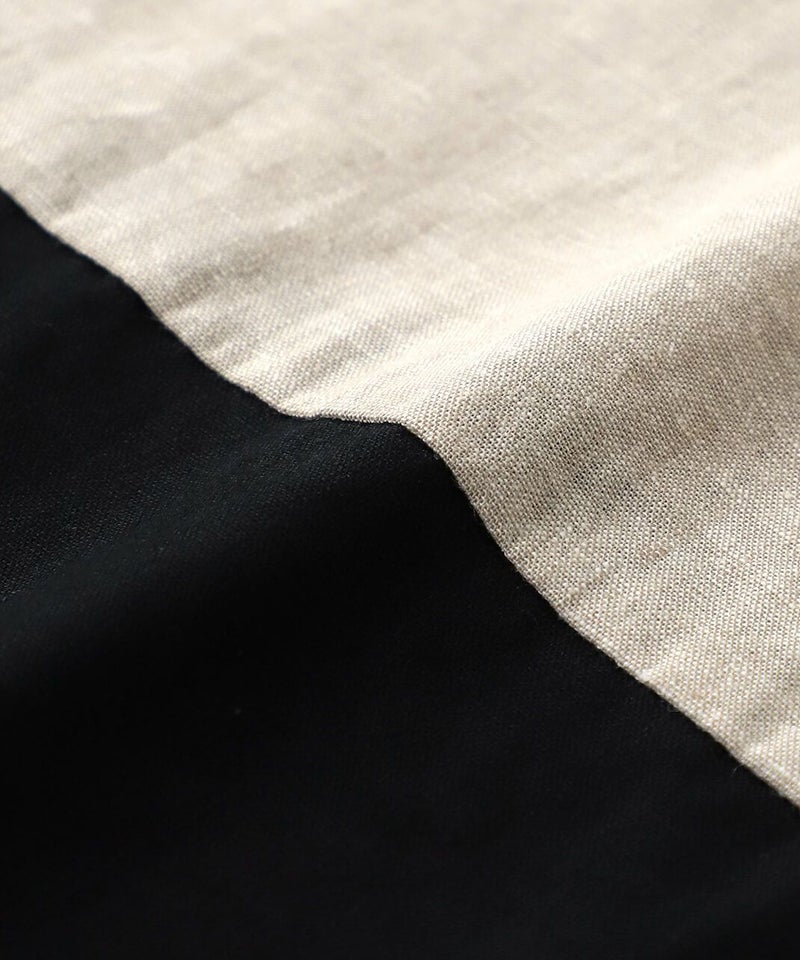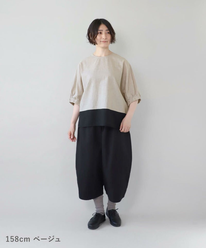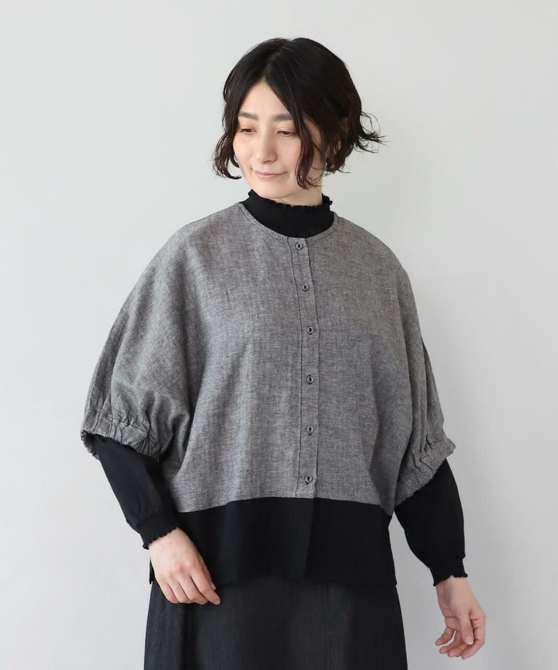 コットンリネン素材を使用した2WAYドルマンブラウスです。 クルーネックにワイドな身頃とドルマンショルダーでゆったりとした着心地。プルオーバーとしてはもちろん、ボタン付きのブラウスとしても着用可能な2WAY仕様です。裾の配色切替えが目を惹き、コーディネートのアクセントになります。インナーにカットソーやワンピースを合わせて軽い羽織りとして着こなすのもおすすめです。