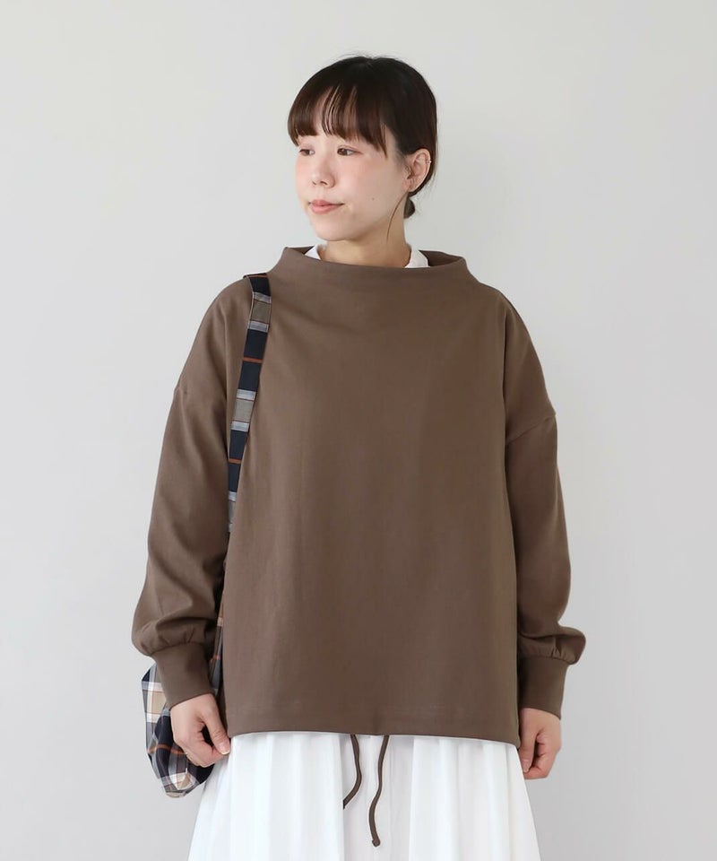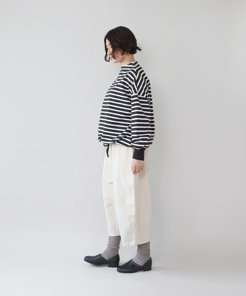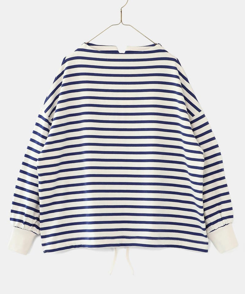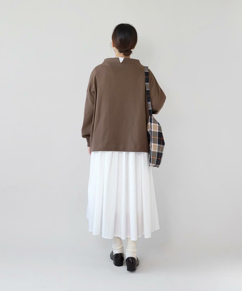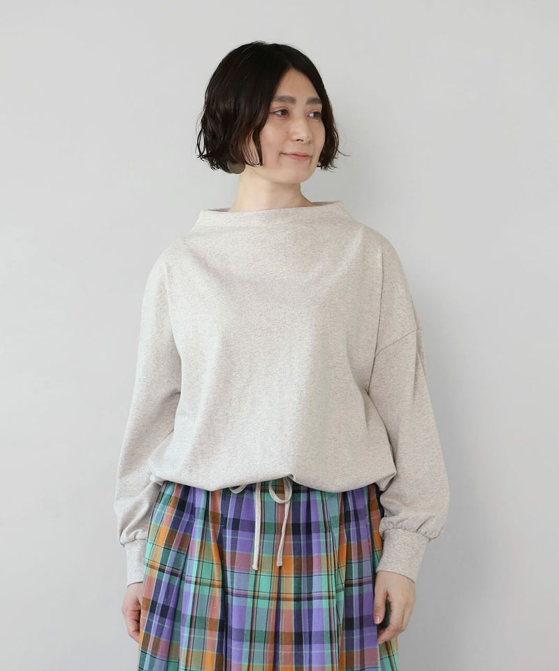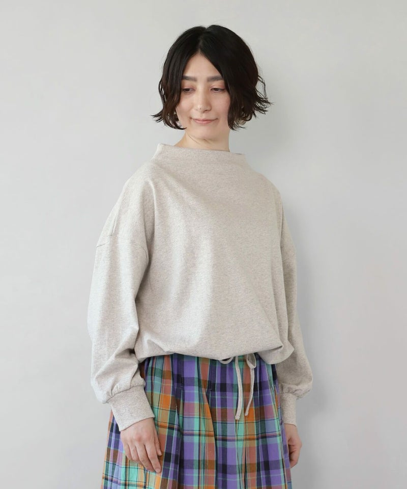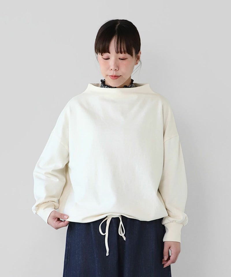 しっかりとした厚みで柔らかな肌触りのコットンを使用したプルオーバーです。 裾にぐるりと紐が入っているので、自分好みのバルーンシルエットに出来る楽しい1着です。ボトルネックには後ろにスリットが入ったおしゃれなデザイン。袖先はリブ切替えのため、まくしあげることも可能です。ワイドな身頃とドロップショルダーでゆったりとした着心地。そのままの着用はもちろんですが、ワンピースとの重ね着にもおすすめです。