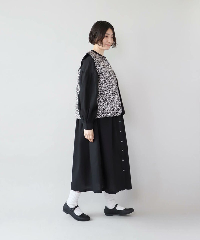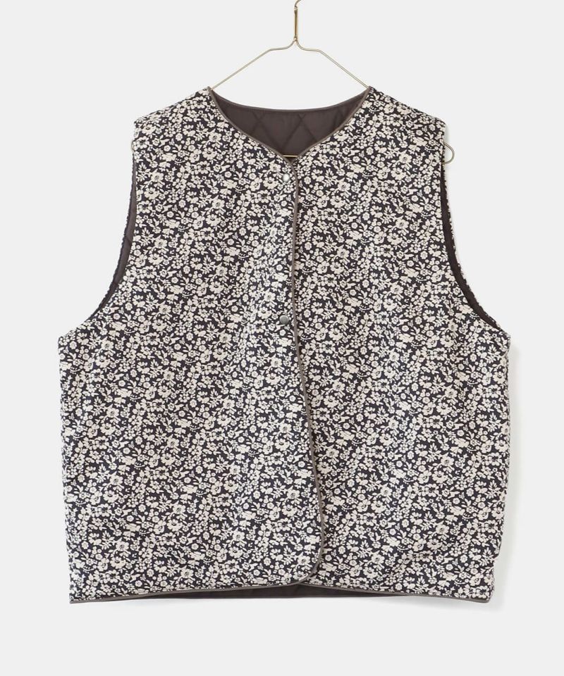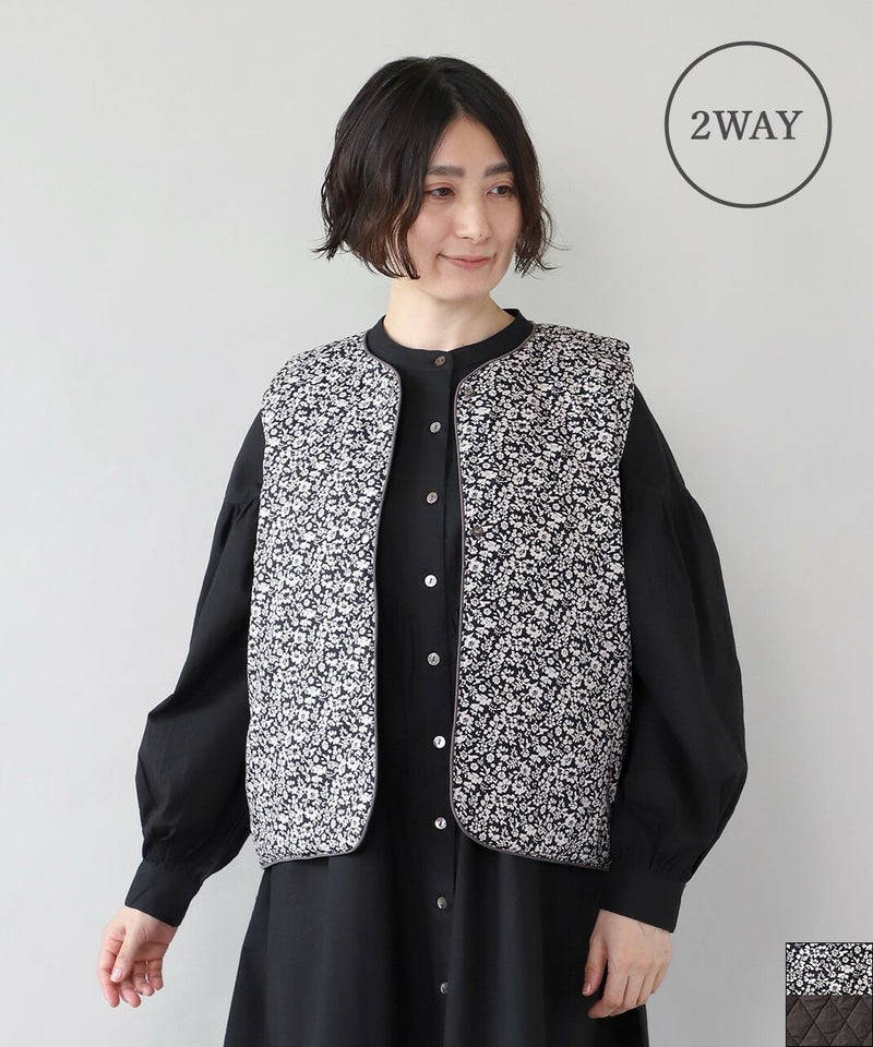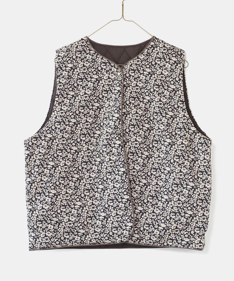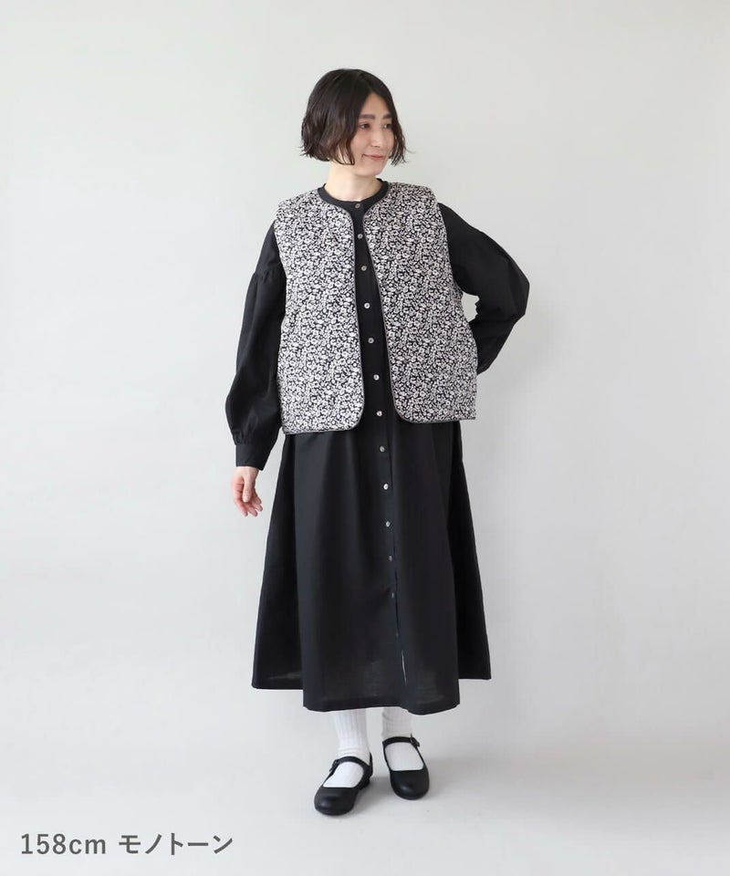 コットンブロード生地を使用した中綿リバーシブルベストです。 花柄と無地のリバーシブル仕様は、その日の気分で雰囲気をがらりと変えることが出来ます。シンプルなVネックにほどよいコンパクトなサイズ感ですっきりと仕上げました。やや広めのアームホールはインナーを問わずコーディネートの幅を広げてくれます。カットソーだけでなく、ワンピースとの合わせもおすすめです。