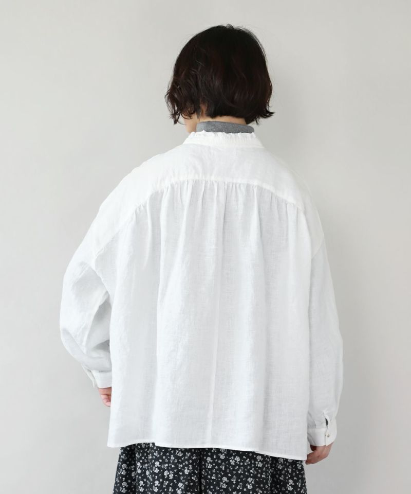 落ち感のあるリネン生地を使用したワイドフリルブラウスです。