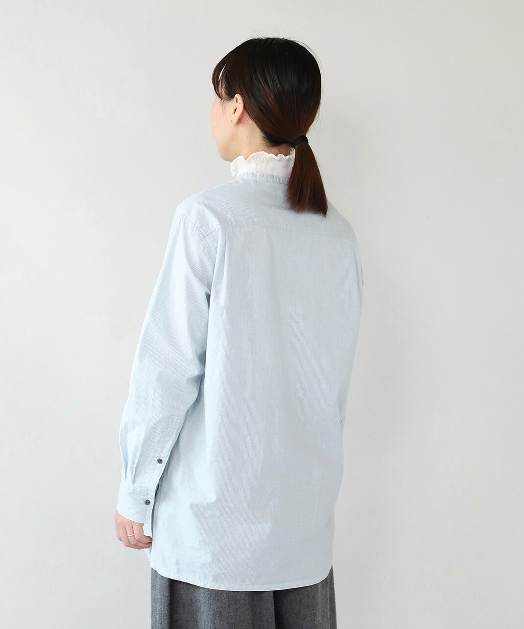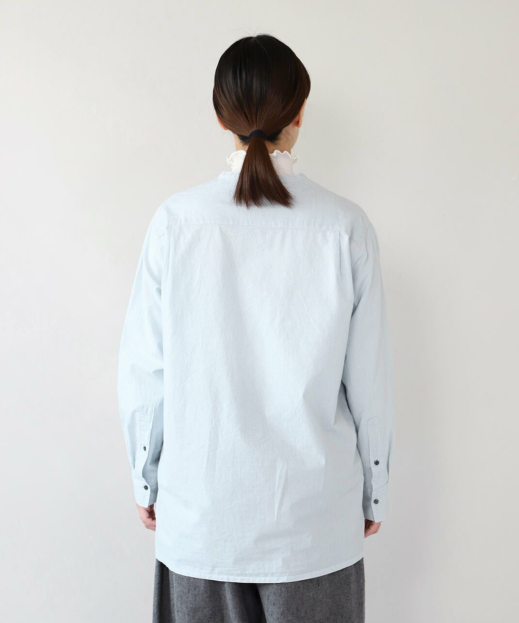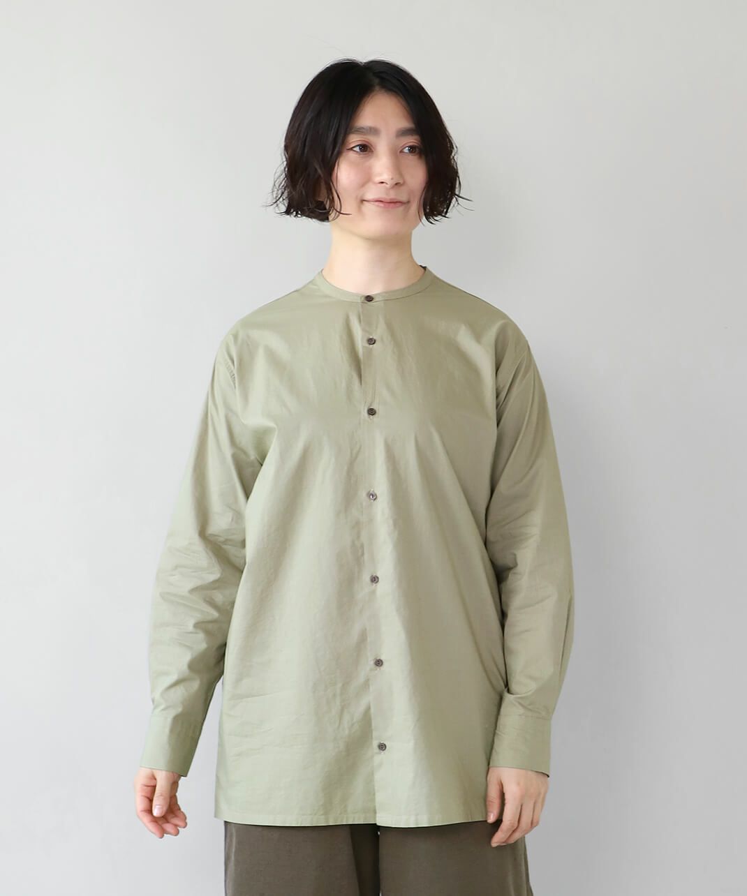やわらかなコットン生地のバンドカラーチュニックです。 シンプルな細めのバンドカラーにドロップショルダーで、すっきりとしながらもゆとりのある1着です。チュニック丈はレイヤーを楽しみながら、おしり周りもカバーしてくれます。両サイド裾のゆるやかなラウンドカット仕上げもポイントです。1枚持っておけば、定番として一年中着用できます。
