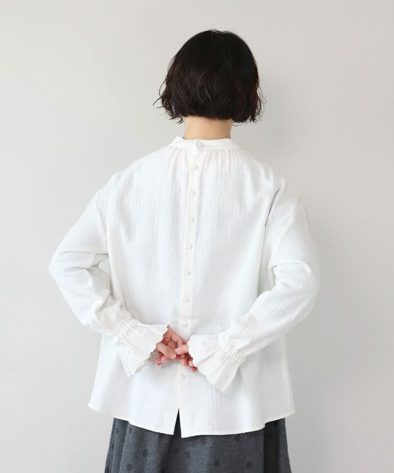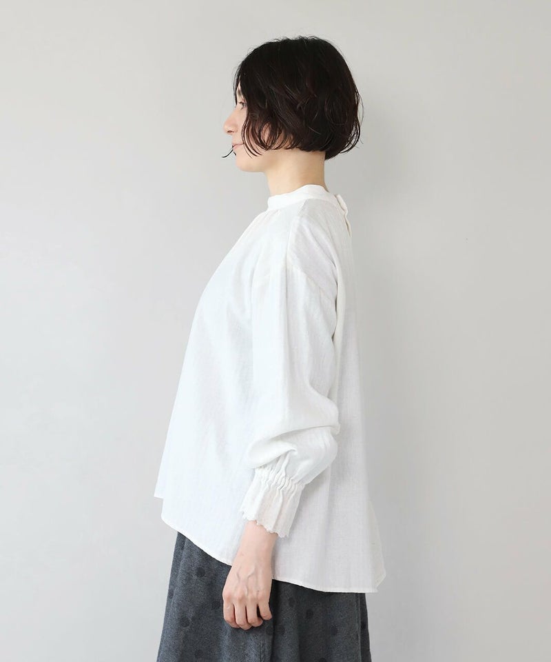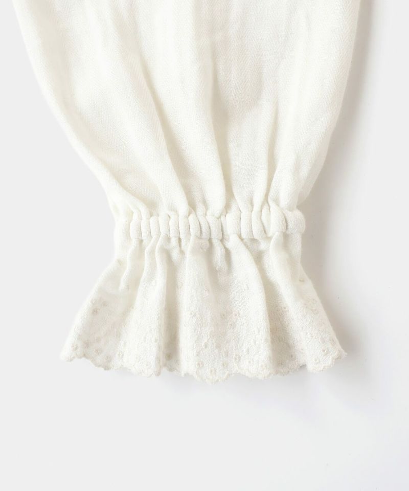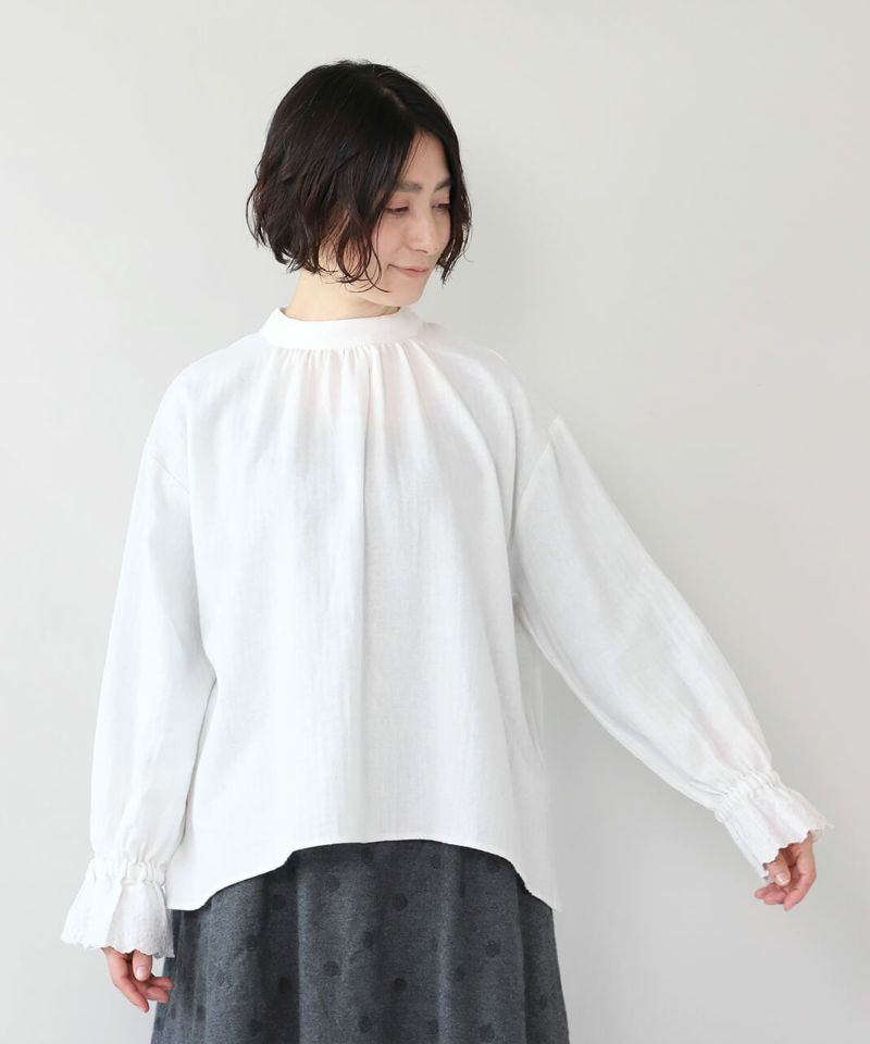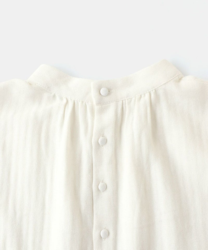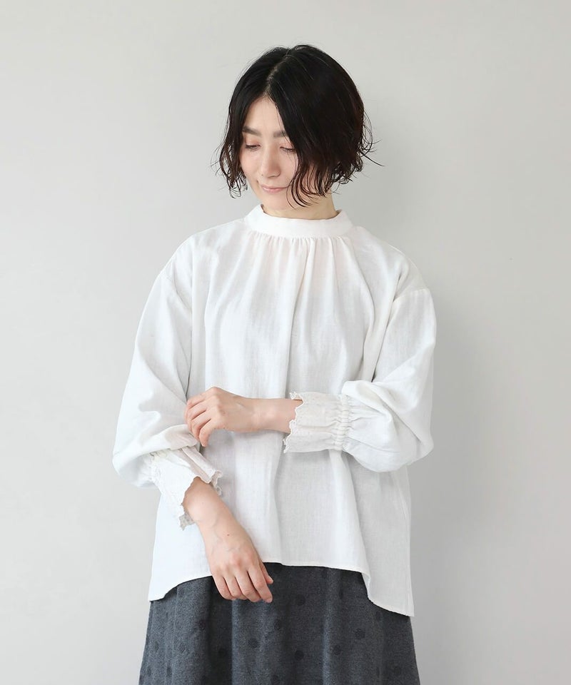 肌触りの良いコットンリネンをヘリンボーンに仕上げたブラウスです。 低めのハイネックとギャザーがつくるシンプルでスタイリッシュな印象に。袖口の刺繍レースとキャンディースリーブで甘くナチュラルな雰囲気がプラス。背中のくるみボタンも可愛らしさが加わります。袖口にはゴムが入っているので、袖の見え方も楽しめます。甘い雰囲気が苦手な方でもシンプルに取り入れやすい1枚です。