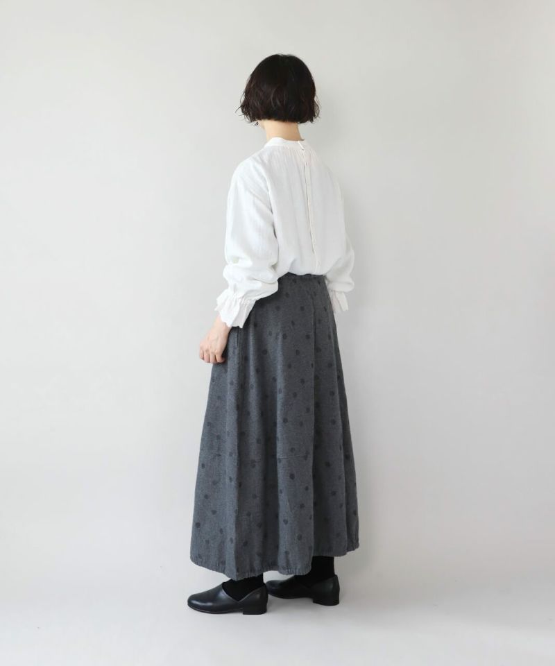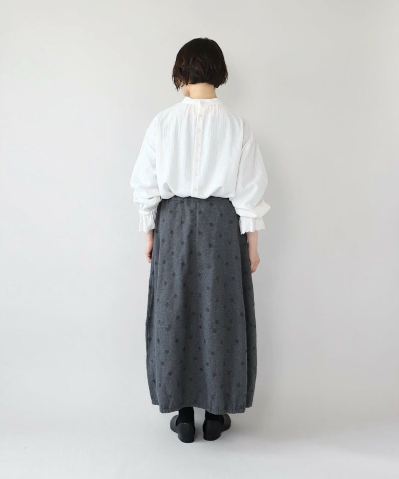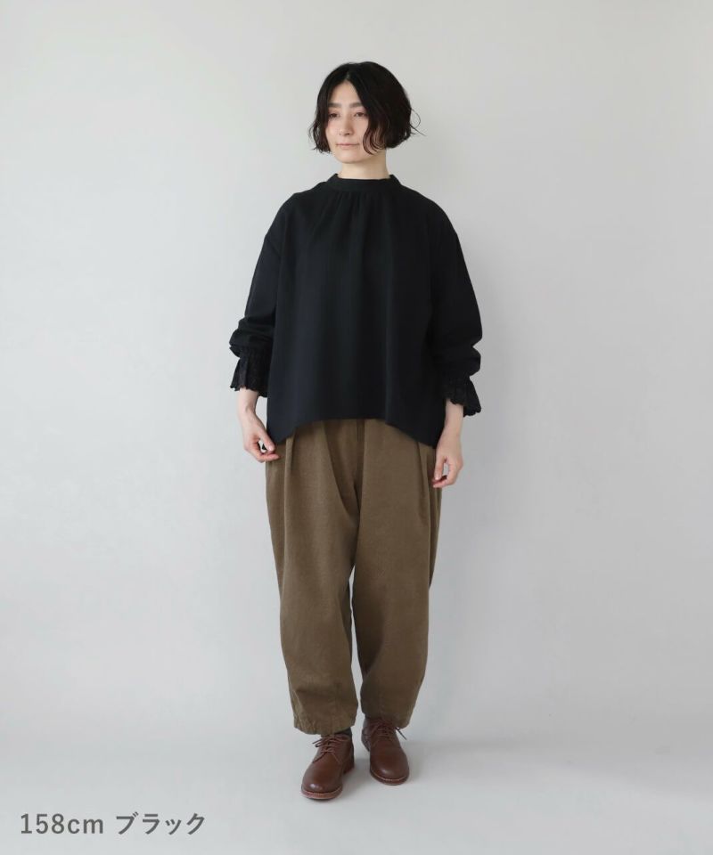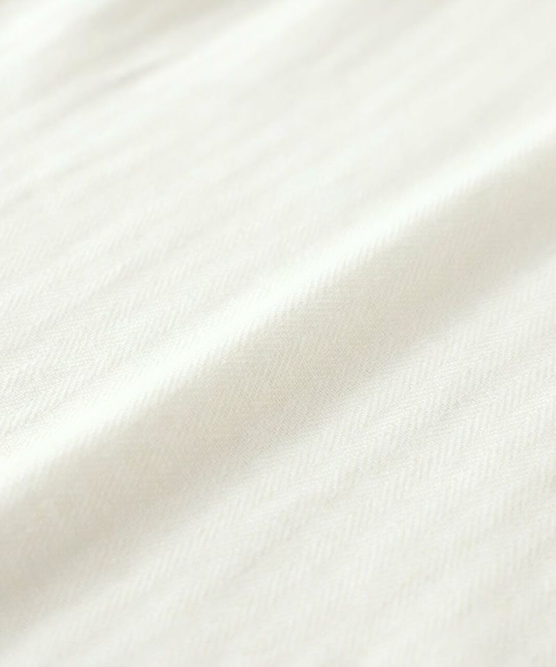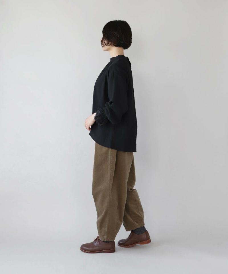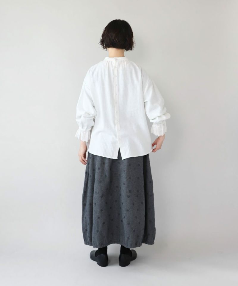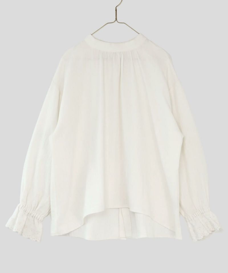 肌触りの良いコットンリネンをヘリンボーンに仕上げたブラウスです。 低めのハイネックとギャザーがつくるシンプルでスタイリッシュな印象に。袖口の刺繍レースとキャンディースリーブで甘くナチュラルな雰囲気がプラス。背中のくるみボタンも可愛らしさが加わります。袖口にはゴムが入っているので、袖の見え方も楽しめます。甘い雰囲気が苦手な方でもシンプルに取り入れやすい1枚です。