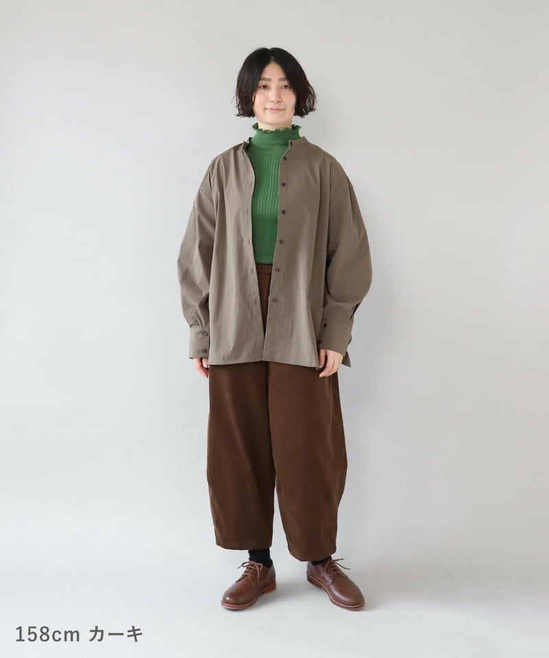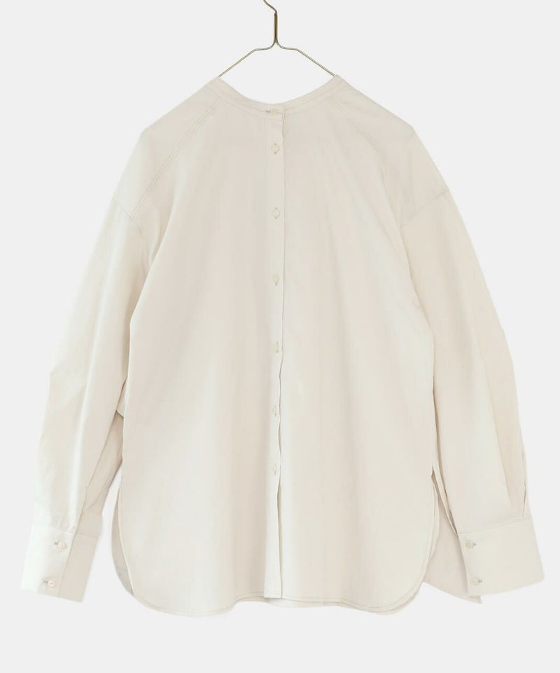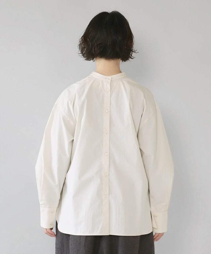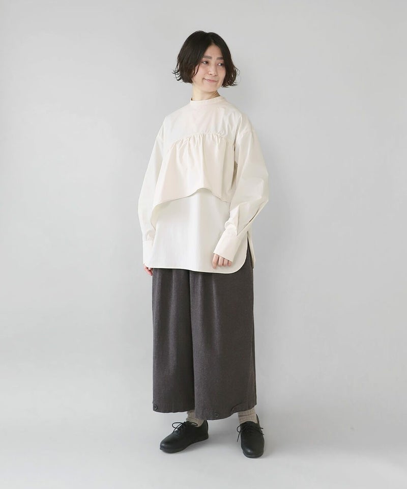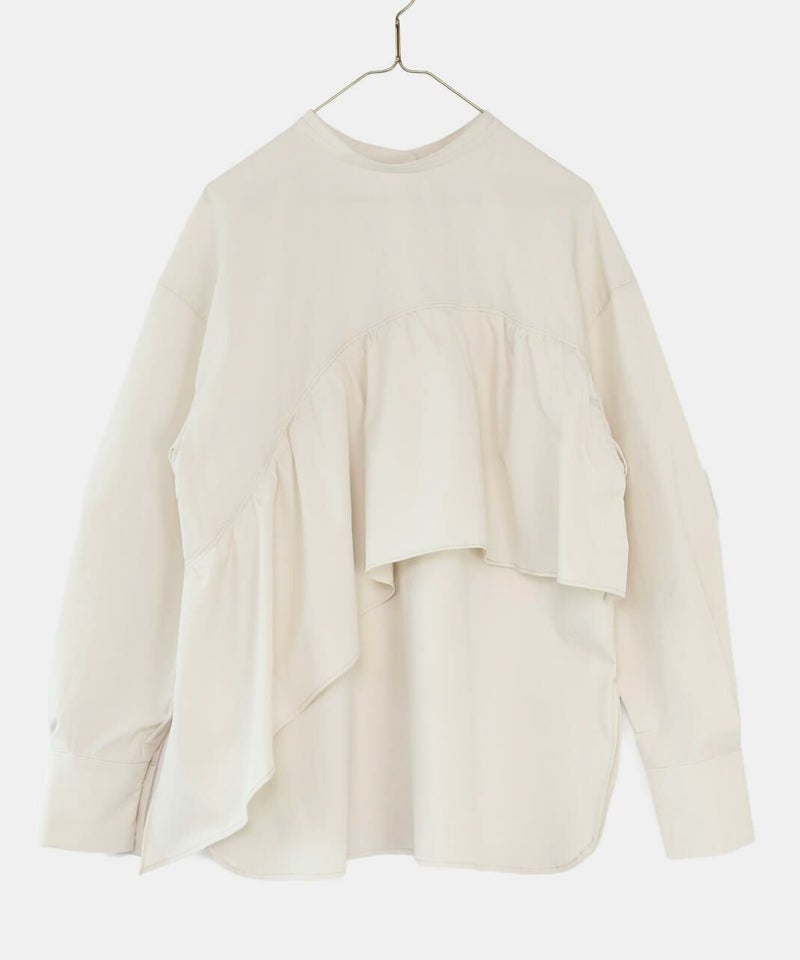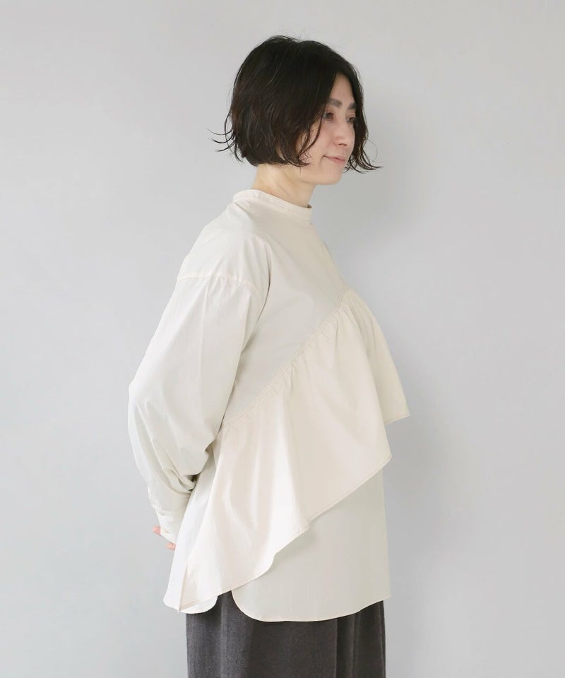 コットンのような風合いのポリエステルブロード素材を使用した前後2WAYブラウスです。 華やかなアシンメトリーフリルデザインと、シンプルなバンドカラーのデザインの前後2WAY仕様。袖のタックがきれいなシルエットをプラスしてくてれいます。 サイズは少しゆったりとして、リラックスした着心地です。その日の気分で雰囲気を変えることが出来る1着です。