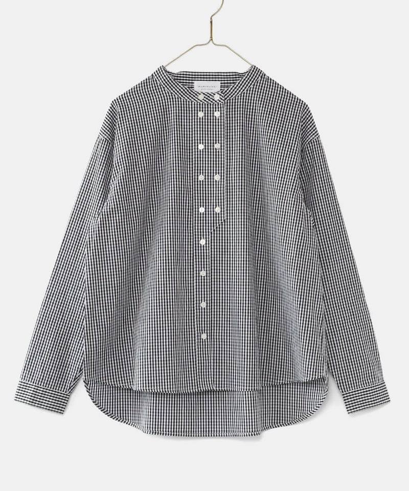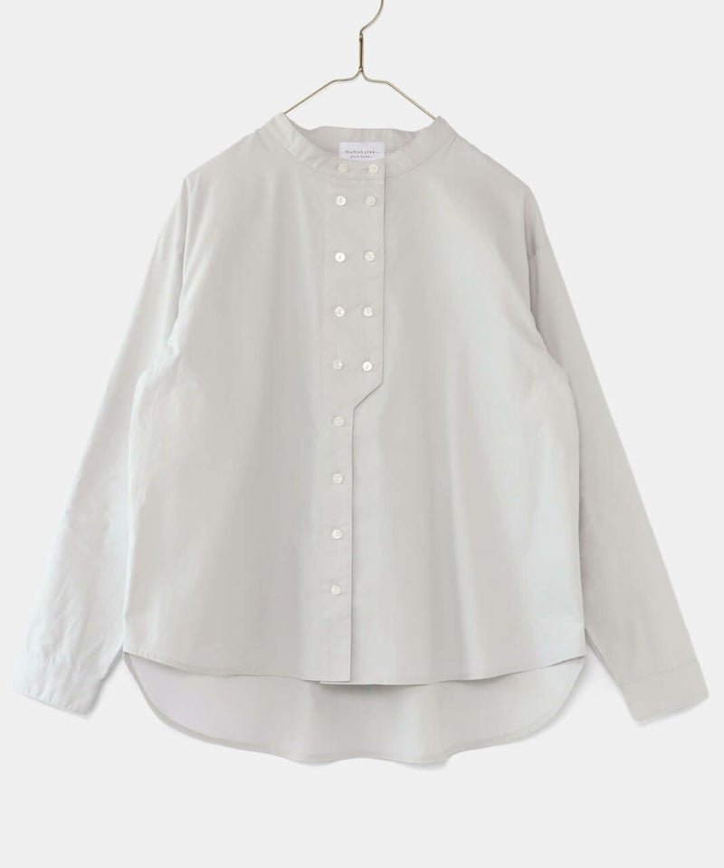 ダブルボタンデザインのバンドカラーの長袖シャツです。