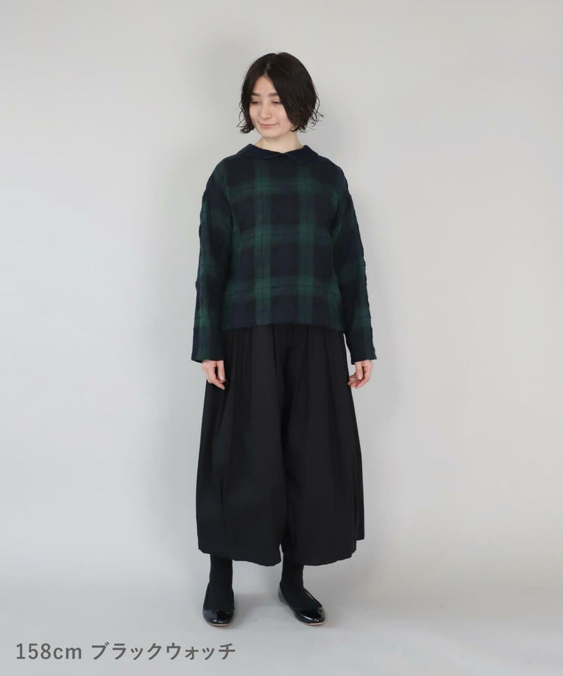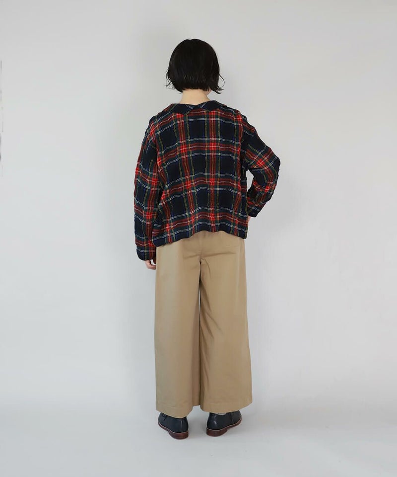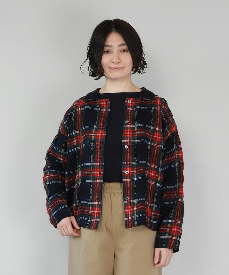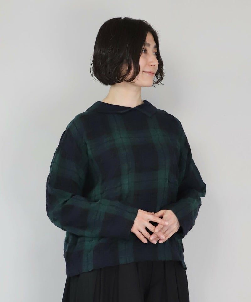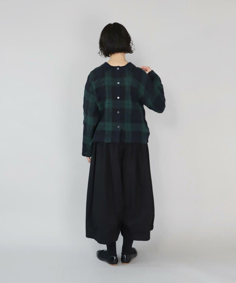 コットンのやさしい肌触りにウールのあたたかみをプラスした季節感のある1着です。生地表面の凹凸と落ち着いたチェック柄が上品でナチュラルな雰囲気を演出してくれます。ボタンを前にして羽織りとしても、後ろにしてすっきりとしたプルオーバー風にも着用できる2WAY仕様。その日の気分に合わせてスタイリングを変えられます。
