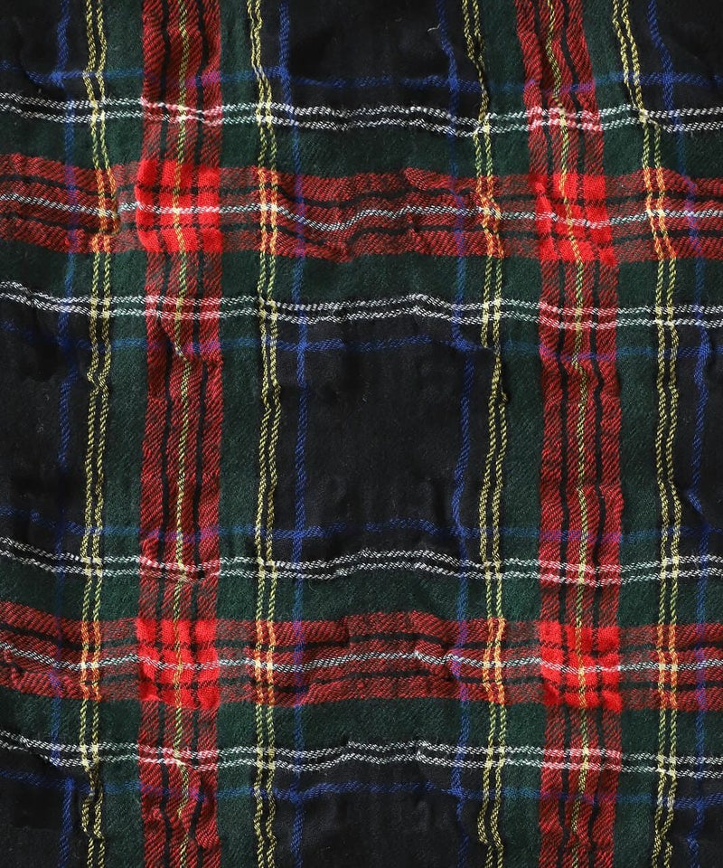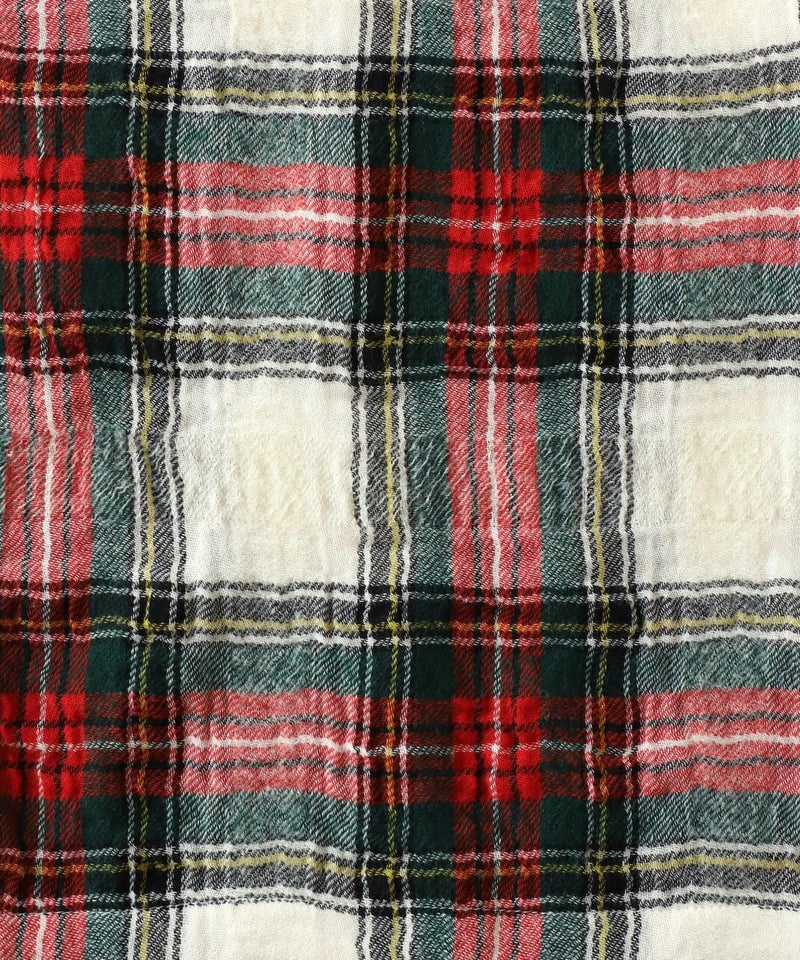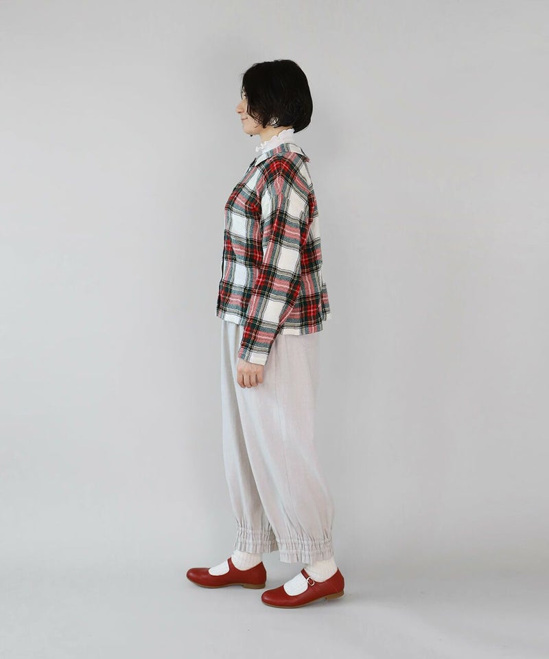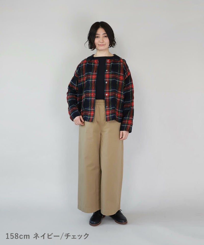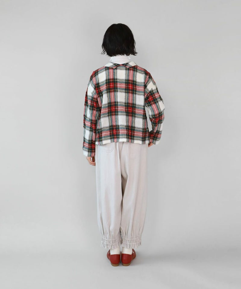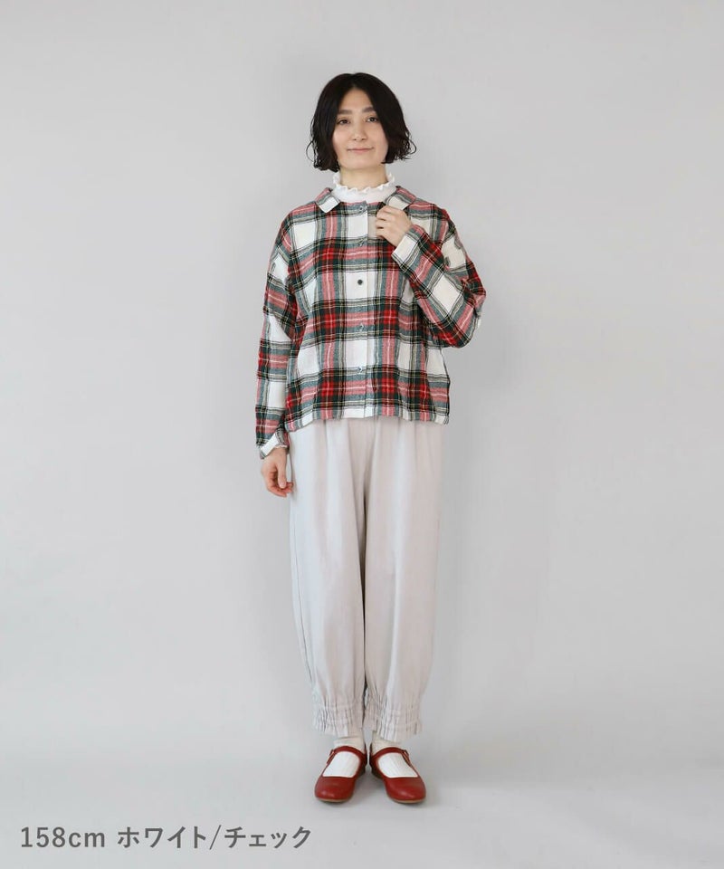 コットンのやさしい肌触りにウールのあたたかみをプラスした季節感のある1着です。生地表面の凹凸と落ち着いたチェック柄が上品でナチュラルな雰囲気を演出してくれます。ボタンを前にして羽織りとしても、後ろにしてすっきりとしたプルオーバー風にも着用できる2WAY仕様。その日の気分に合わせてスタイリングを変えられます。
