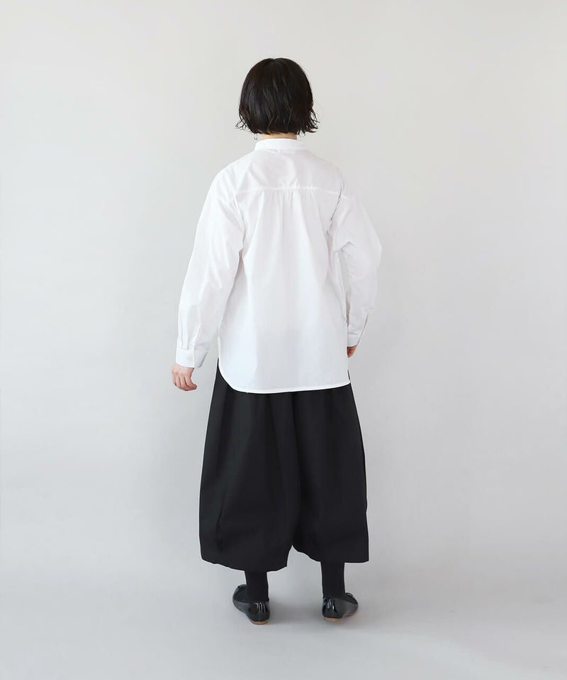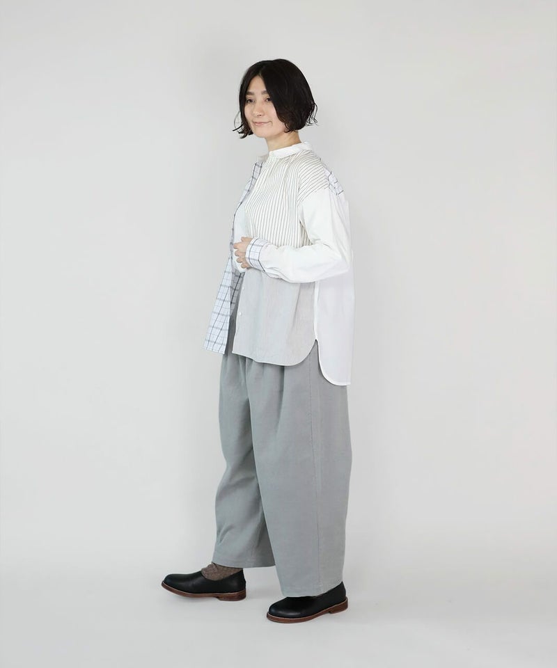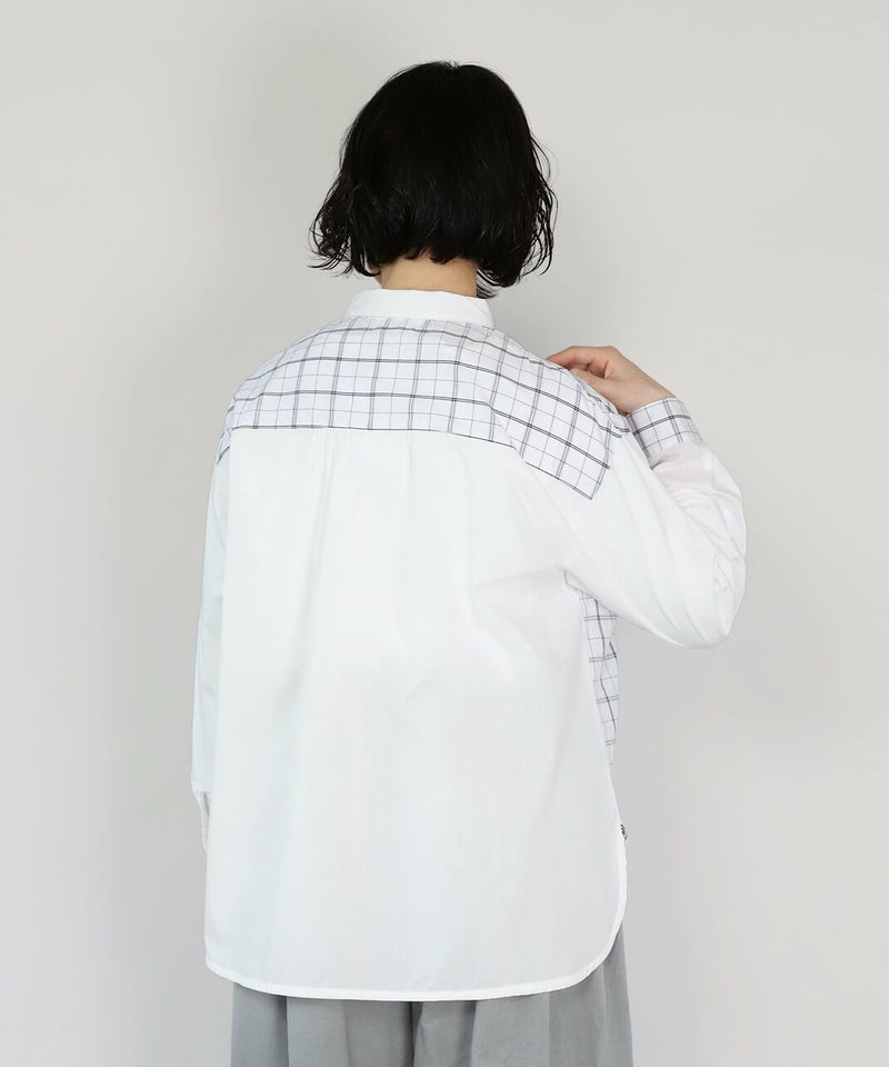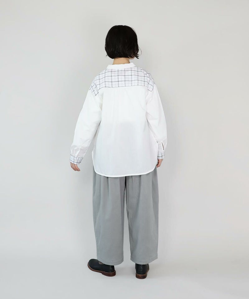 やわらかくなじみやすい先染めコットン生地のブラウスです。フロントの大胆なパッチワークが個性的で目を惹くデザインです。襟周りや後ろにギャザーを施し、ゆったりとしたシルエットに。裾は前後差をつけたラウンドヘムで、気になるラインをさりげなくカバーしてくれます。ブラウスとしてはもちろん、ボタンを開けて軽い羽織りとして重ね着もおすすめです。