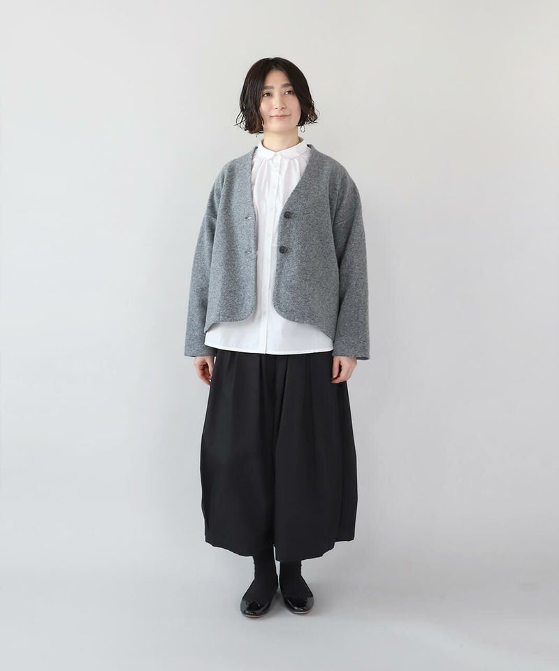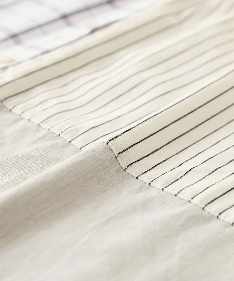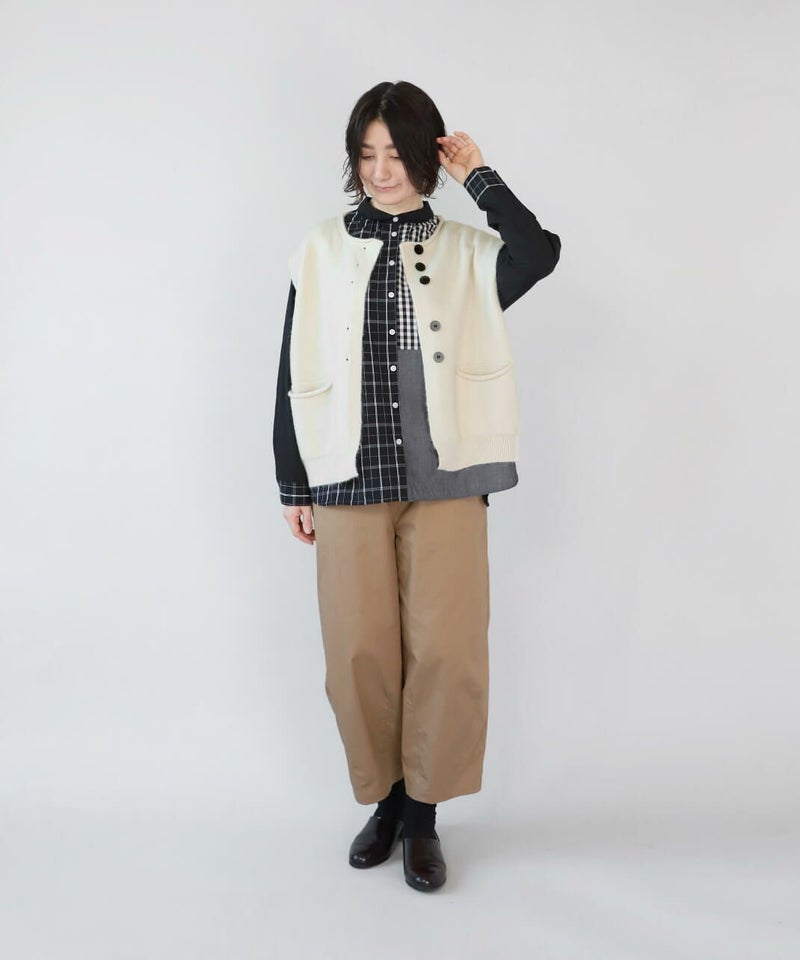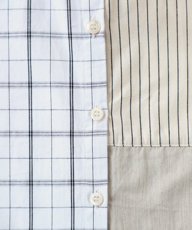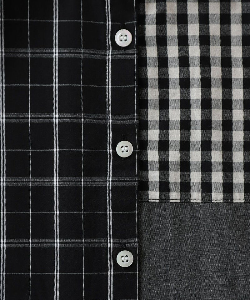 やわらかくなじみやすい先染めコットン生地のブラウスです。フロントの大胆なパッチワークが個性的で目を惹くデザインです。襟周りや後ろにギャザーを施し、ゆったりとしたシルエットに。裾は前後差をつけたラウンドヘムで、気になるラインをさりげなくカバーしてくれます。ブラウスとしてはもちろん、ボタンを開けて軽い羽織りとして重ね着もおすすめです。