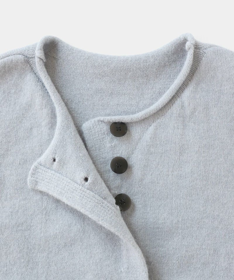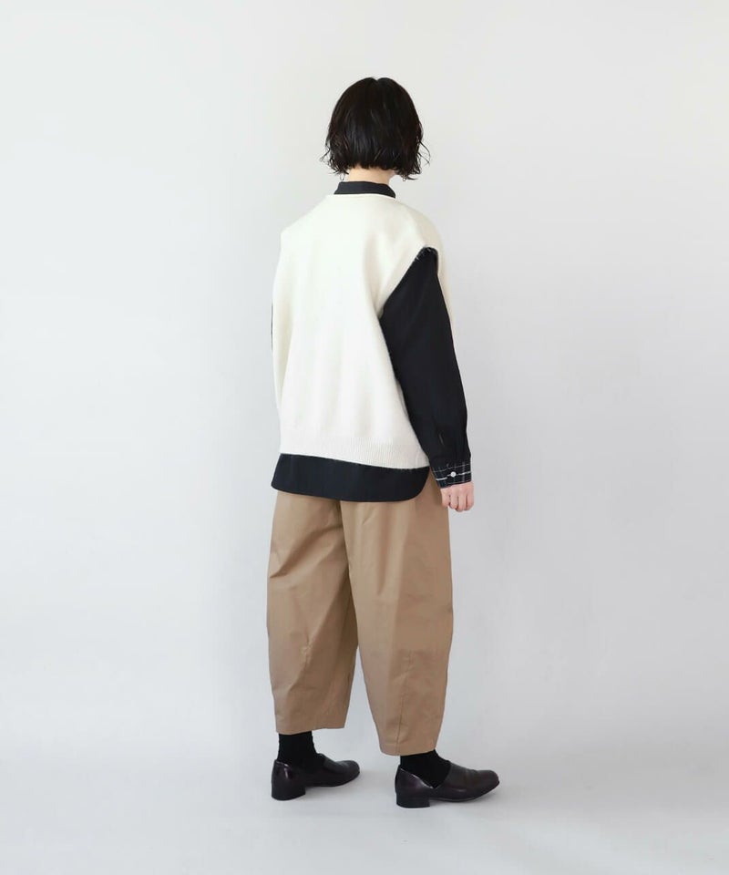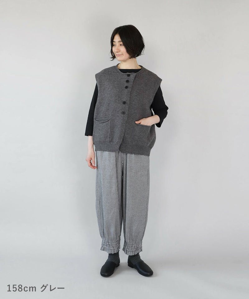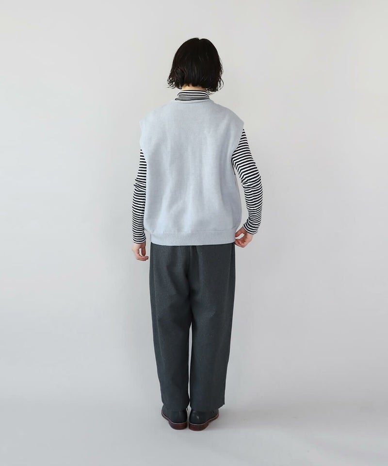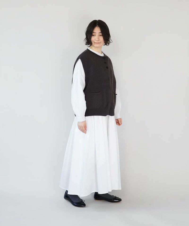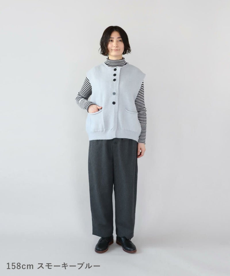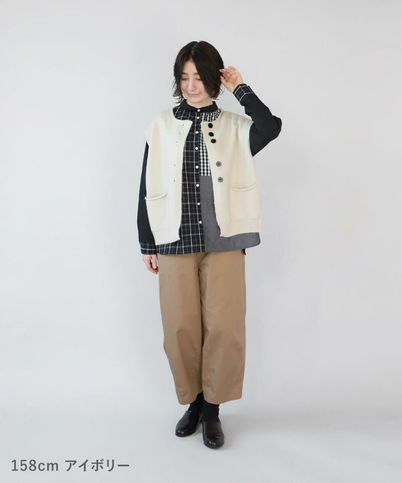 やや厚めのアクリルニットのあたたかいベストです。首周りと2つのポケットは、ニットの特性を活かしたロール仕立てで可愛らしさを演出してくれます。クルーネックにややゆったりとしたボックスシルエットでリラックスした着心地です。カットソーやブラウスはもちろん、ワンピースなどとも合わせやすく、春先まで長い期間着用できます。