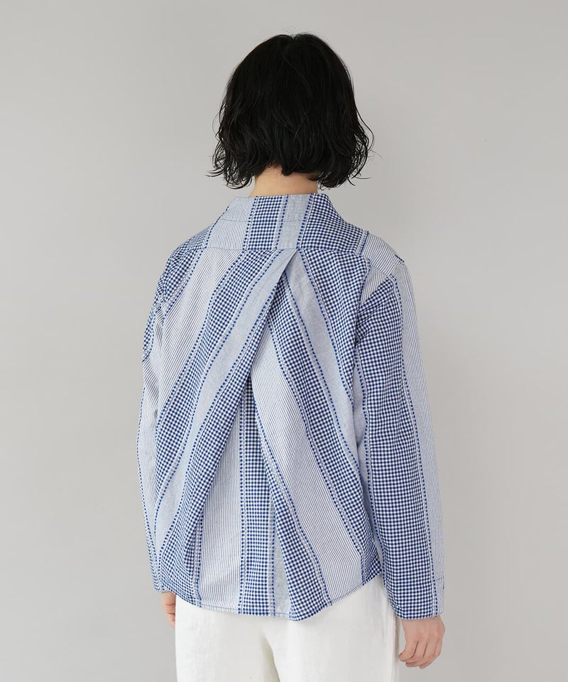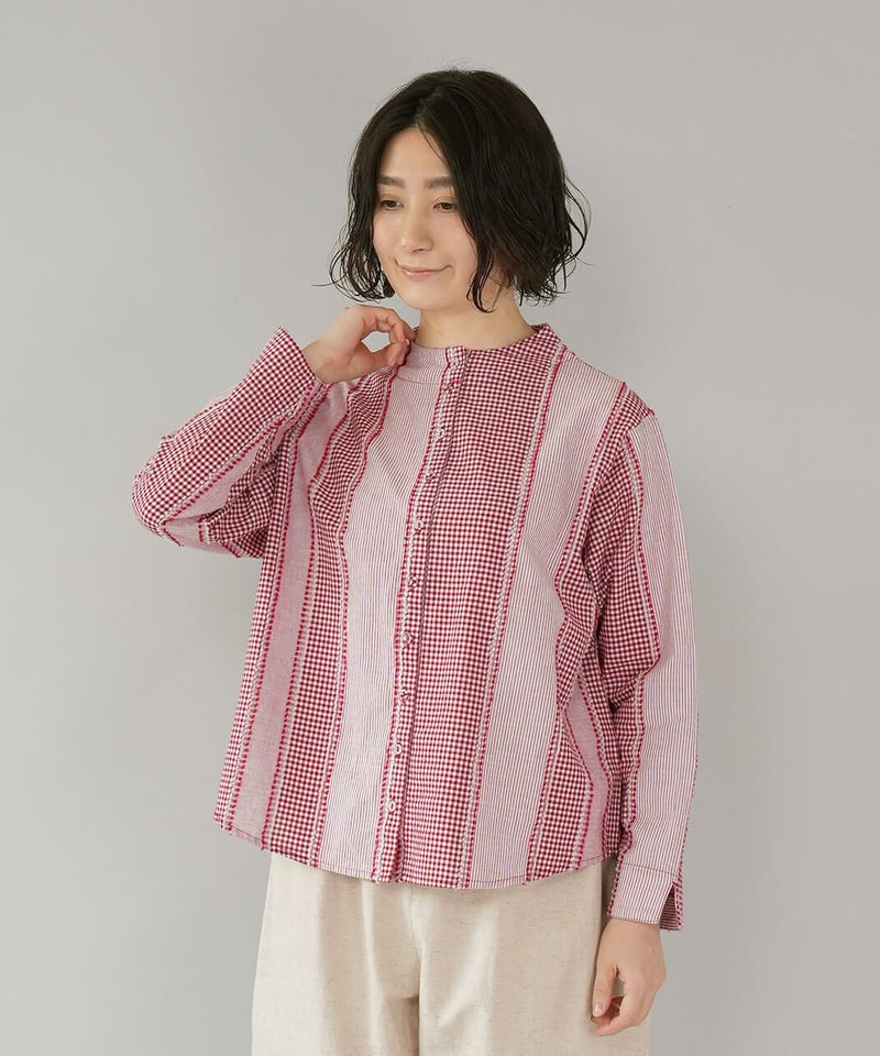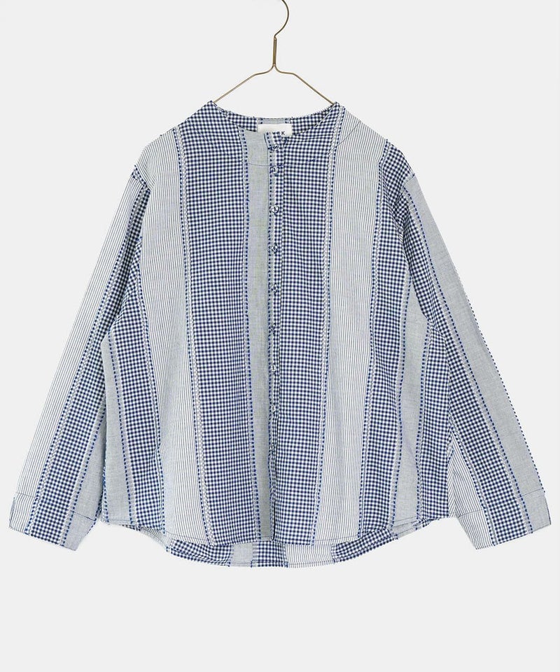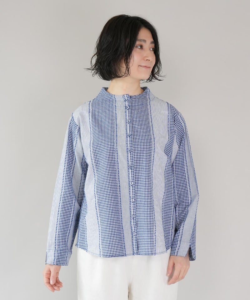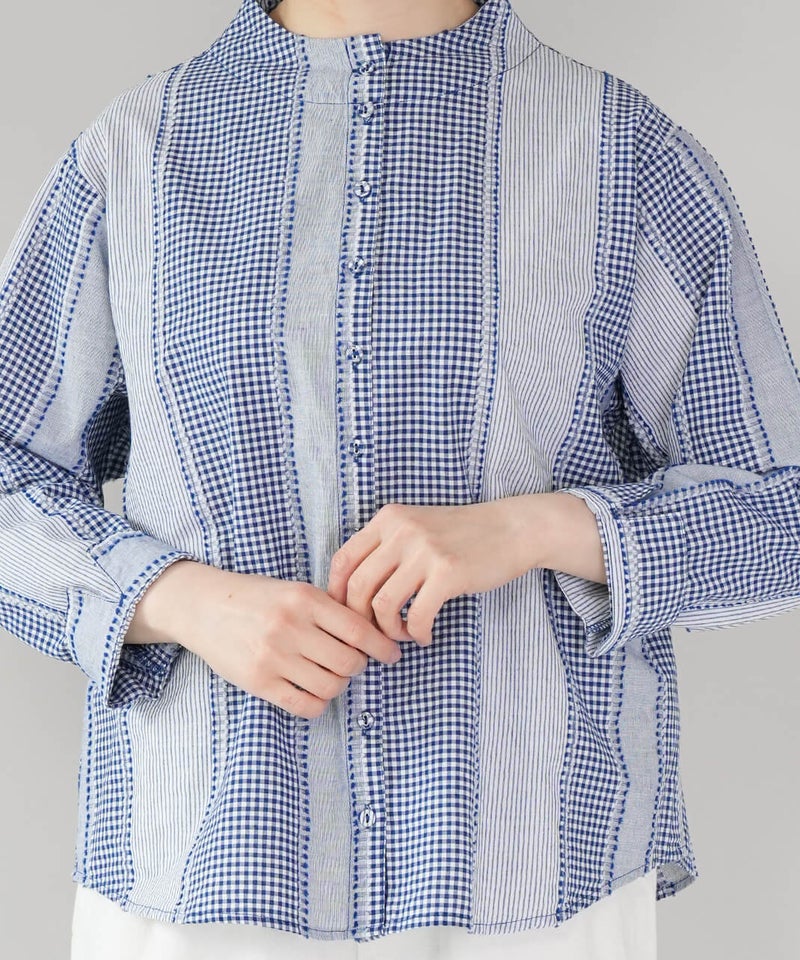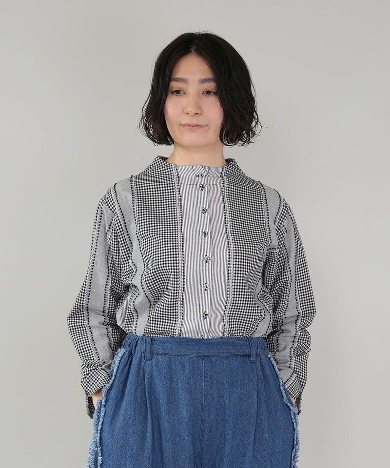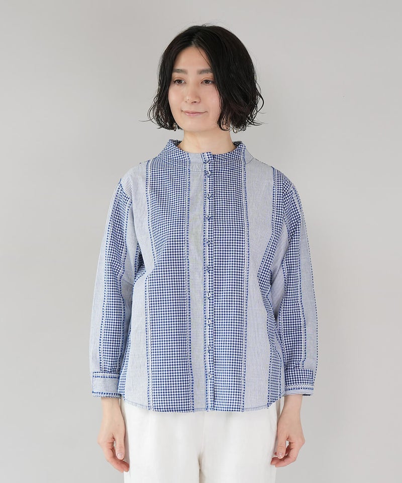 ギンガムチェック、ストライプ、無地柄がパッチワーク風にデザインされたコットンブラウスです。柄の繋ぎ目には糸の端を立体的にあしらい、ガンジーネックにバッククロスのタック切替えが施された、細部までこだわりの詰まった1着です。ややゆとりのあるシルエットでリラックスした着心地で、ブラウスとしてはもちろん、軽い羽織りとしてもおすすめです。