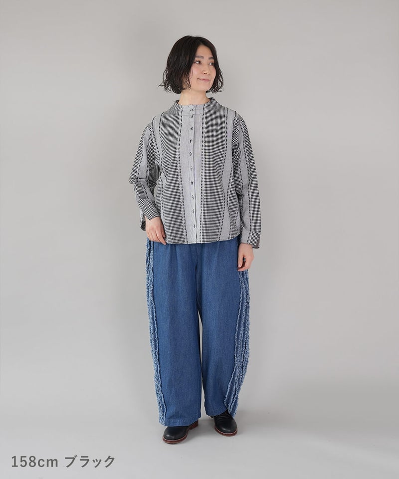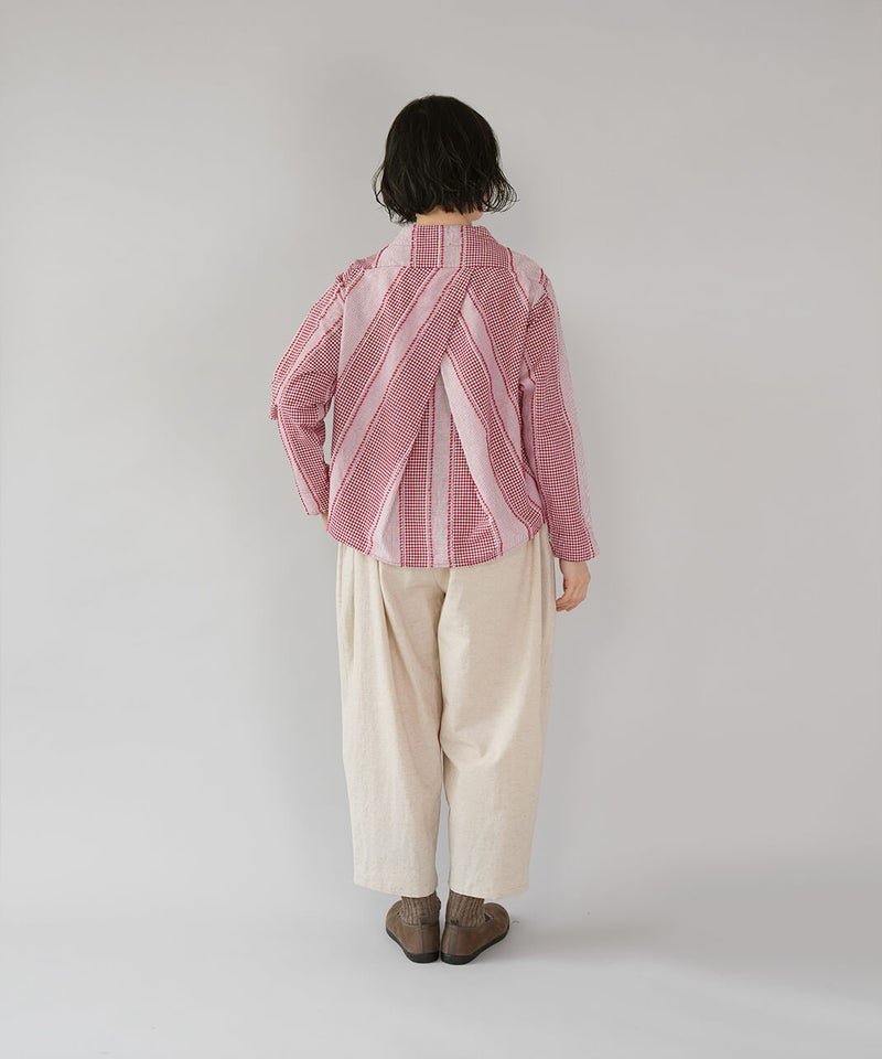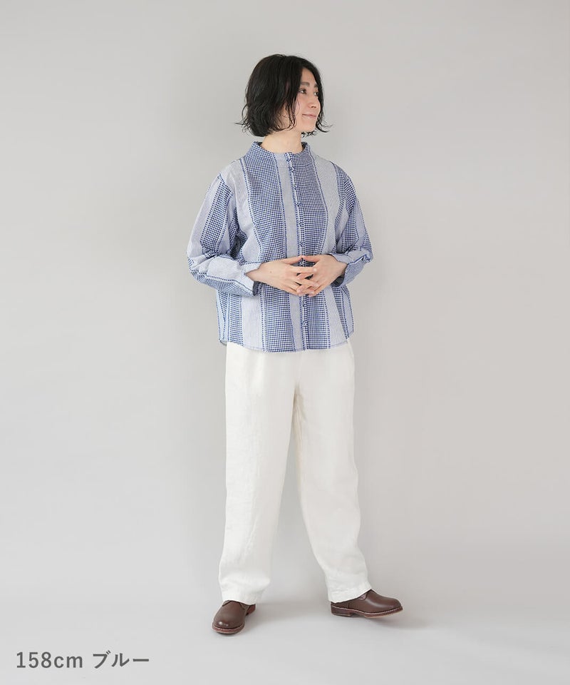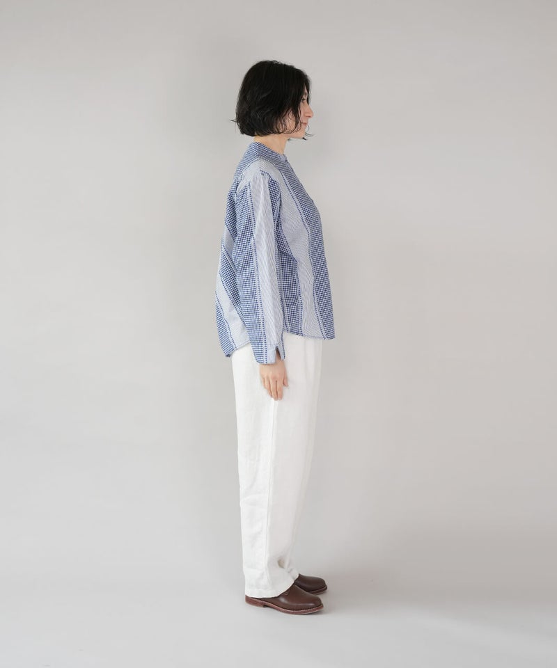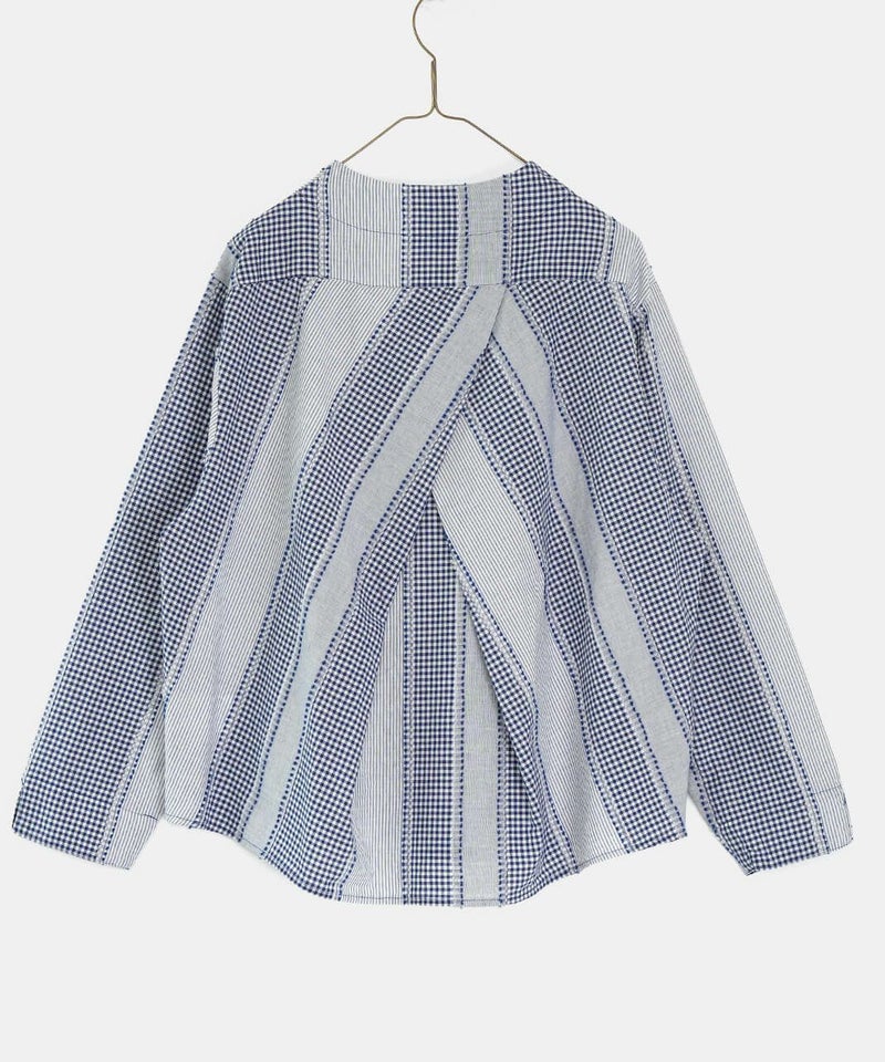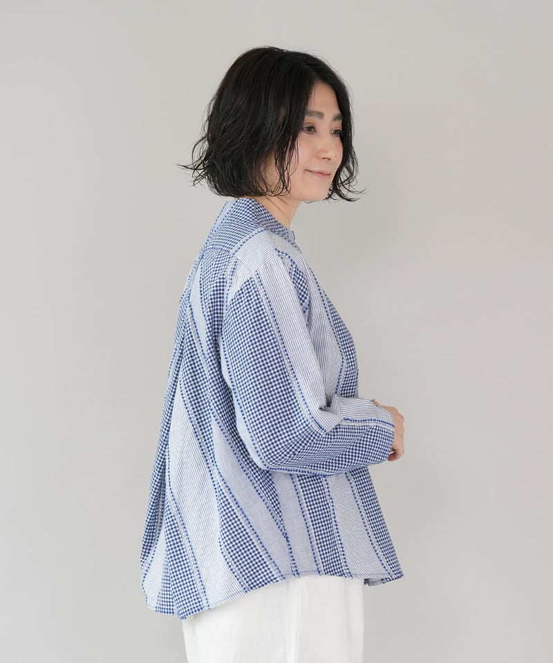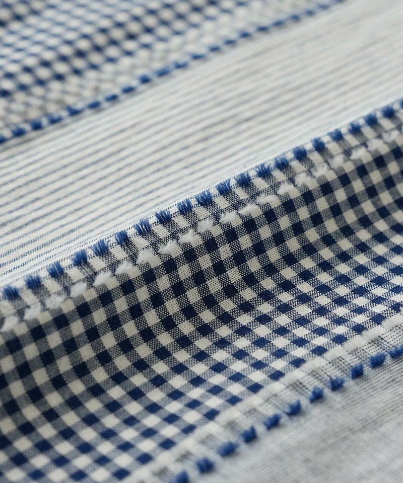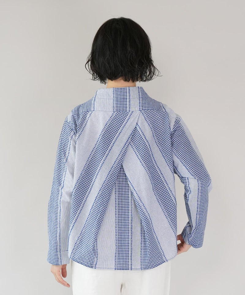 ギンガムチェック、ストライプ、無地柄がパッチワーク風にデザインされたコットンブラウスです。柄の繋ぎ目には糸の端を立体的にあしらい、ガンジーネックにバッククロスのタック切替えが施された、細部までこだわりの詰まった1着です。ややゆとりのあるシルエットでリラックスした着心地で、ブラウスとしてはもちろん、軽い羽織りとしてもおすすめです。