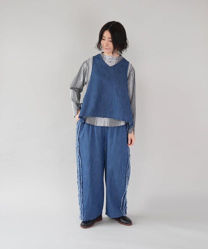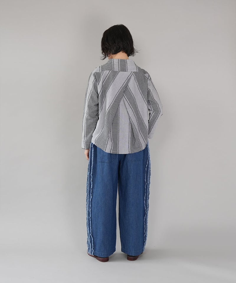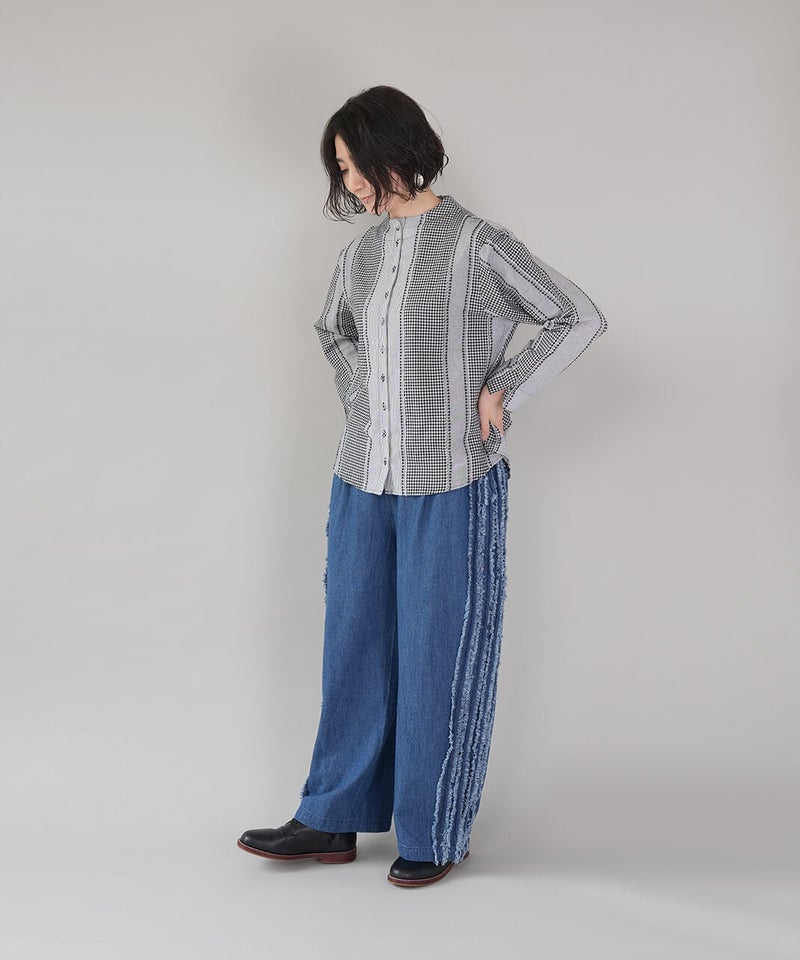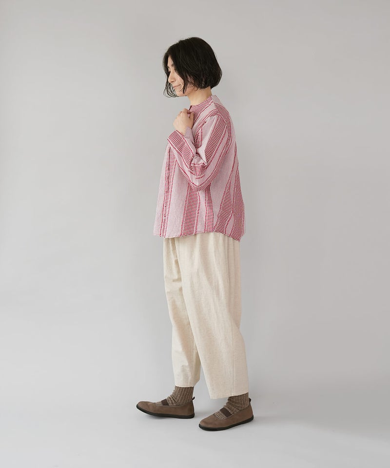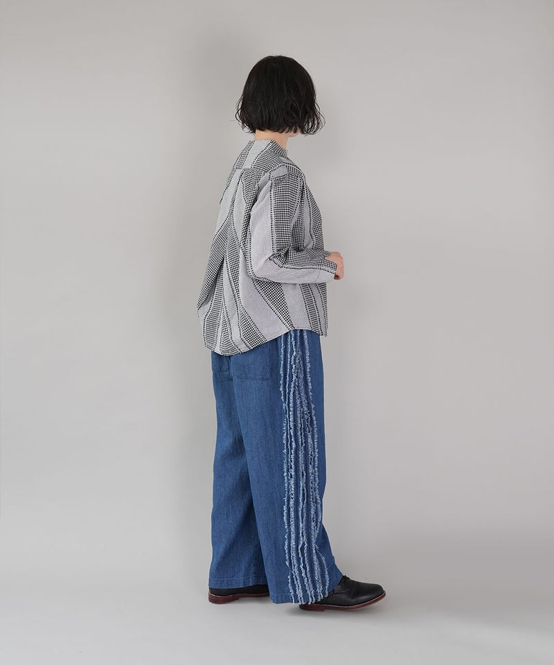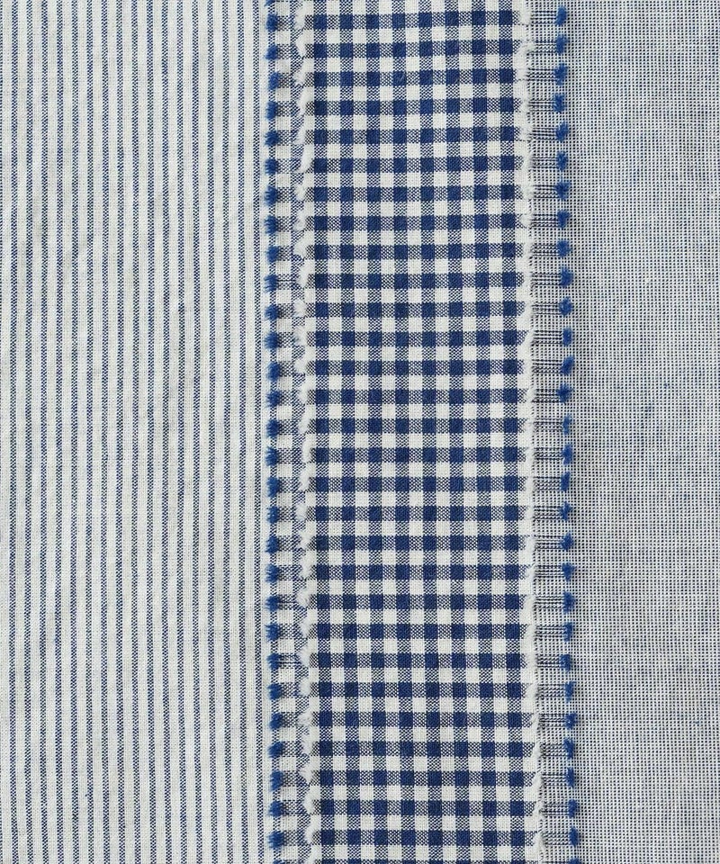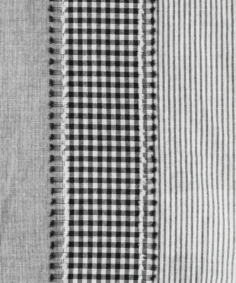 ギンガムチェック、ストライプ、無地柄がパッチワーク風にデザインされたコットンブラウスです。柄の繋ぎ目には糸の端を立体的にあしらい、ガンジーネックにバッククロスのタック切替えが施された、細部までこだわりの詰まった1着です。ややゆとりのあるシルエットでリラックスした着心地で、ブラウスとしてはもちろん、軽い羽織りとしてもおすすめです。