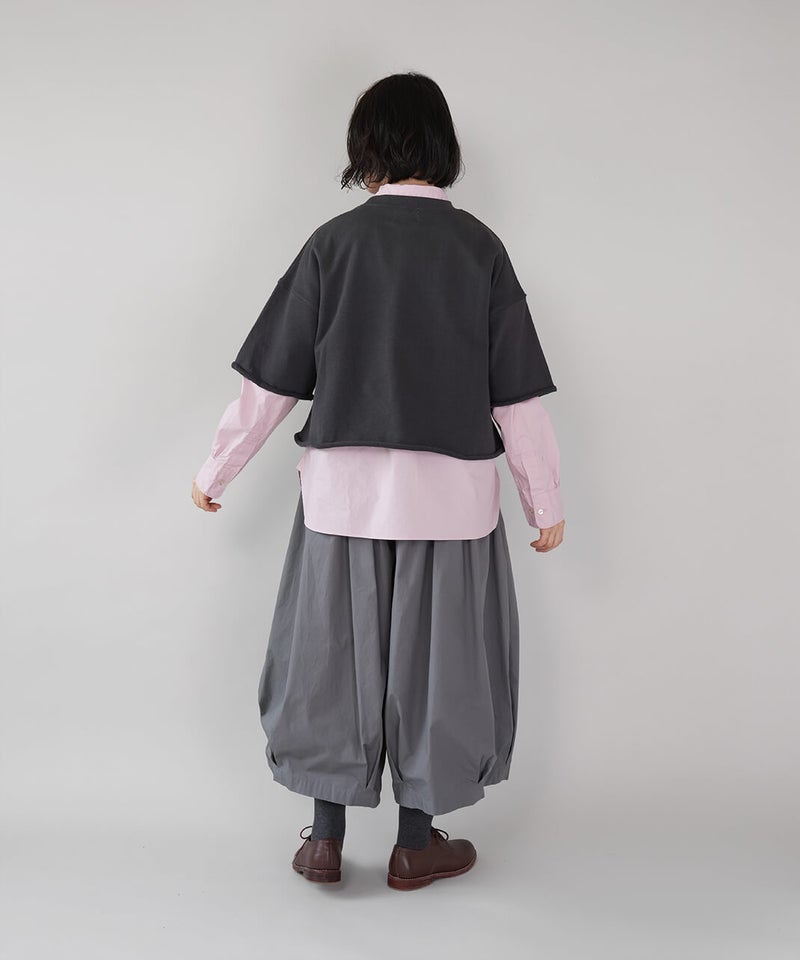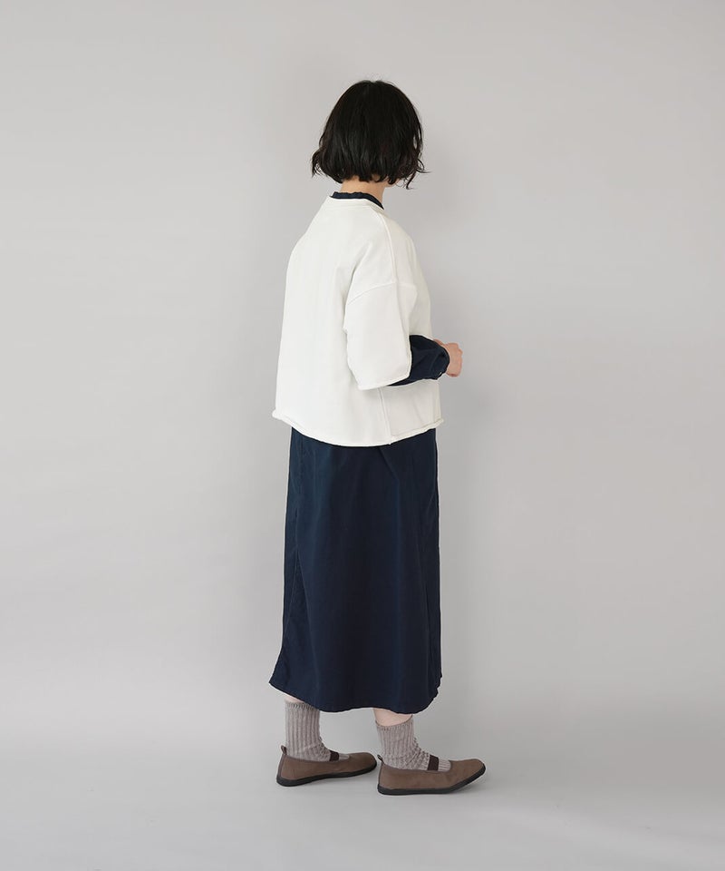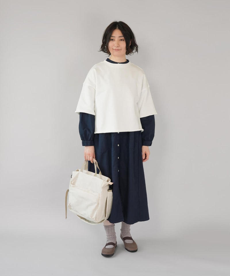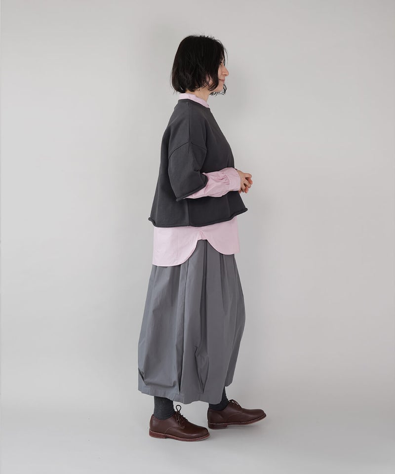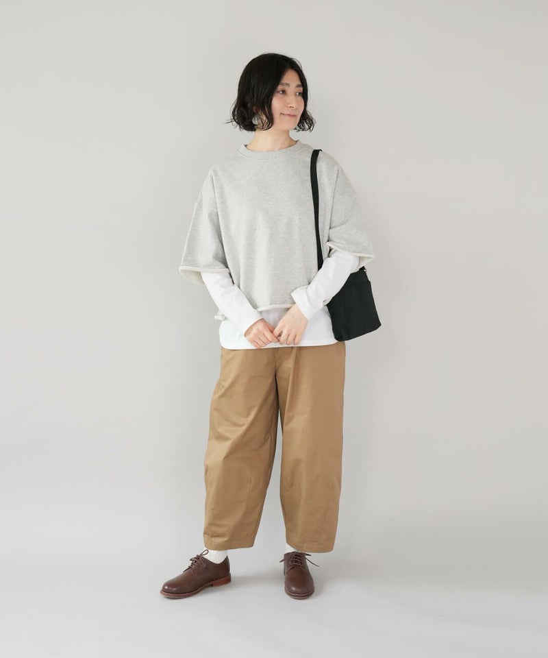ワイドシルエットの身幅は身体のラインを拾いにくくリラックス感のある着心地です。