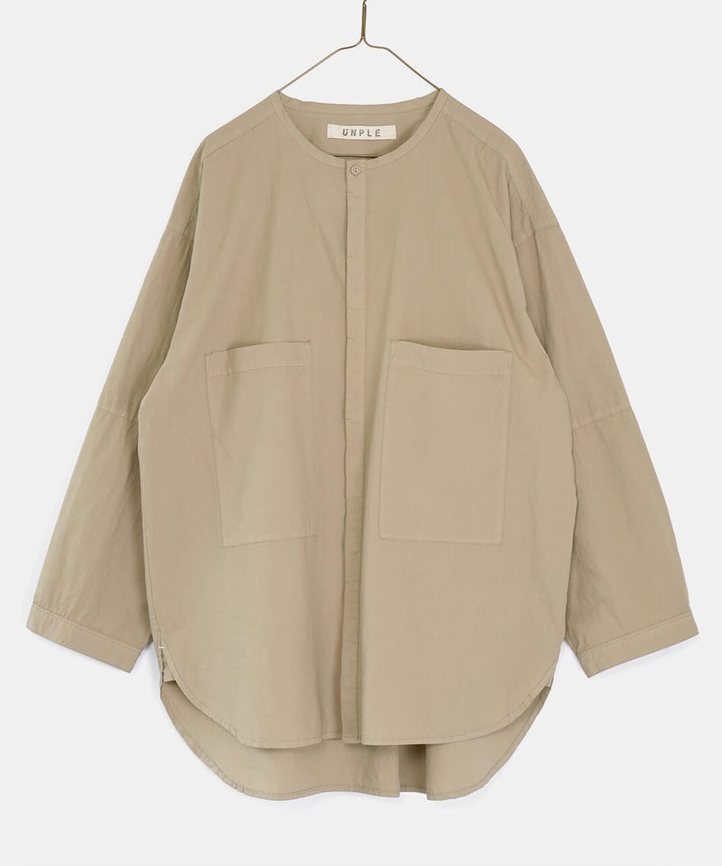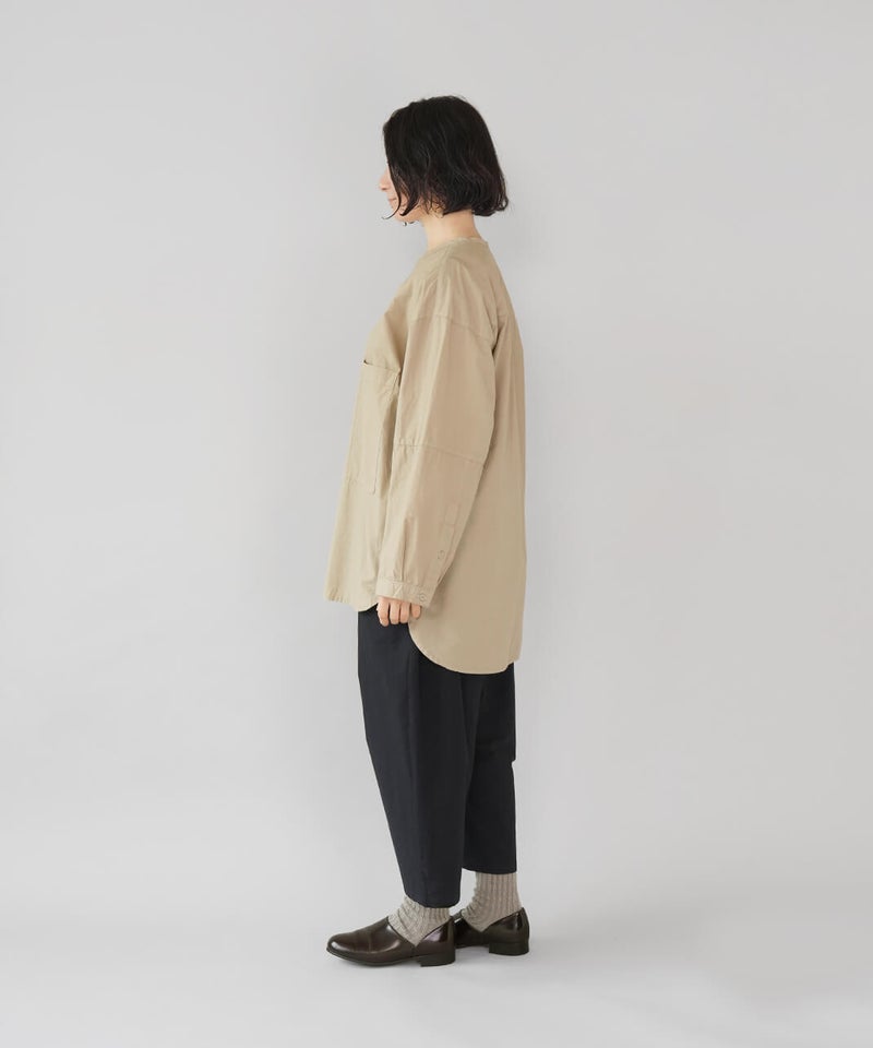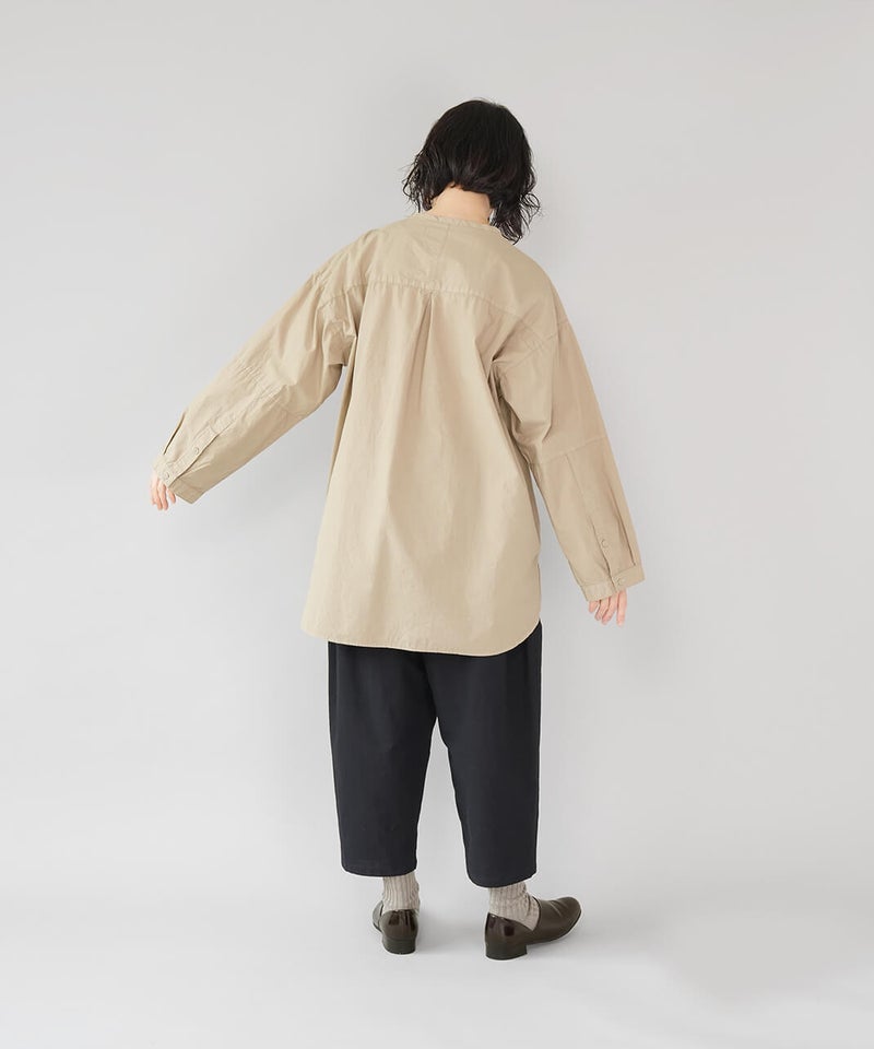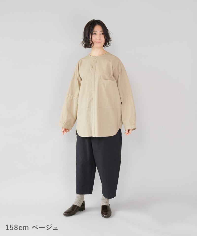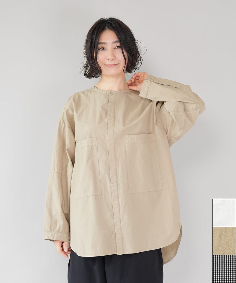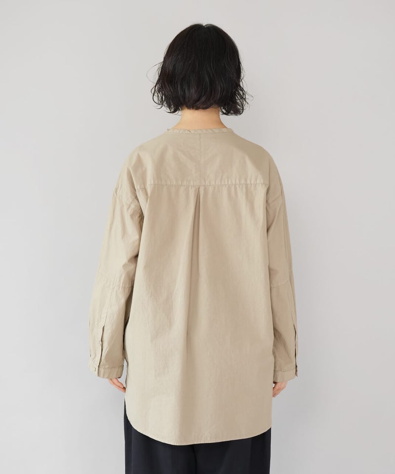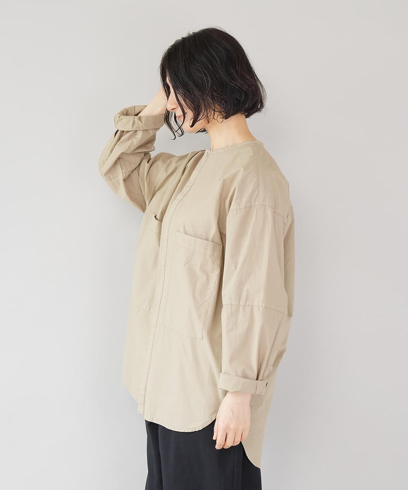 薄手のコットン生地に洗い加工の風合いが施されたロングシャツです。シンプルなノーカラーに比翼仕立てですっきりとした仕上がり。大きめのポケットにゆったりとしたシルエットでリラックスした着心地です。メンズでも着用できるユニセックスなデザインで、袖口を折り返してラフなスタイリングもおすすめです。シャツとしてはもちろん、羽織りとしても着用可能です。