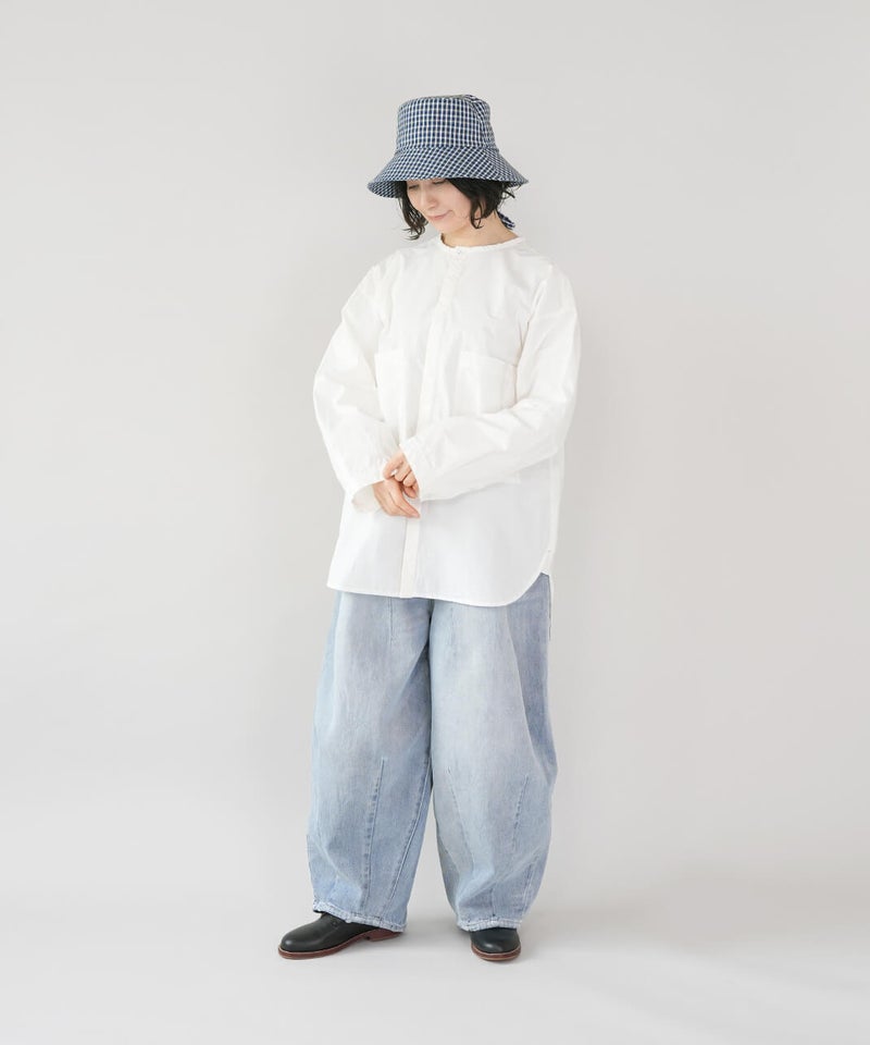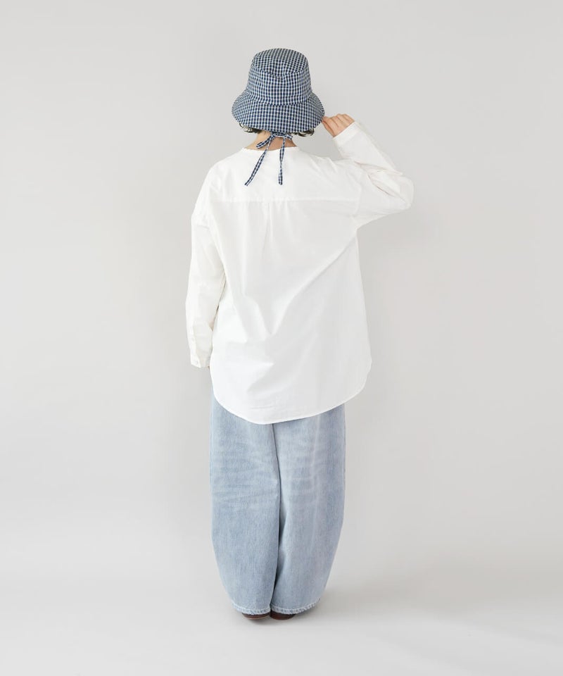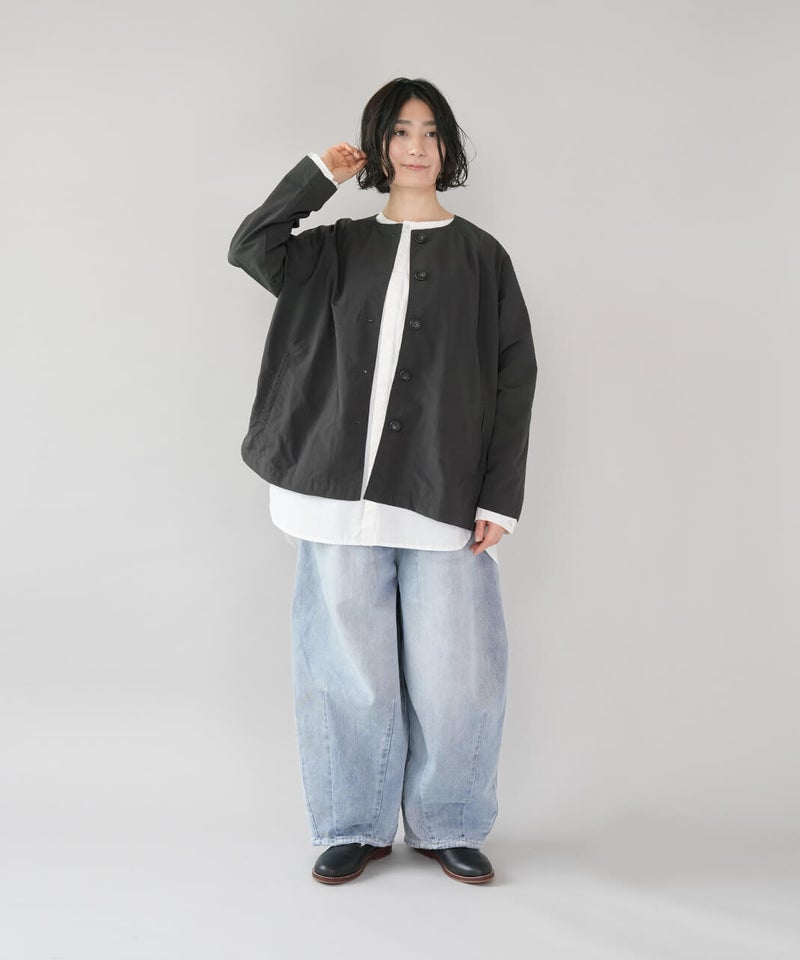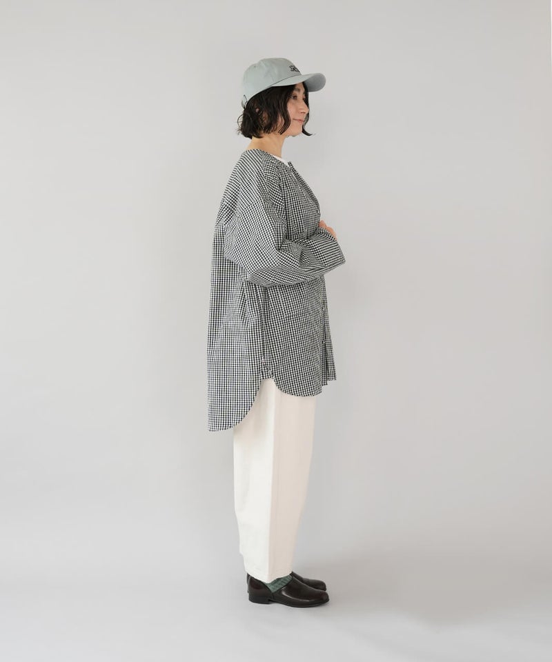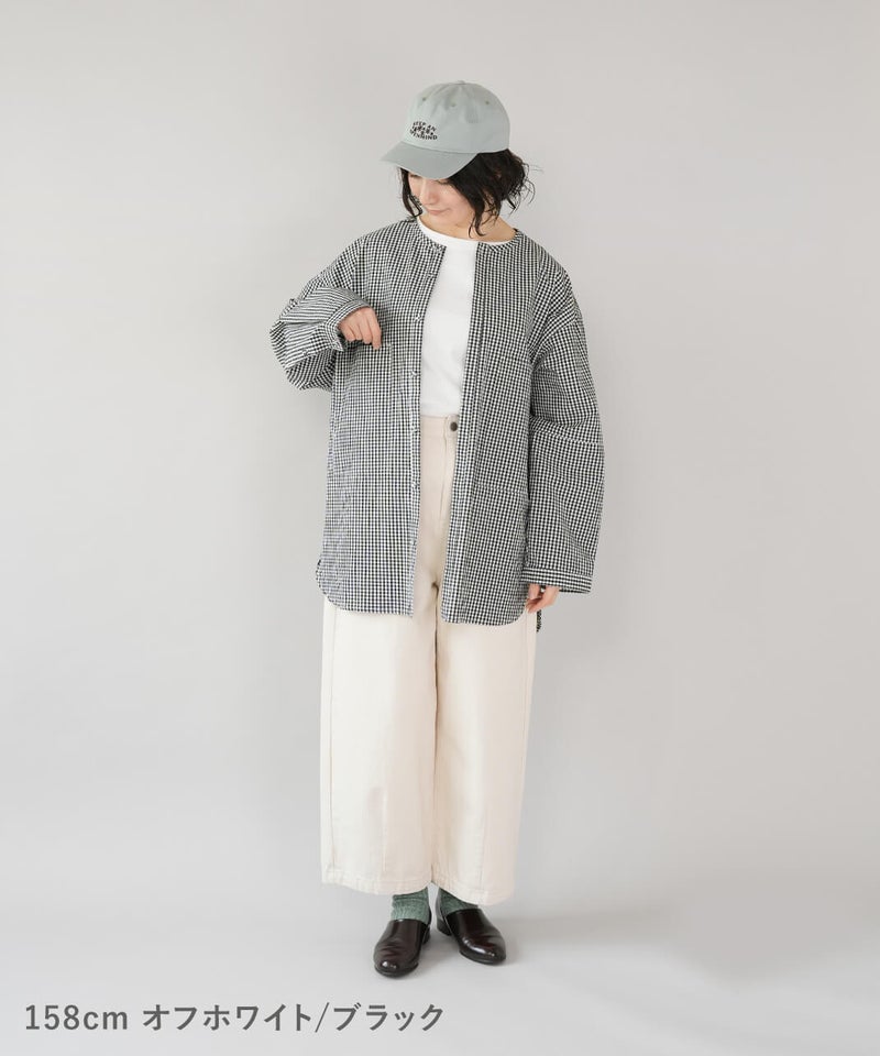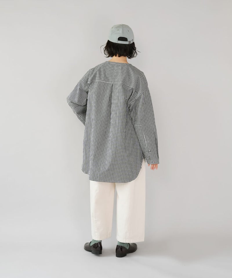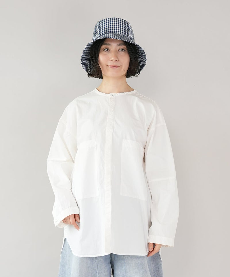 薄手のコットン生地に洗い加工の風合いが施されたロングシャツです。シンプルなノーカラーに比翼仕立てですっきりとした仕上がり。大きめのポケットにゆったりとしたシルエットでリラックスした着心地です。メンズでも着用できるユニセックスなデザインで、袖口を折り返してラフなスタイリングもおすすめです。シャツとしてはもちろん、羽織りとしても着用可能です。