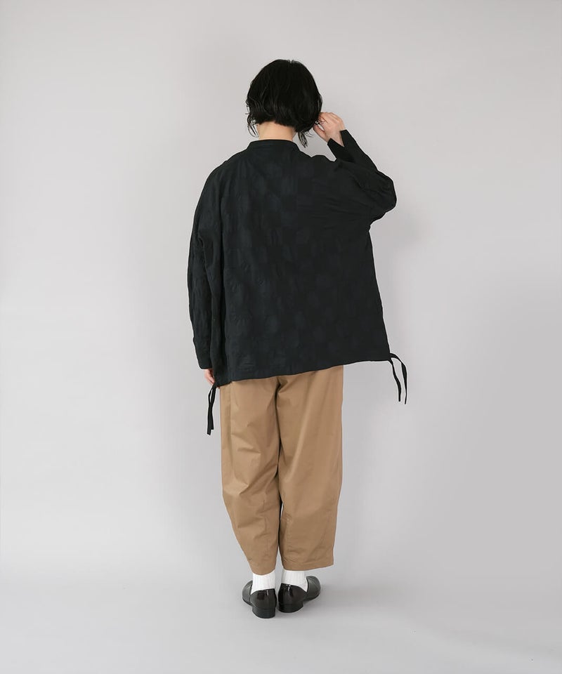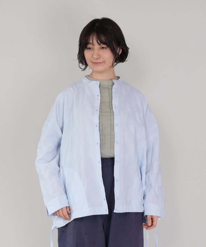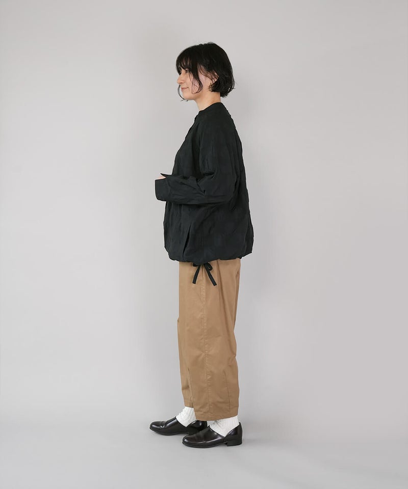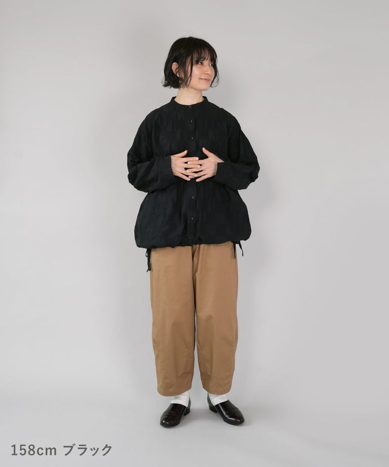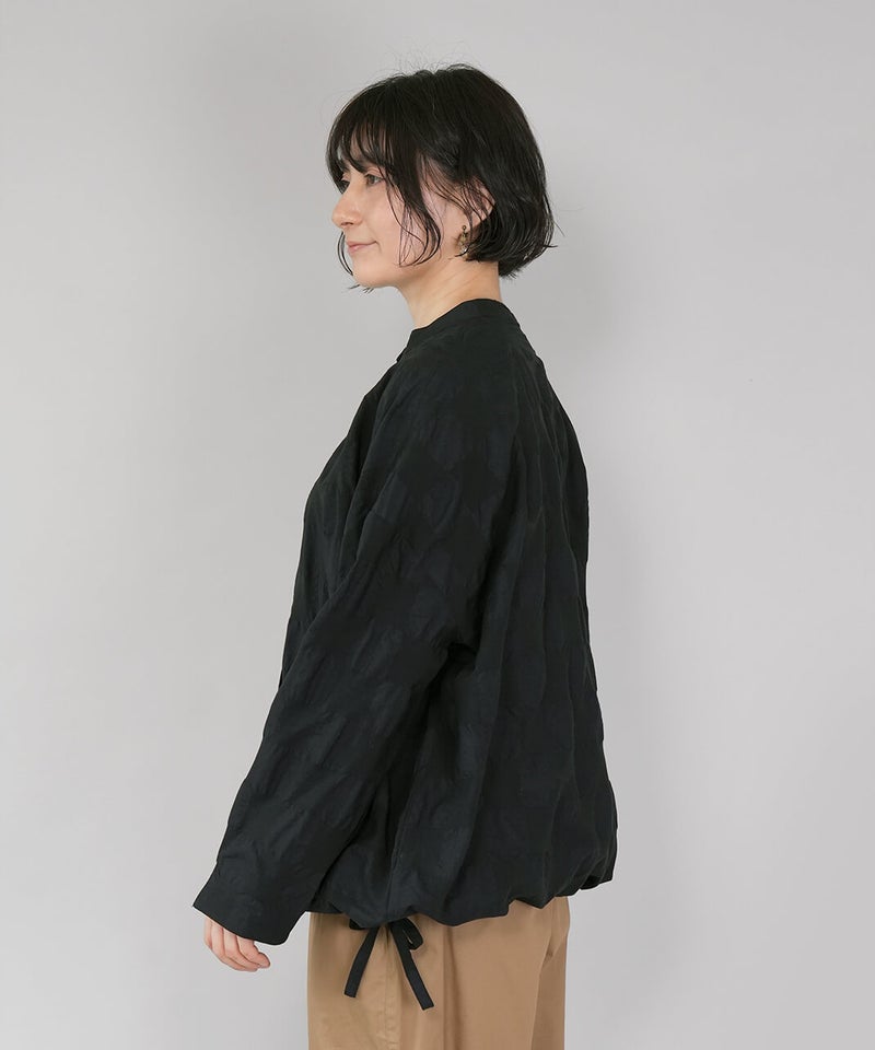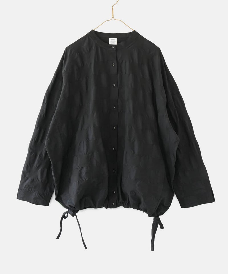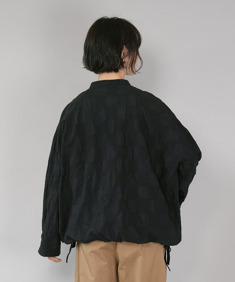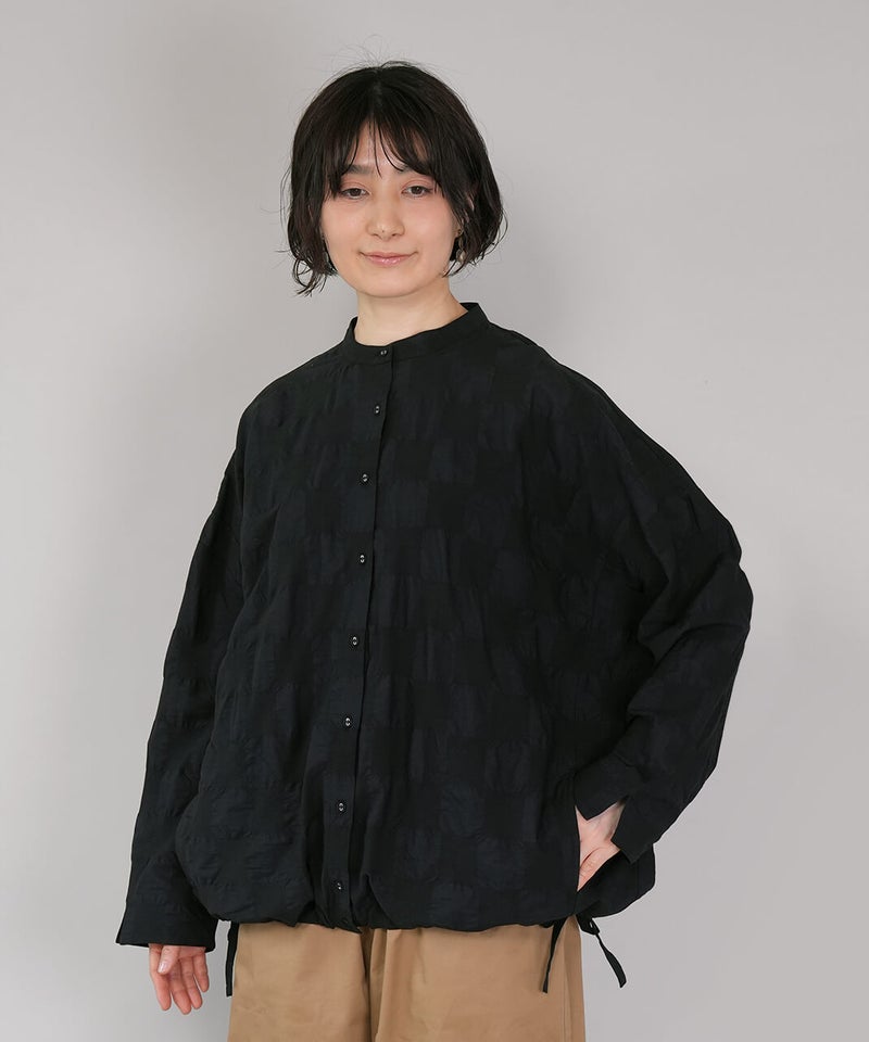 ややハリのある少し肉厚のコットン素材のブラウスです。格子柄に塩縮加工を施した凹凸のある生地感が、存在感のある1着です。シンプルなバンドカラーに、ワイドな身頃でゆったりとした着心地です。裾の両サイドにあしらったドローストリングを絞れば、ふんわりと丸みのあるバルーンシルエットにアレンジも可能。その日の気分やコーディネートに合わせて変化を楽しめます。便利なシームポケット付きです。軽い羽織りとしても活躍してくれます。