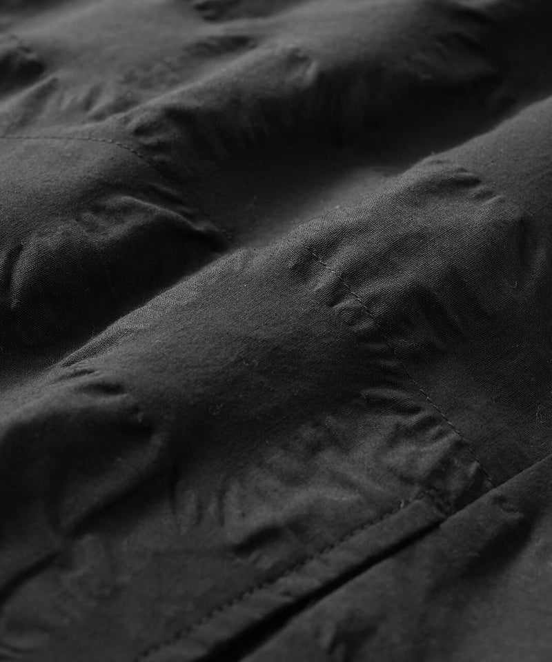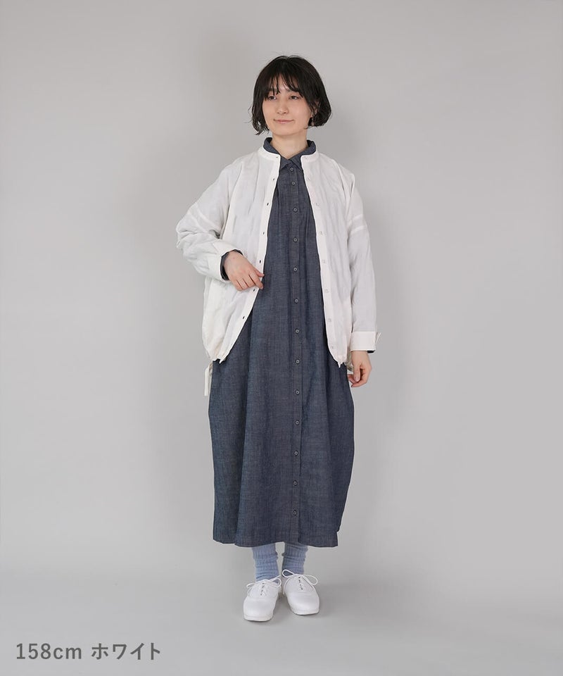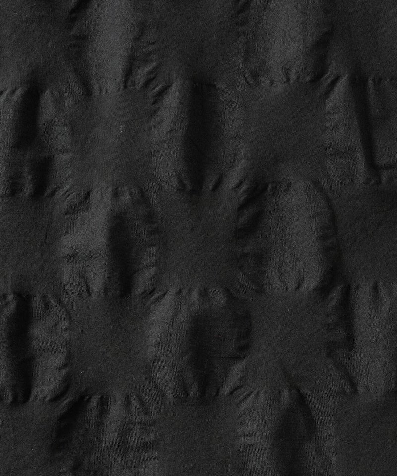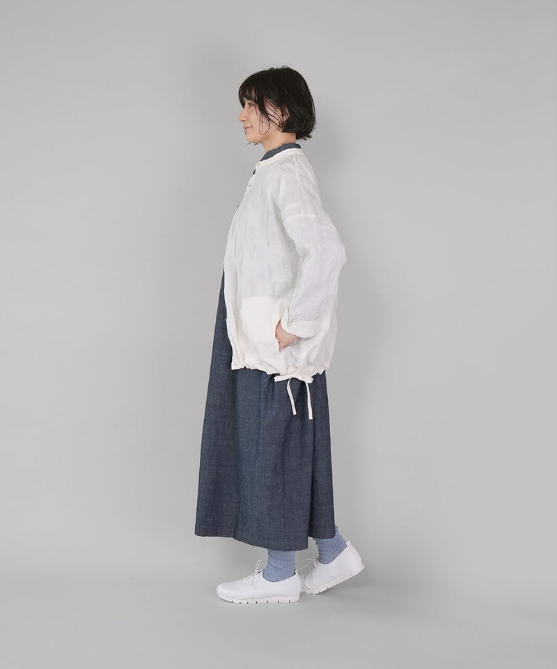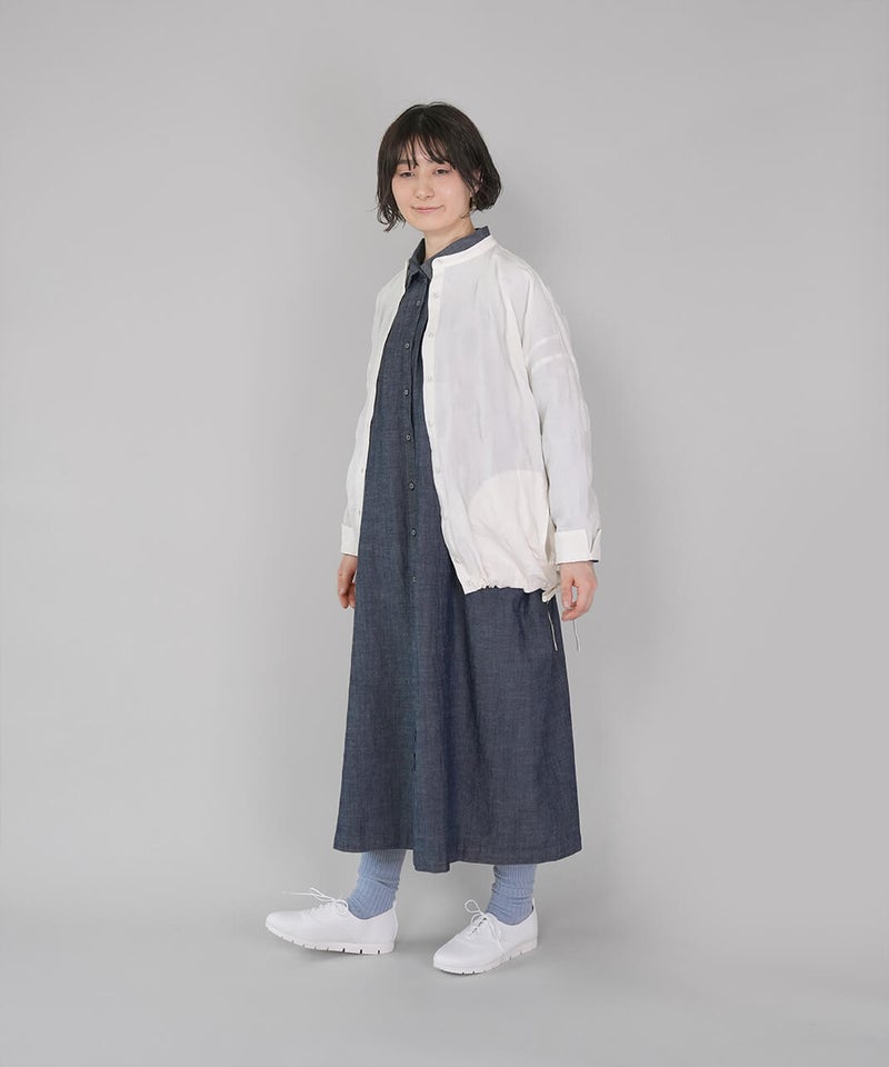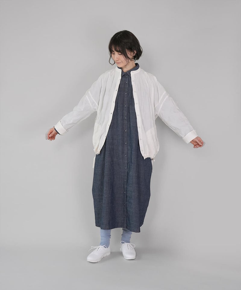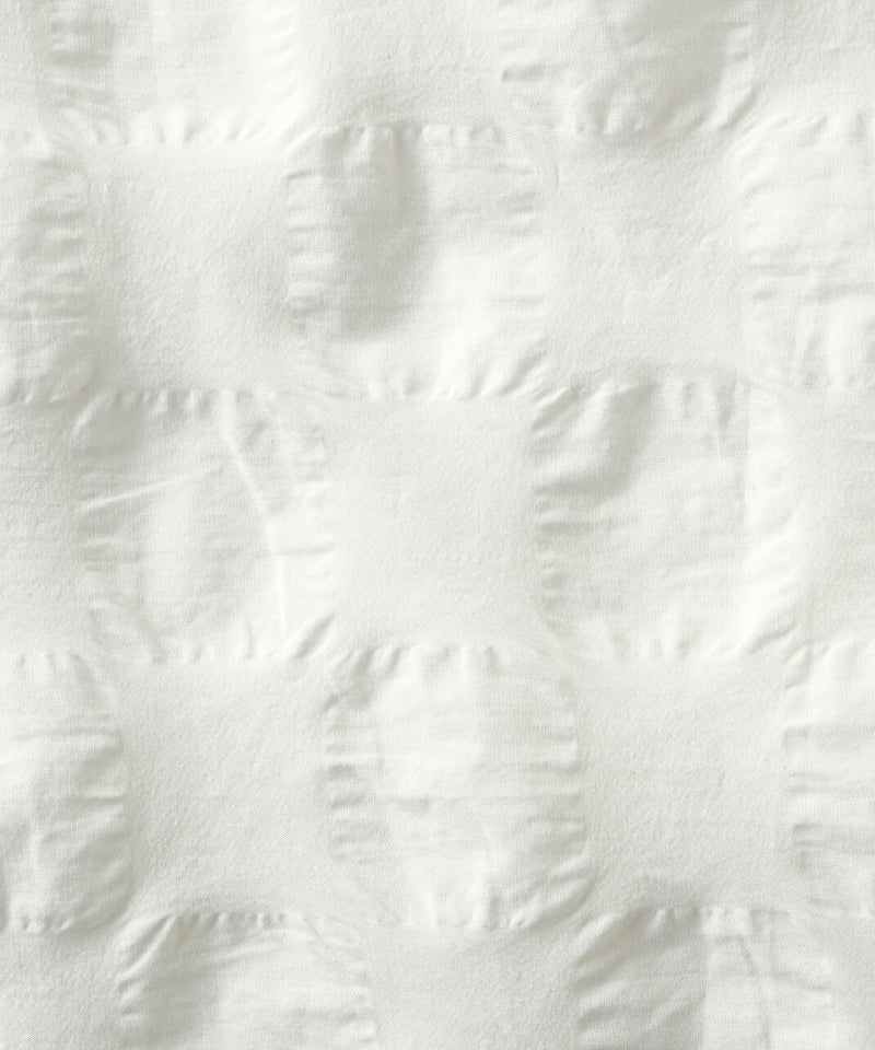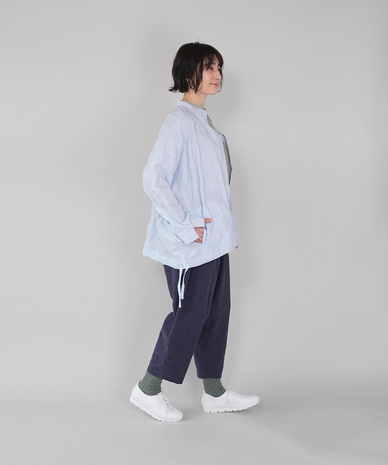 ややハリのある少し肉厚のコットン素材のブラウスです。格子柄に塩縮加工を施した凹凸のある生地感が、存在感のある1着です。シンプルなバンドカラーに、ワイドな身頃でゆったりとした着心地です。裾の両サイドにあしらったドローストリングを絞れば、ふんわりと丸みのあるバルーンシルエットにアレンジも可能。その日の気分やコーディネートに合わせて変化を楽しめます。便利なシームポケット付きです。軽い羽織りとしても活躍してくれます。