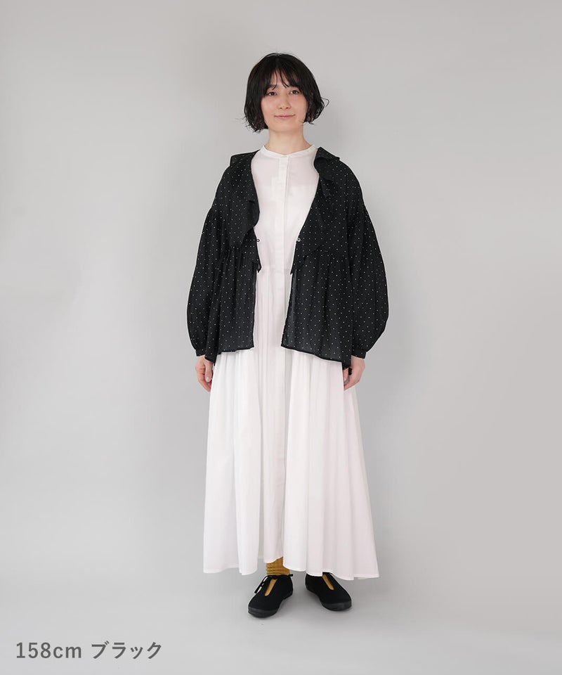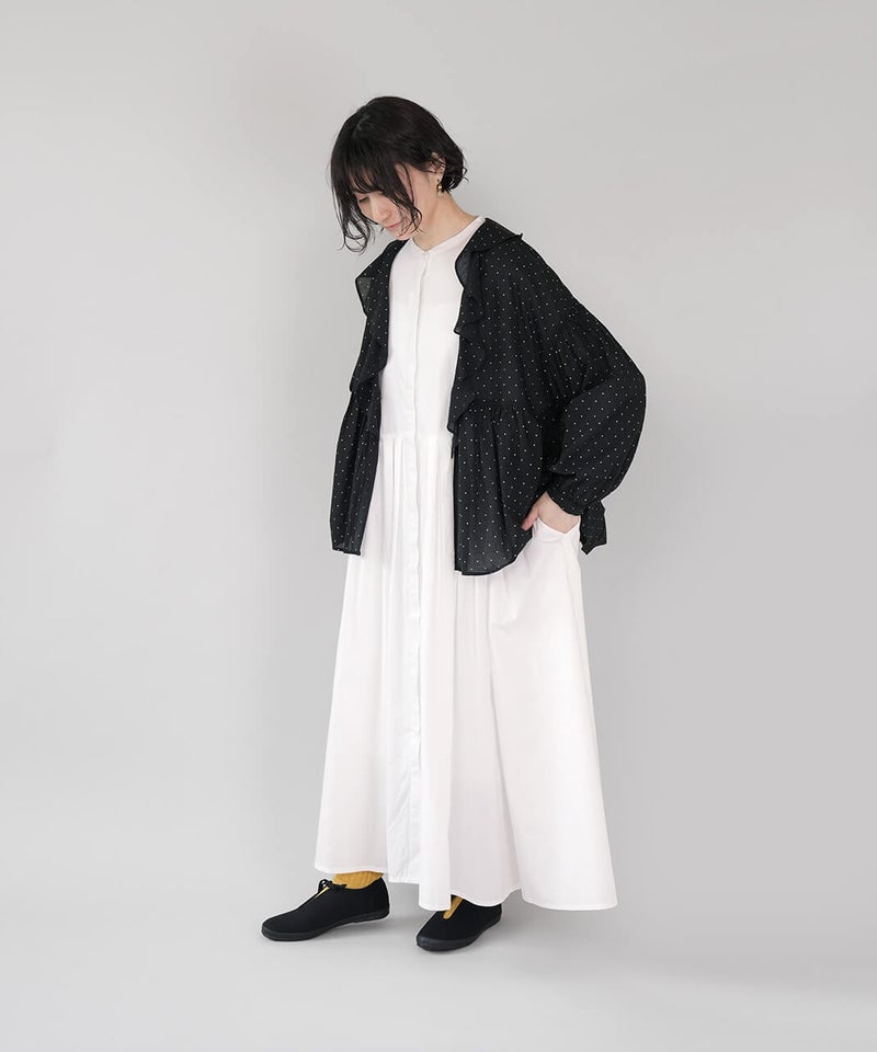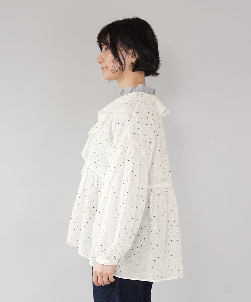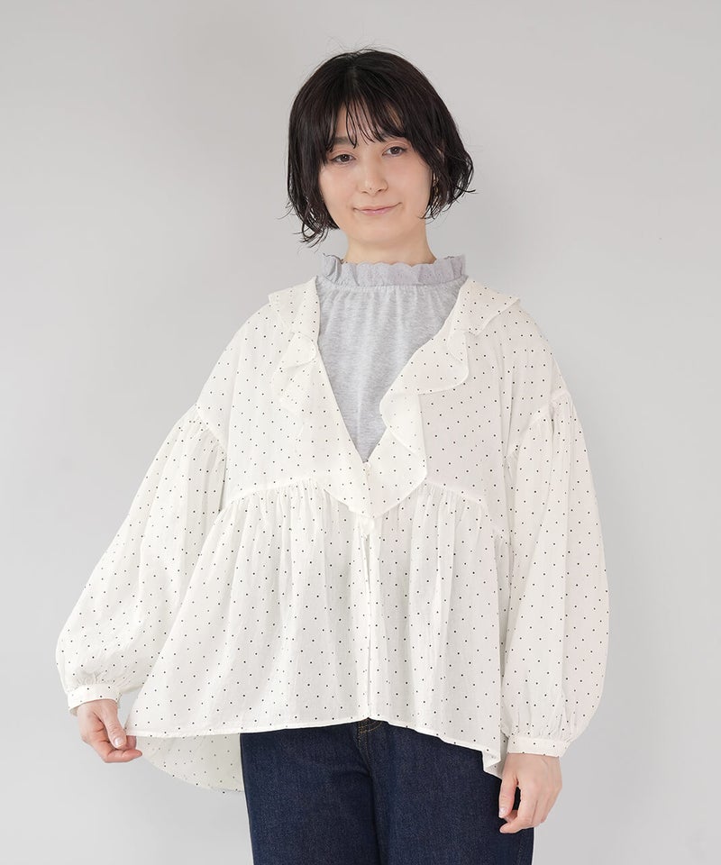 シアー感のある、やわらかなコットン素材を使用したブラウスです。フリル襟とふんわりとしたボリューム袖が印象的で、やさしく華やかな雰囲気の1着です。ウエスト部分にはぐるりとギャザーを施し、丸みのあるシルエットに。フロントは1つボタン仕様で、カーディガンのような感覚で軽やかに羽織るのもおすすめです。控えめなドット柄がさりげないアクセントとなり、シンプルな装いに彩りをプラスしてくれます。
