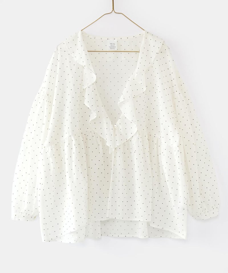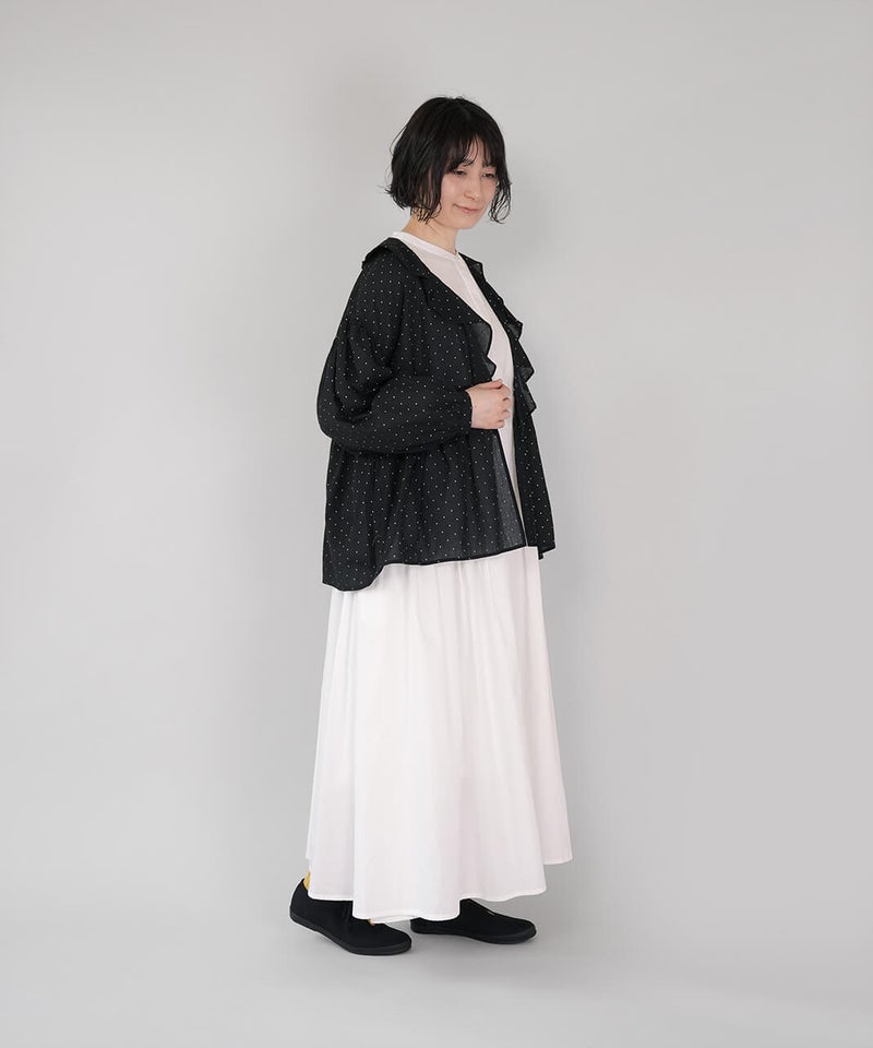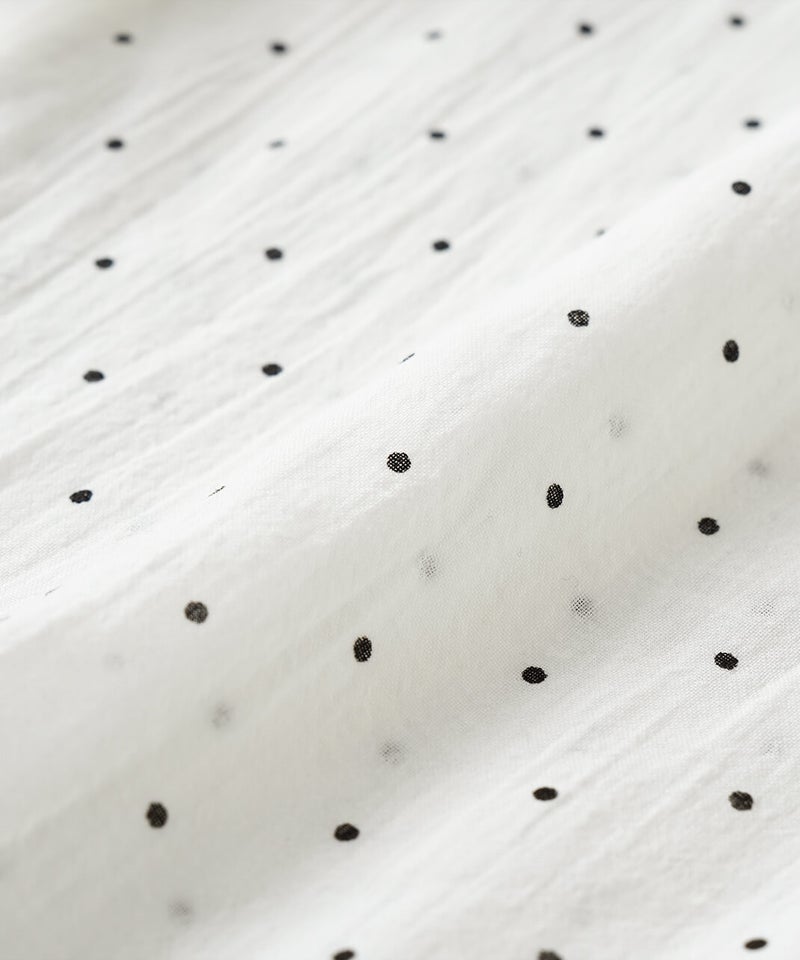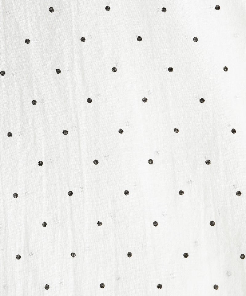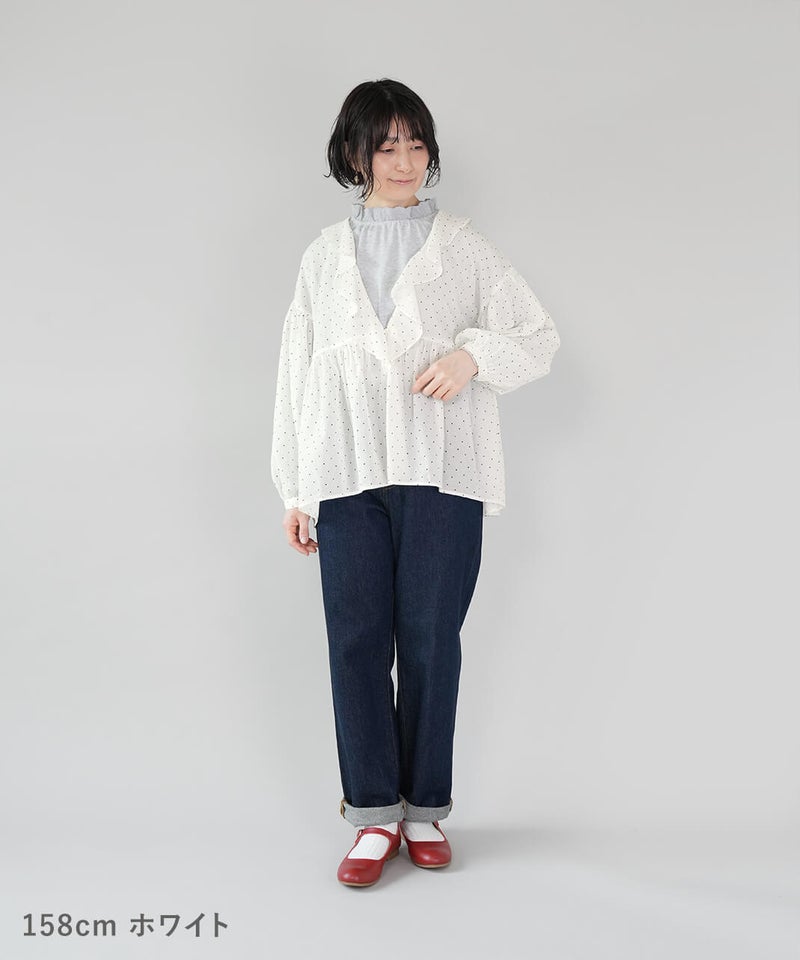 シアー感のある、やわらかなコットン素材を使用したブラウスです。フリル襟とふんわりとしたボリューム袖が印象的で、やさしく華やかな雰囲気の1着です。ウエスト部分にはぐるりとギャザーを施し、丸みのあるシルエットに。フロントは1つボタン仕様で、カーディガンのような感覚で軽やかに羽織るのもおすすめです。控えめなドット柄がさりげないアクセントとなり、シンプルな装いに彩りをプラスしてくれます。
