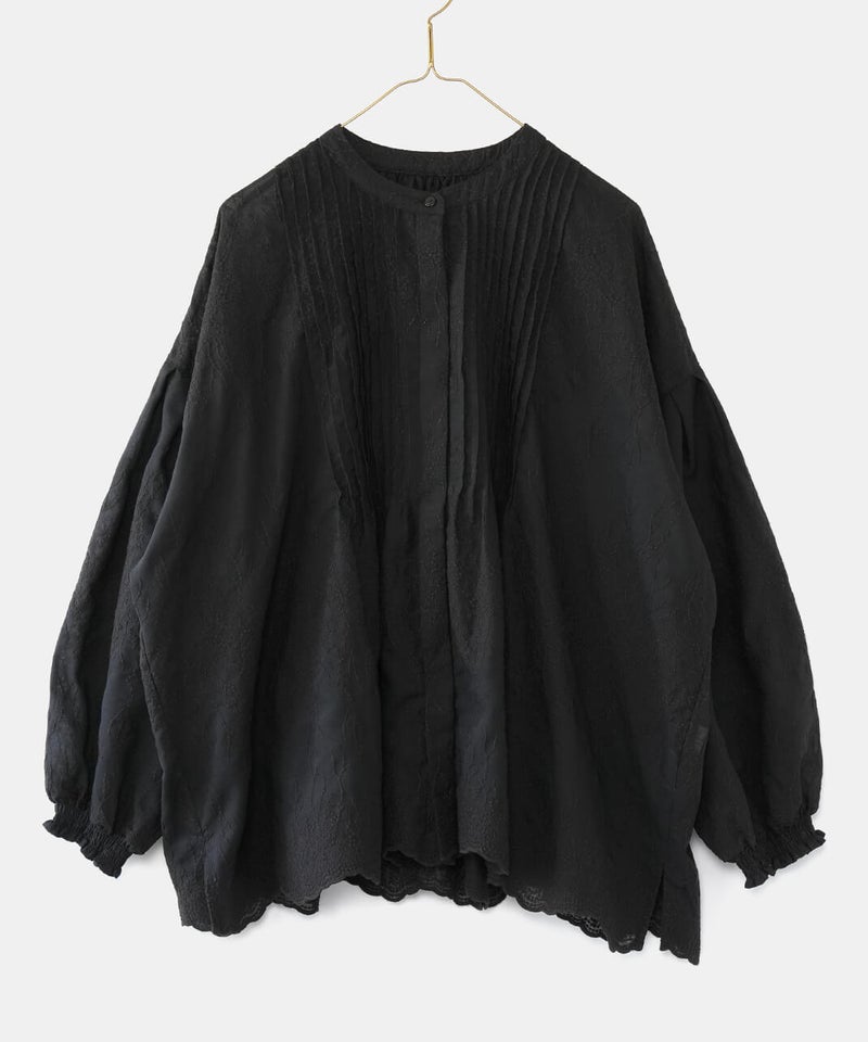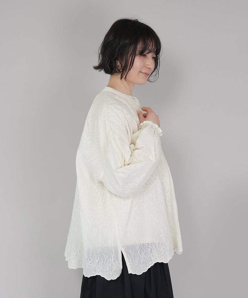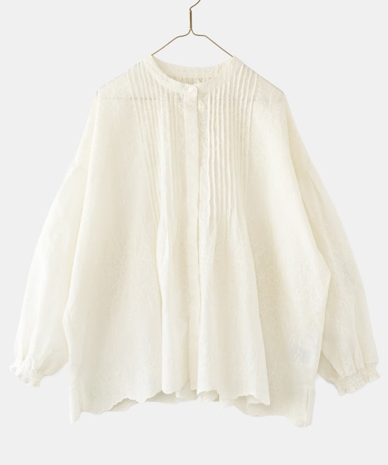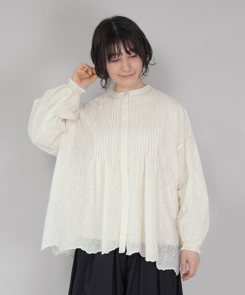 ほどよいシアー感のある、さらりとしたポリエステル生地にコットン糸で刺繍を施したブラウスです。繊細な総刺繍がやわらかな陰影をつくり、繊細で上品な印象を演出してくれます。シンプルなバンドカラーにピンタックをあしらい、甘さを抑えたすっきりとしたデザインに仕上げました。袖口はシャーリング仕様で、袖丈のアレンジも楽しめるのもポイントです。前を開けて軽やかな羽織りとしても活躍する、着回しのきく1着です。