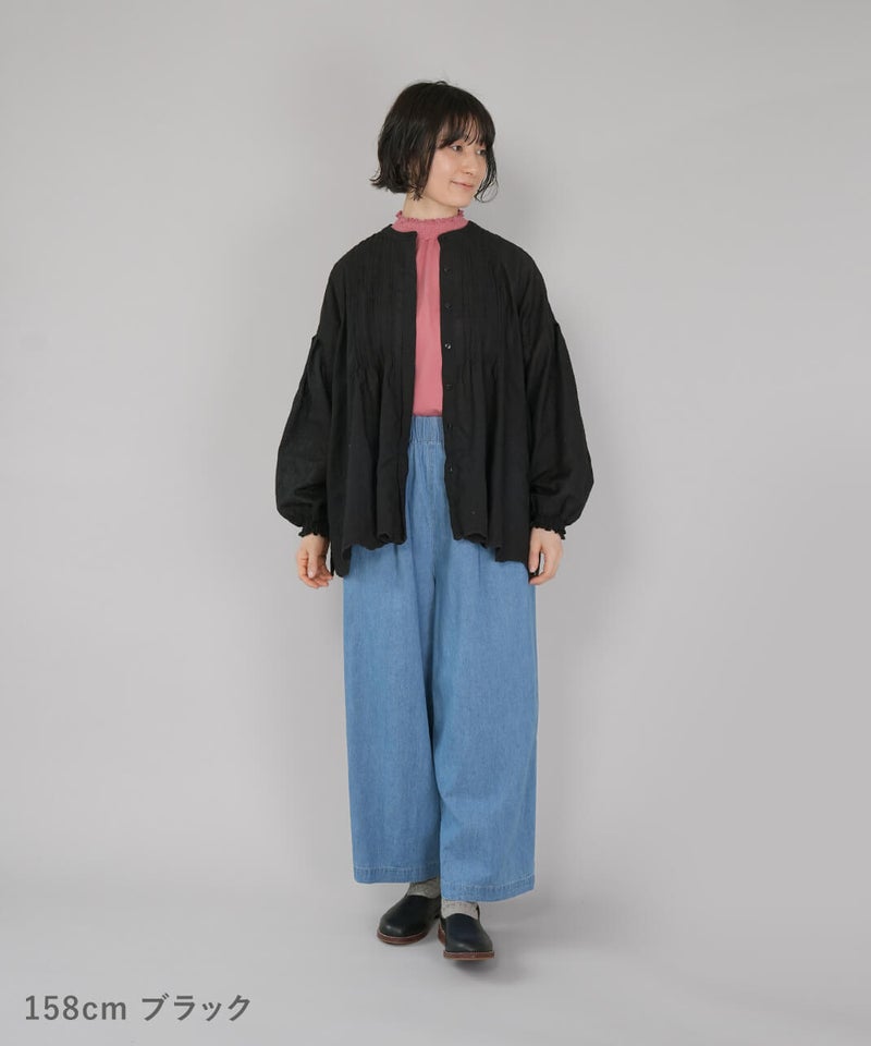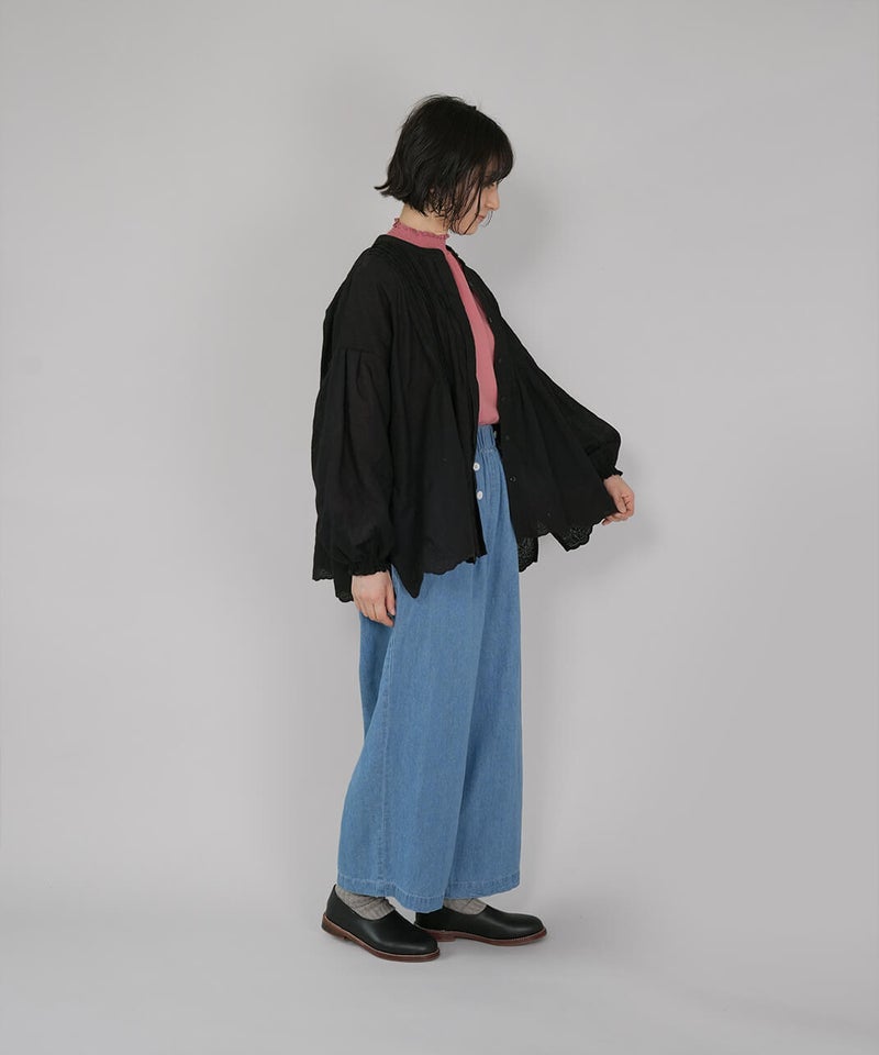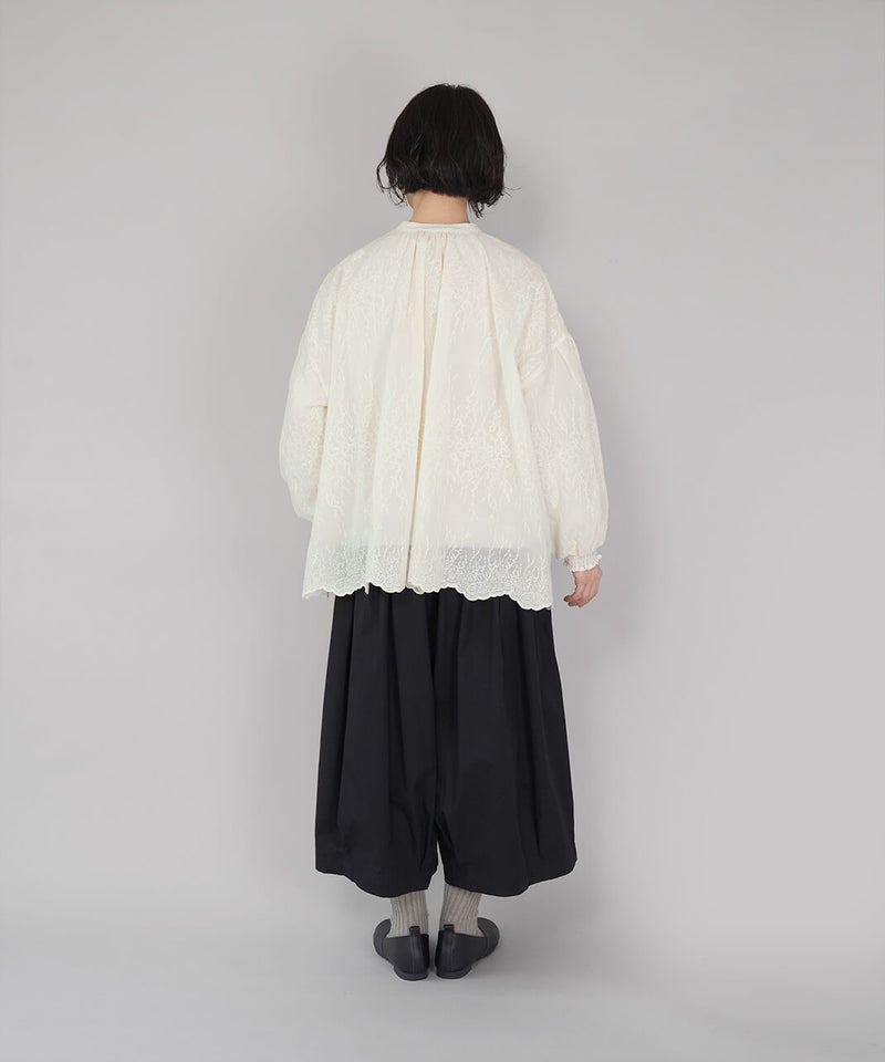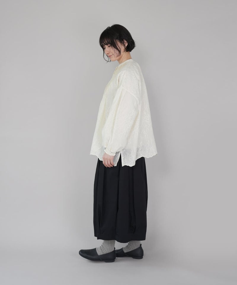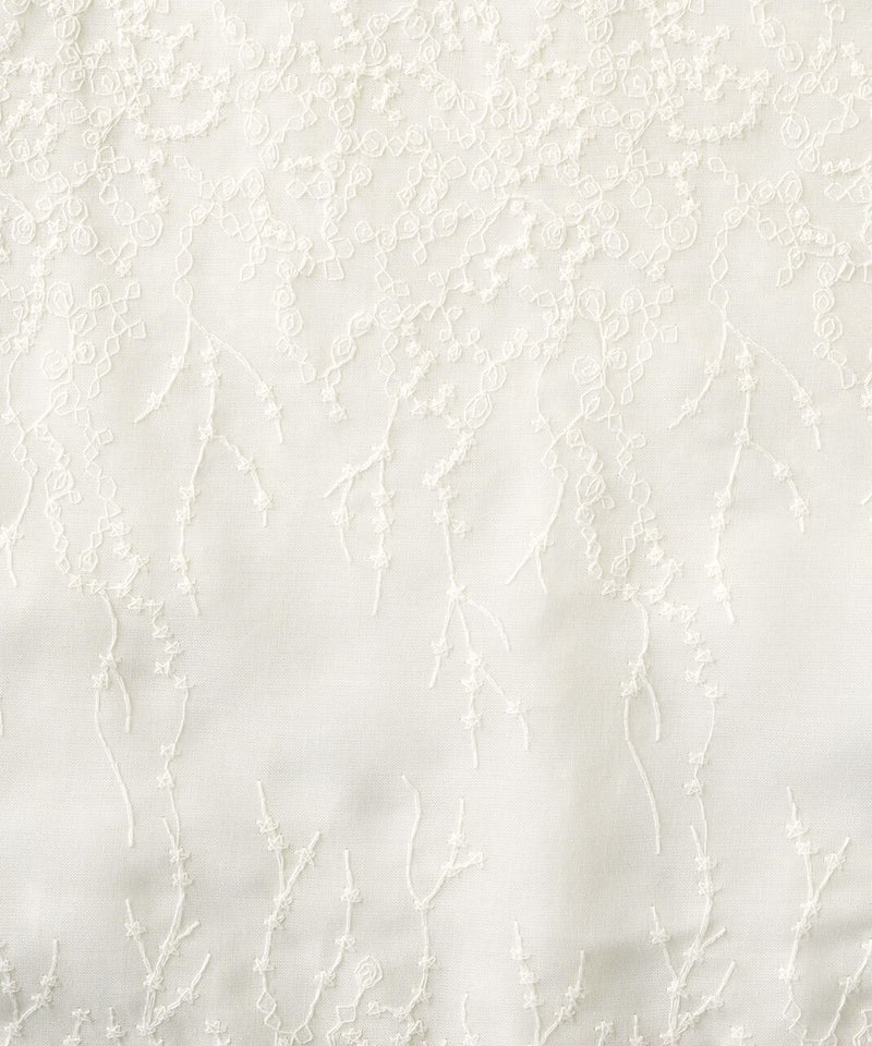 ほどよいシアー感のある、さらりとしたポリエステル生地にコットン糸で刺繍を施したブラウスです。繊細な総刺繍がやわらかな陰影をつくり、繊細で上品な印象を演出してくれます。シンプルなバンドカラーにピンタックをあしらい、甘さを抑えたすっきりとしたデザインに仕上げました。袖口はシャーリング仕様で、袖丈のアレンジも楽しめるのもポイントです。前を開けて軽やかな羽織りとしても活躍する、着回しのきく1着です。