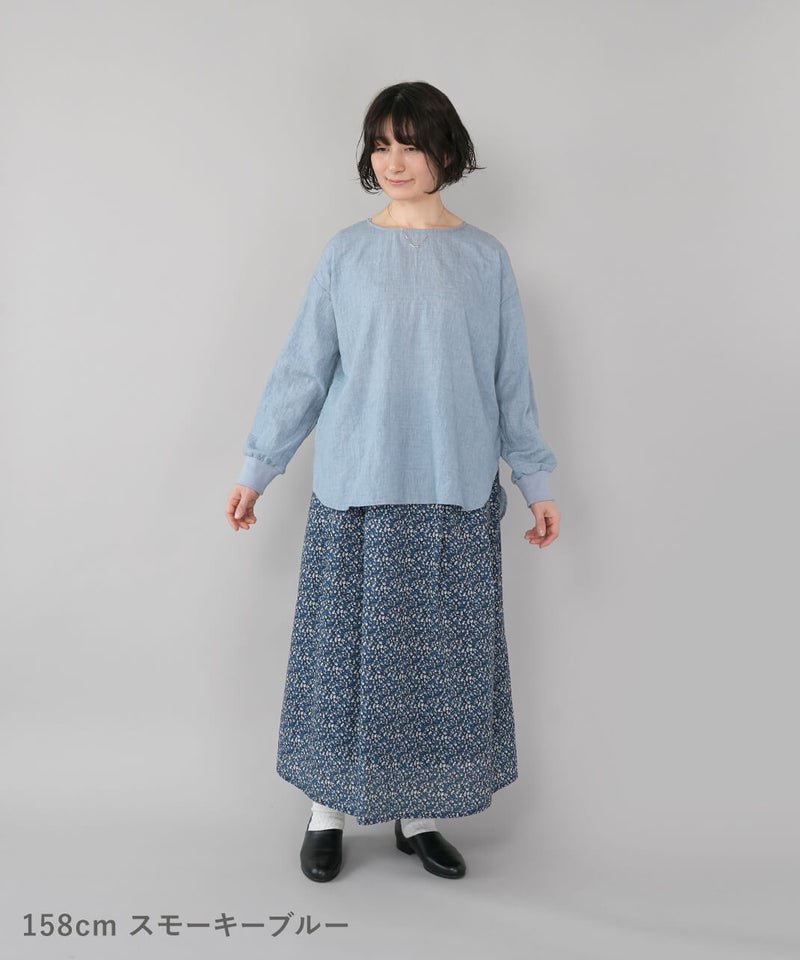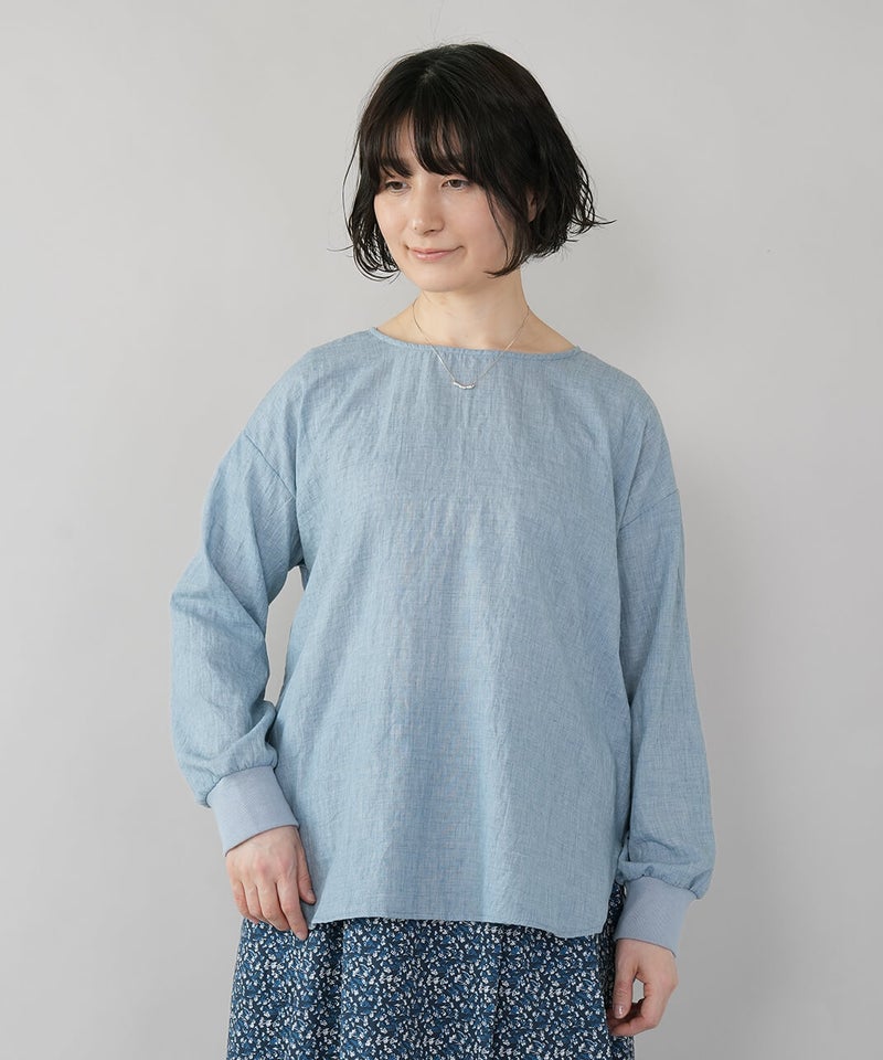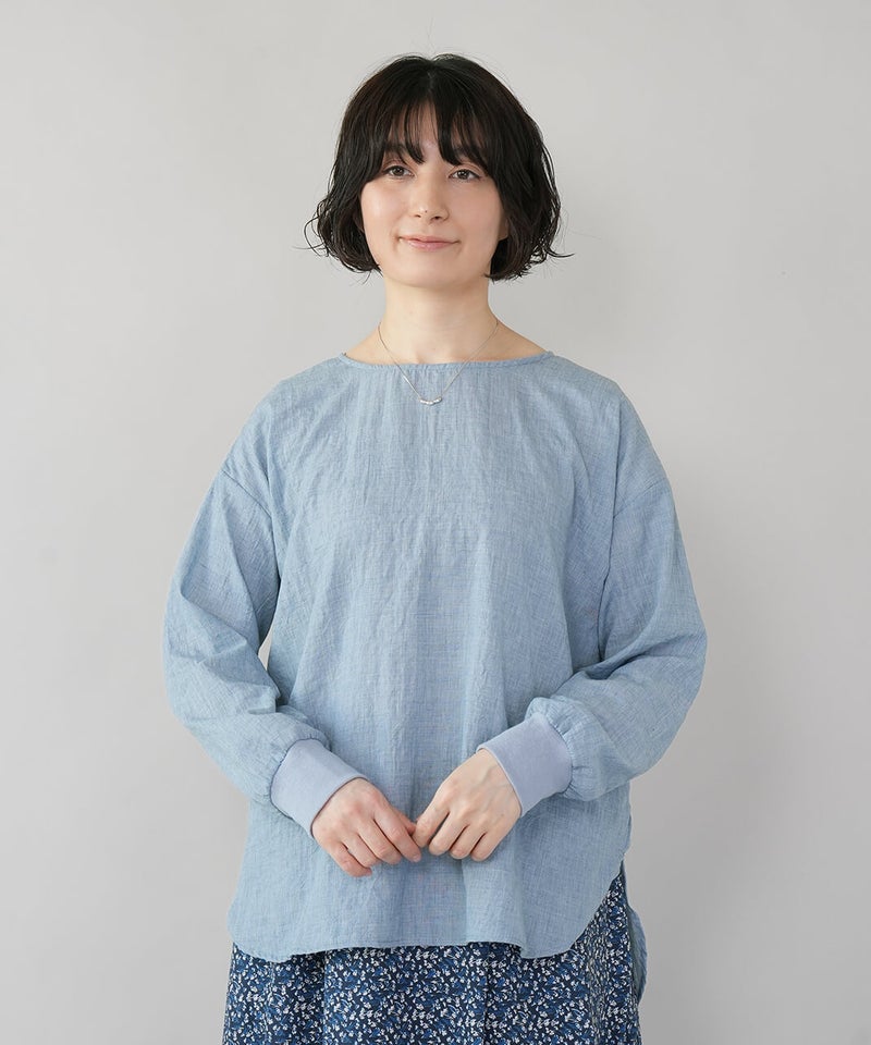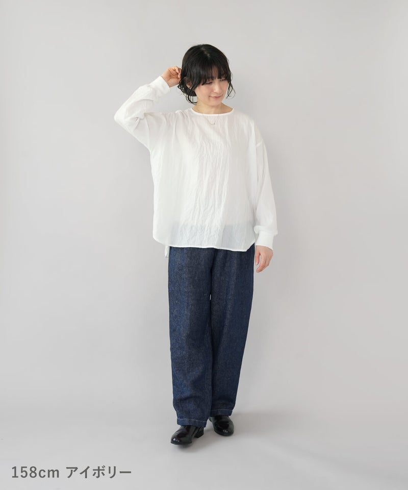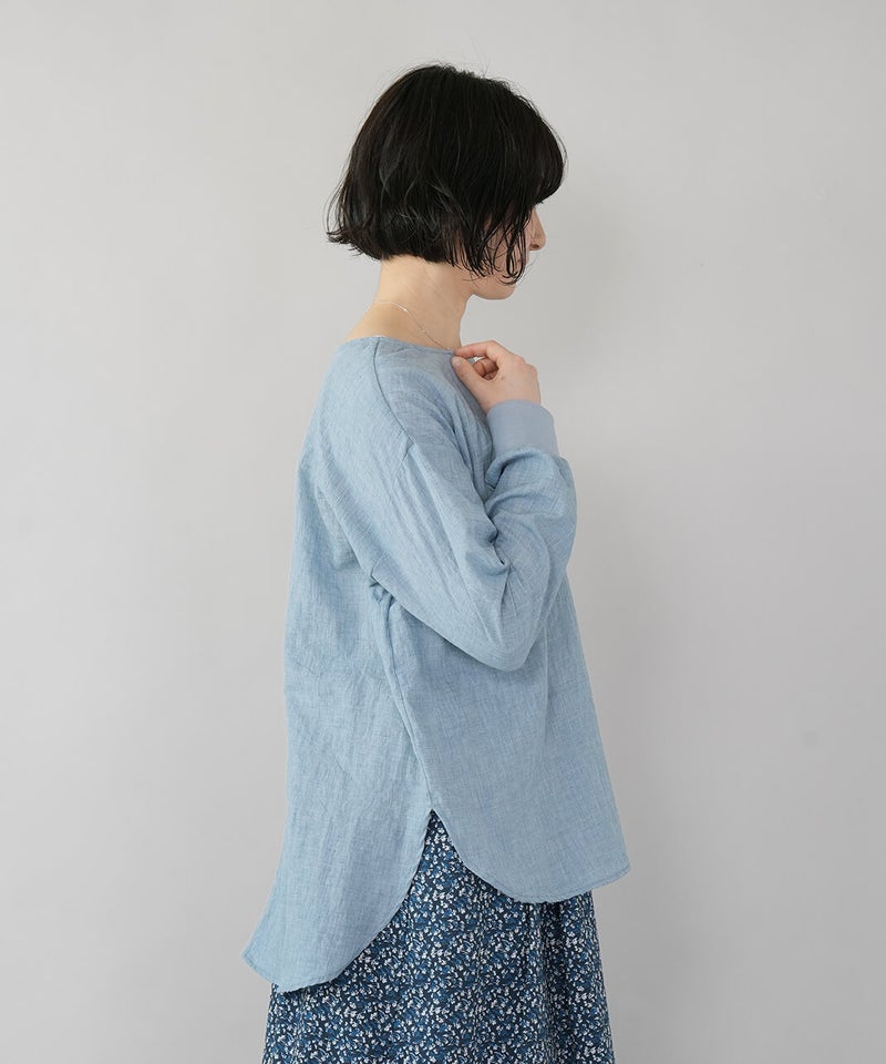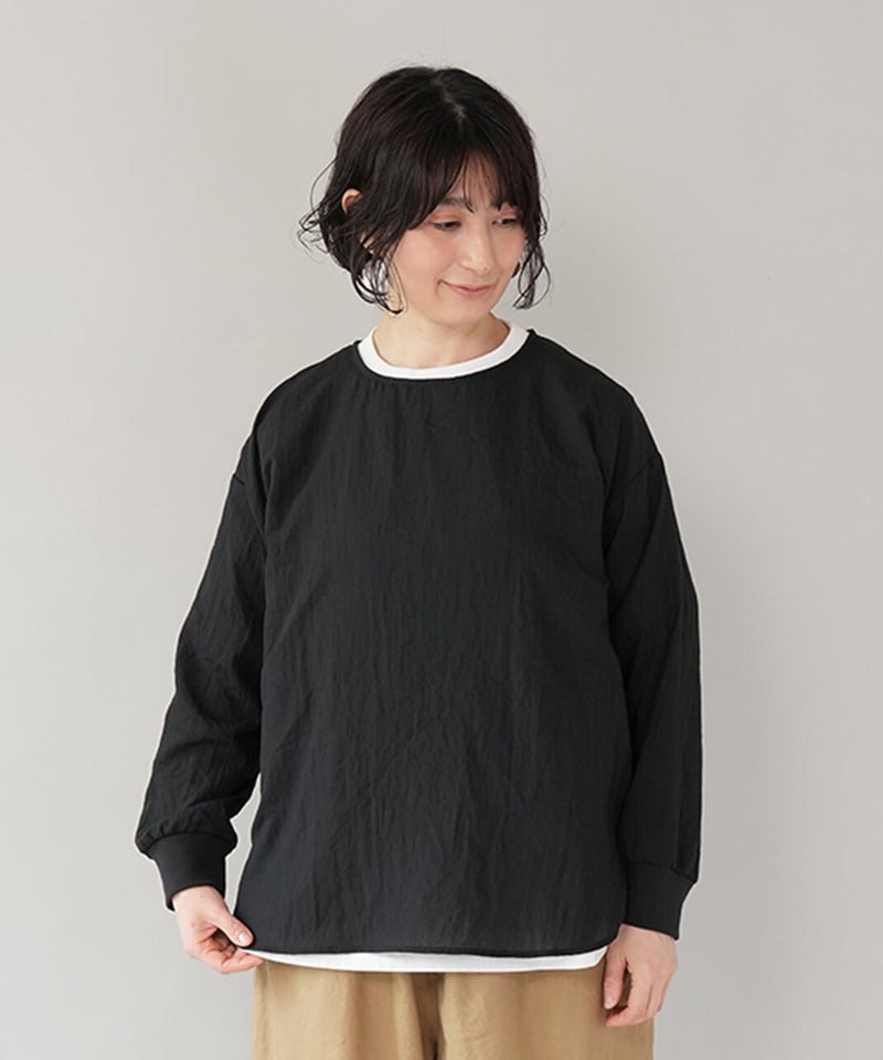 生地に凹凸がある軽やかなリップル素材のプルオーバーです。薄手のさらりとした肌ざわりで、季節の変わり目にも気持ちよく着られます。袖口にはリブをあしらって、ほどよくカジュアルなアクセント。裾は前後差のあるラウンドヘムの動きのあるシルエットで、パンツにもスカートにも自然と馴染みます。少しゆとりのあるサイズ感は気になる腰まわりをやさしくカバーしてくれるのも嬉しいポイントです。