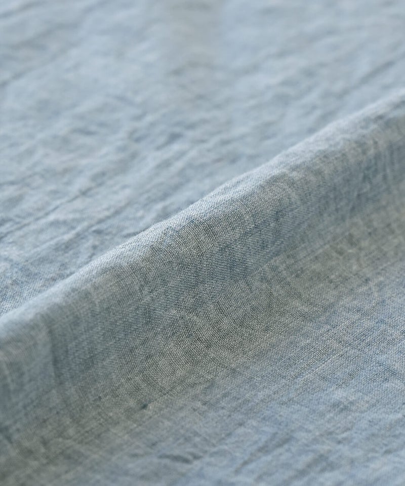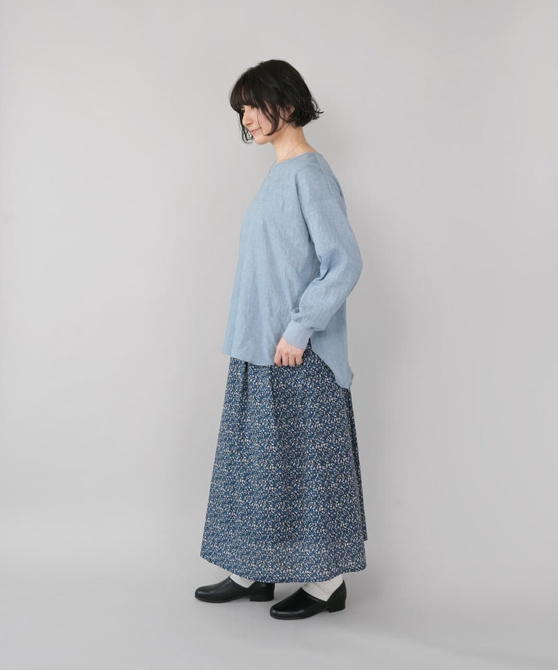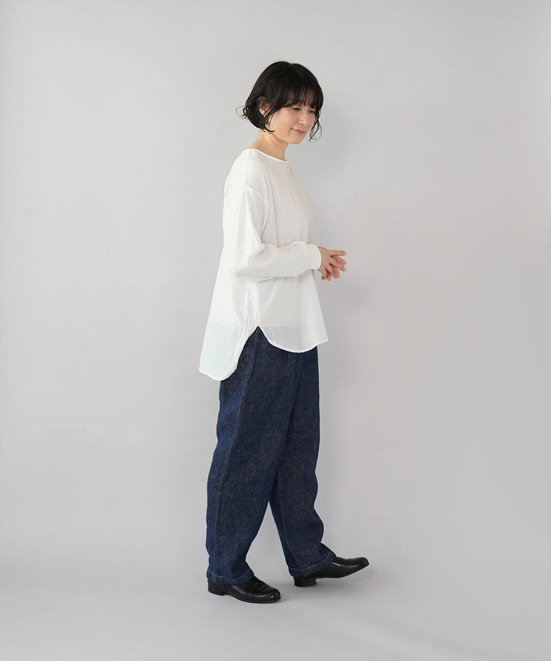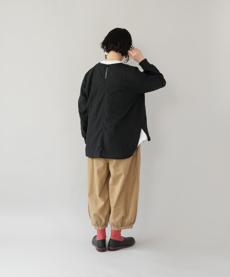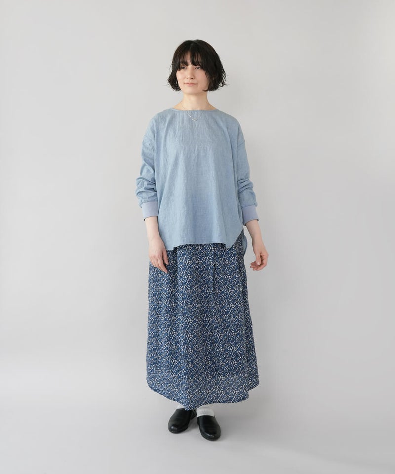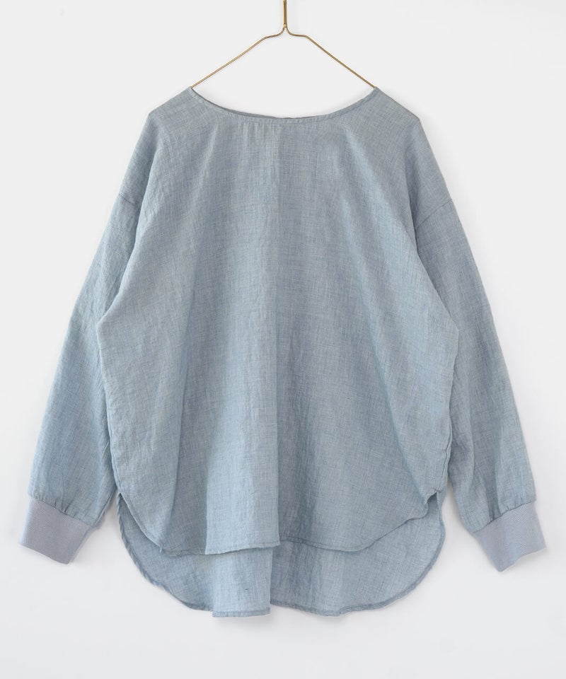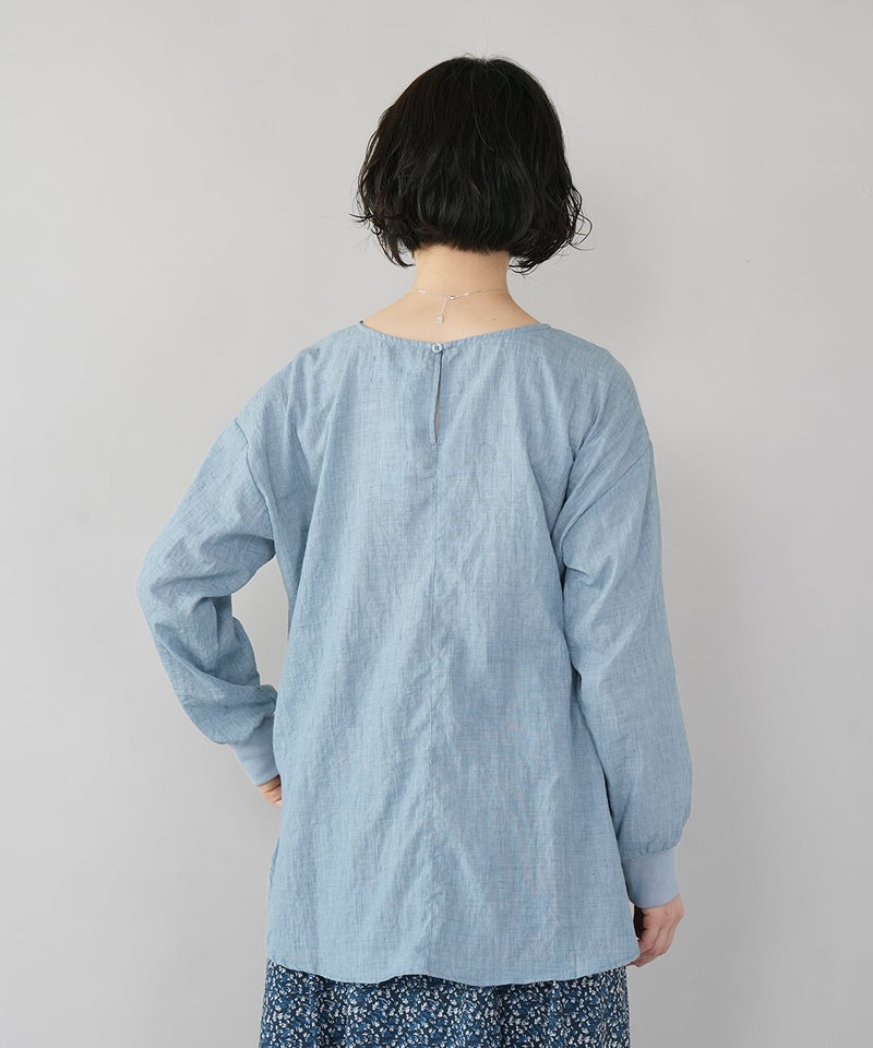生地に凹凸がある軽やかなリップル素材のプルオーバーです。薄手のさらりとした肌ざわりで、季節の変わり目にも気持ちよく着られます。袖口にはリブをあしらって、ほどよくカジュアルなアクセント。裾は前後差のあるラウンドヘムの動きのあるシルエットで、パンツにもスカートにも自然と馴染みます。少しゆとりのあるサイズ感は気になる腰まわりをやさしくカバーしてくれるのも嬉しいポイントです。