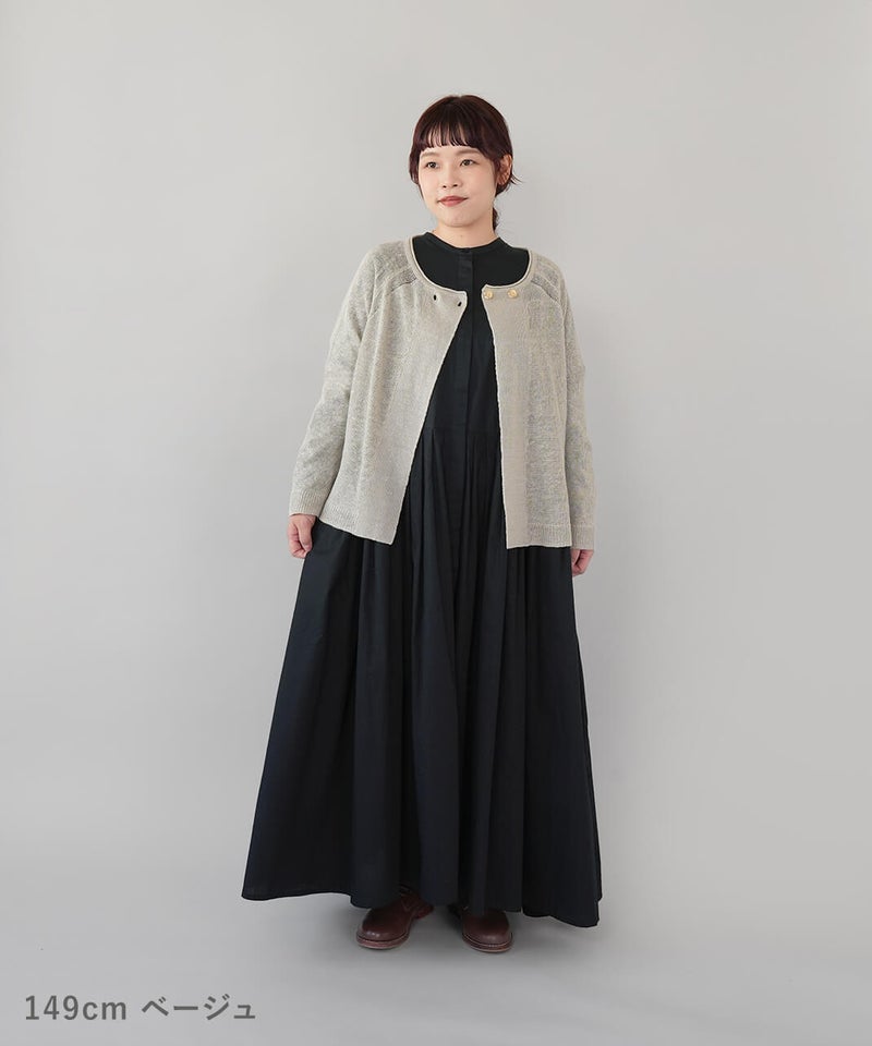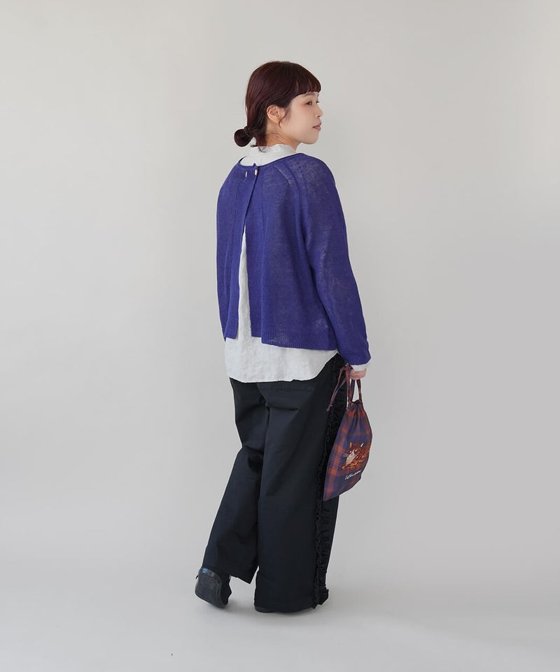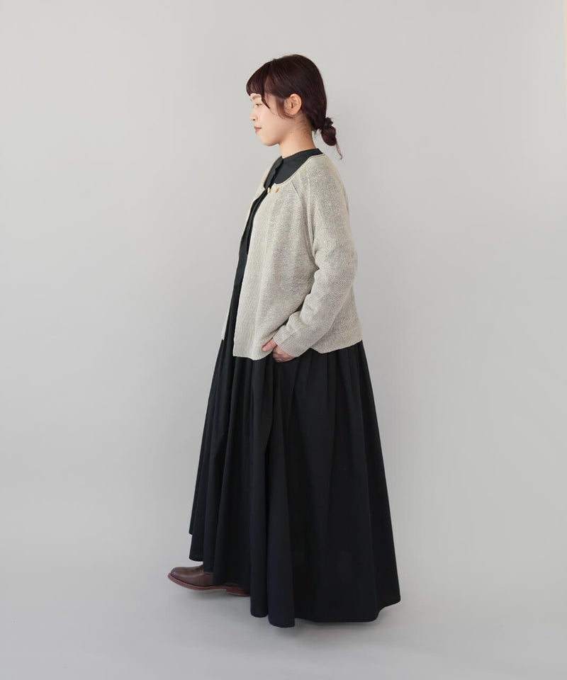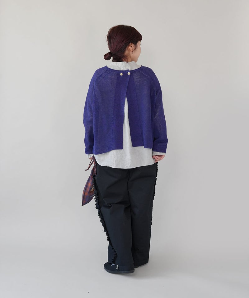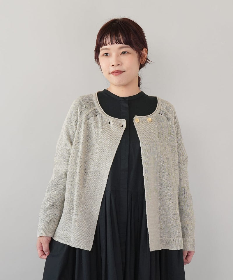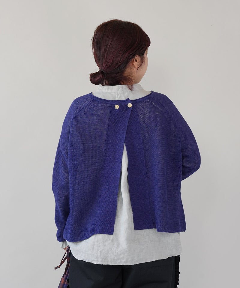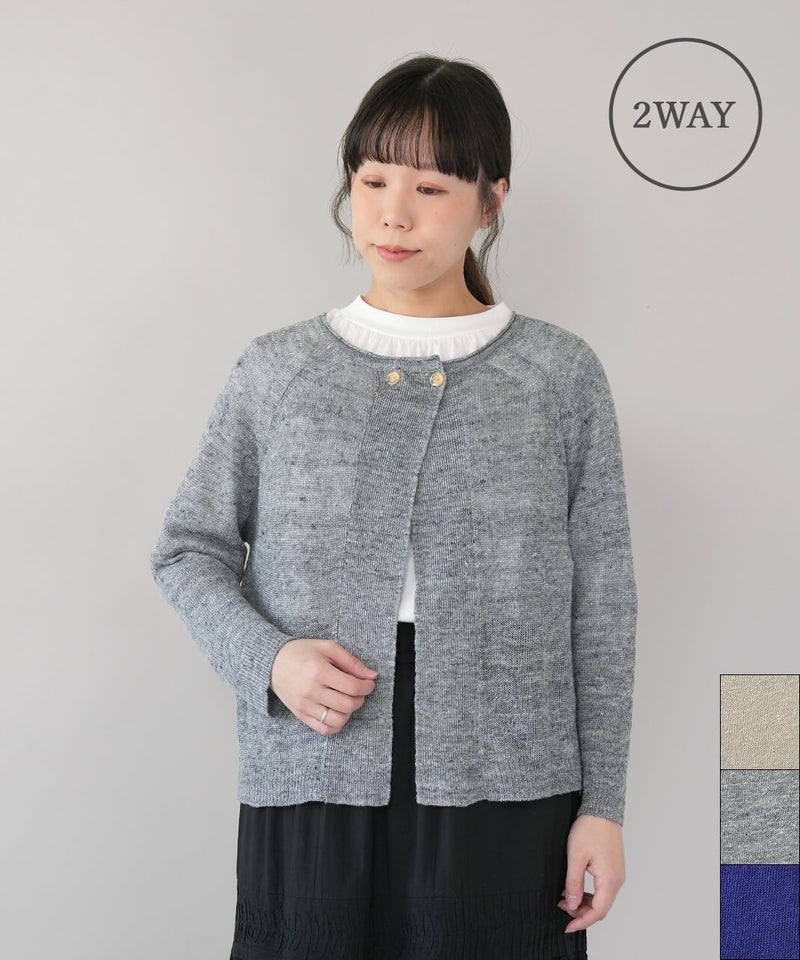 フレンチリネンで編まれたニットの2WAYカーディガンです。通気性に優れたフレンチリネンを使用し、さらりとした肌触りが心地よい1着。甘く編み立てることで、ほんのりとした透け感とやわらかさを持たせ、着用したときに体になじむような仕上りです。前後どちらでも着用できる2WAY仕様で、カーディガンとしてもプルオーバーとしても活躍。ダブル仕様のトップボタンや、立体感のあるロールネックもさりげないポイント。1枚で異なるスタイリングを楽しめる、着回し力の高いアイテムです。
