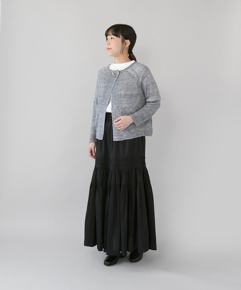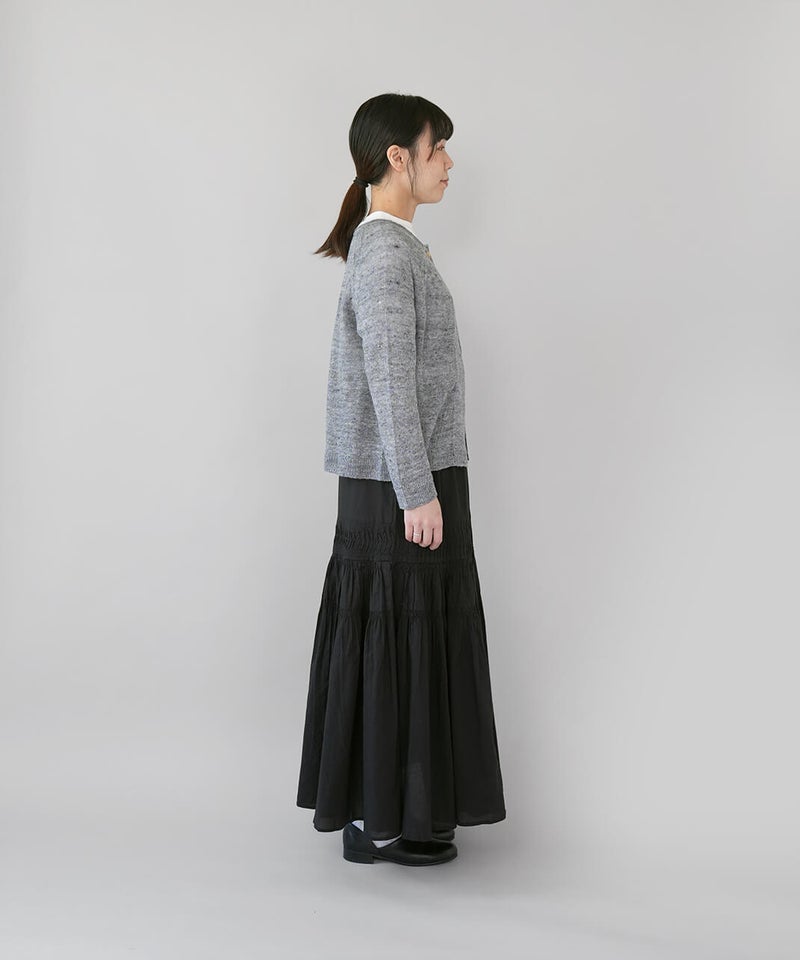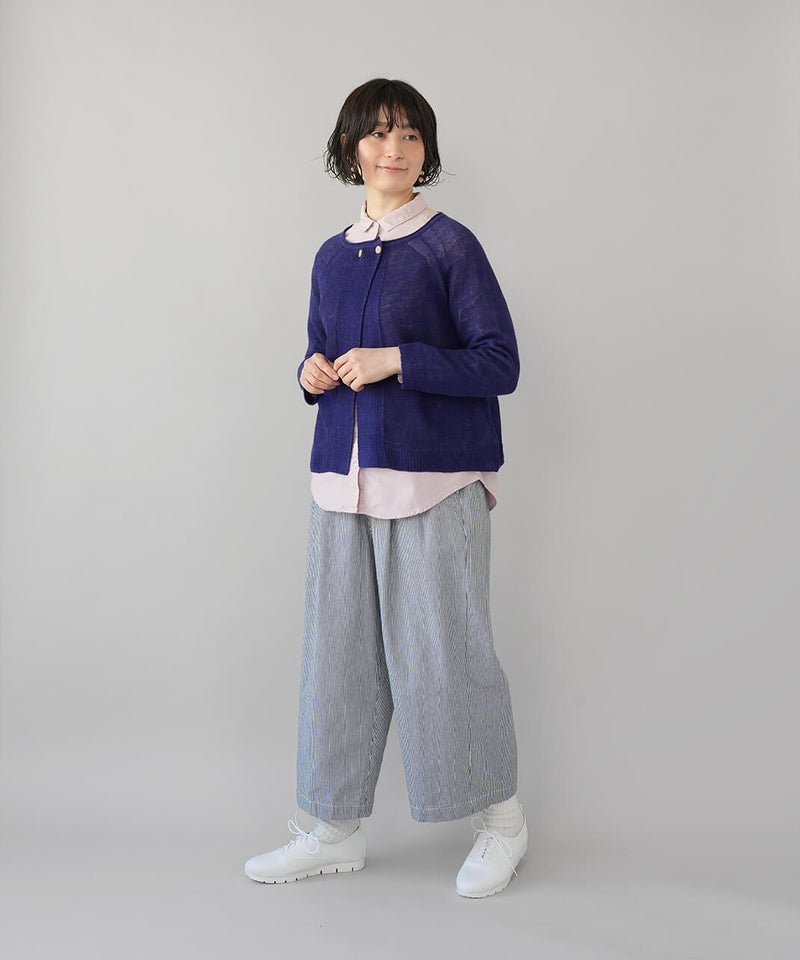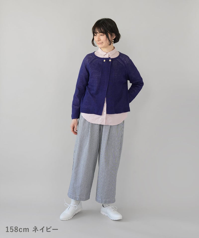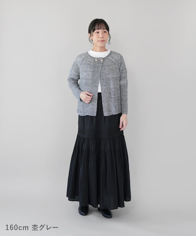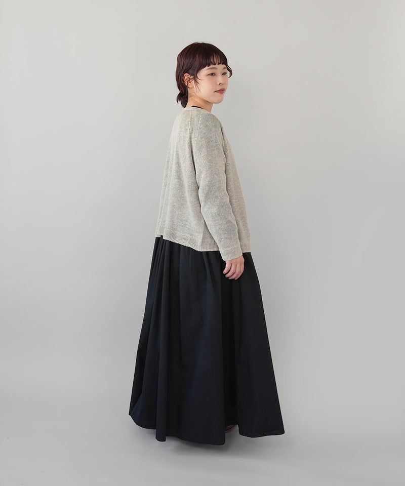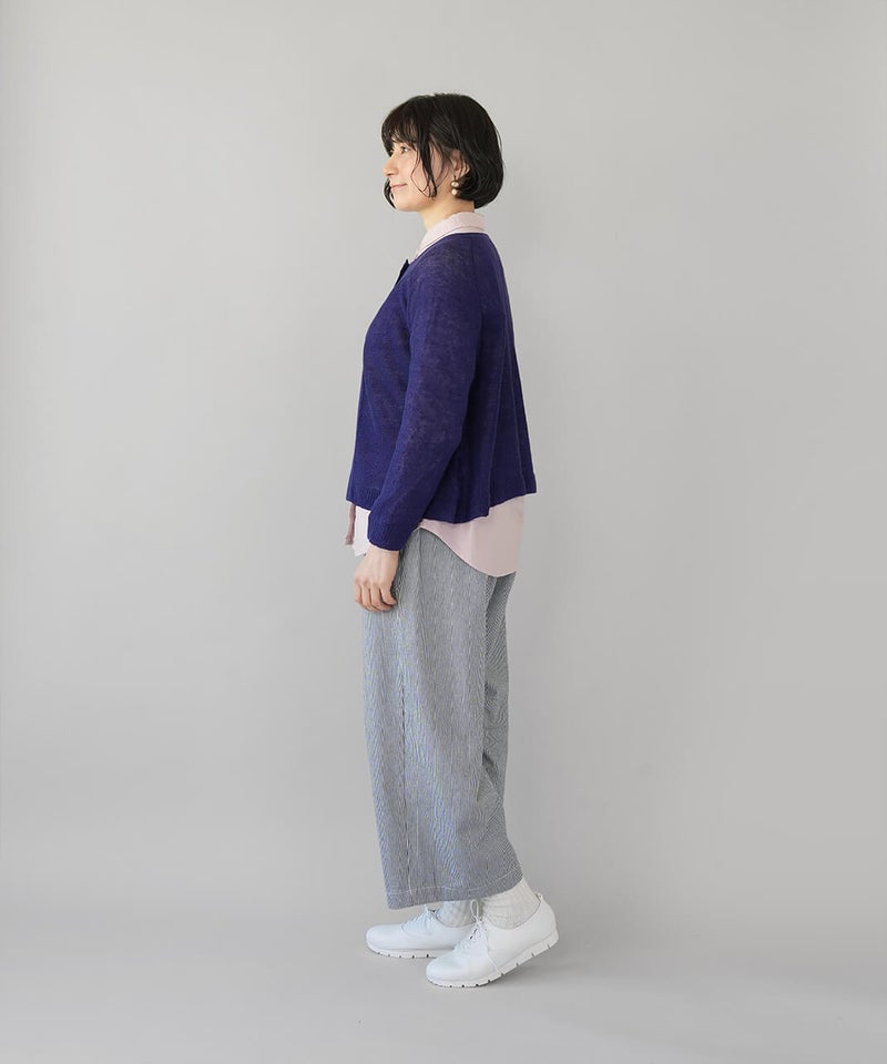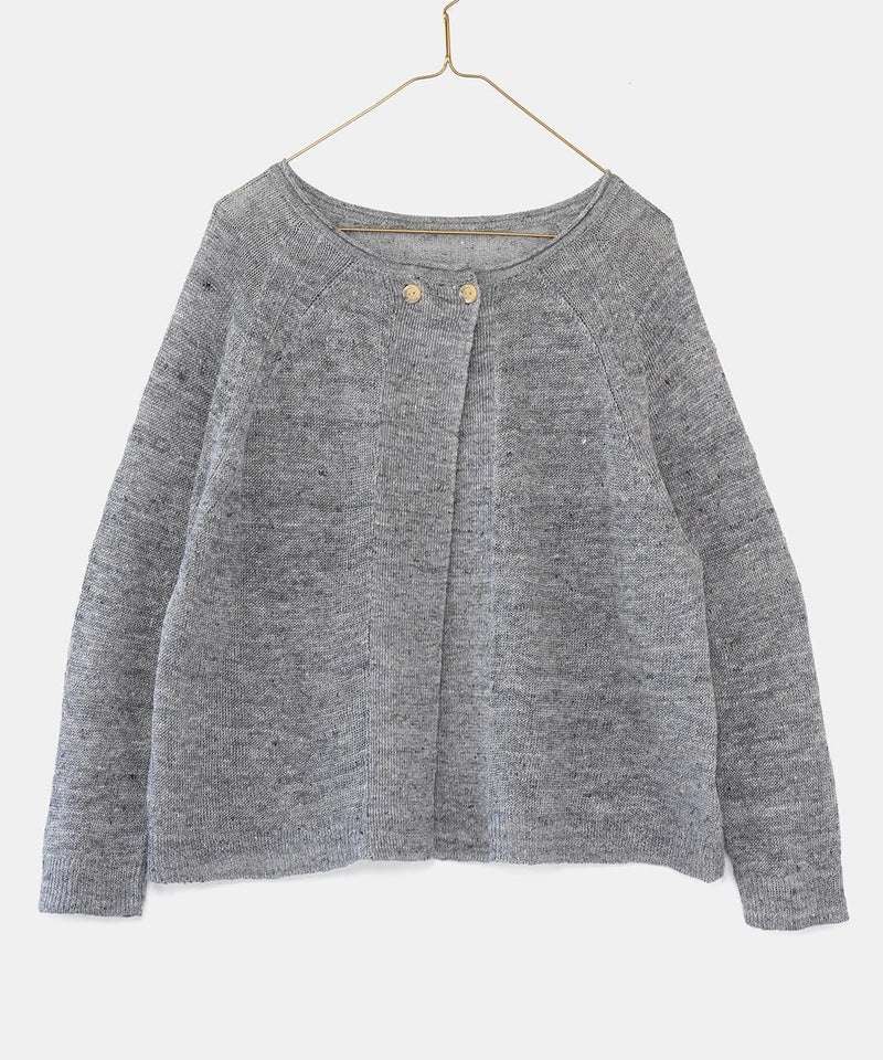 フレンチリネンで編まれたニットの2WAYカーディガンです。通気性に優れたフレンチリネンを使用し、さらりとした肌触りが心地よい1着。甘く編み立てることで、ほんのりとした透け感とやわらかさを持たせ、着用したときに体になじむような仕上りです。前後どちらでも着用できる2WAY仕様で、カーディガンとしてもプルオーバーとしても活躍。ダブル仕様のトップボタンや、立体感のあるロールネックもさりげないポイント。1枚で異なるスタイリングを楽しめる、着回し力の高いアイテムです。