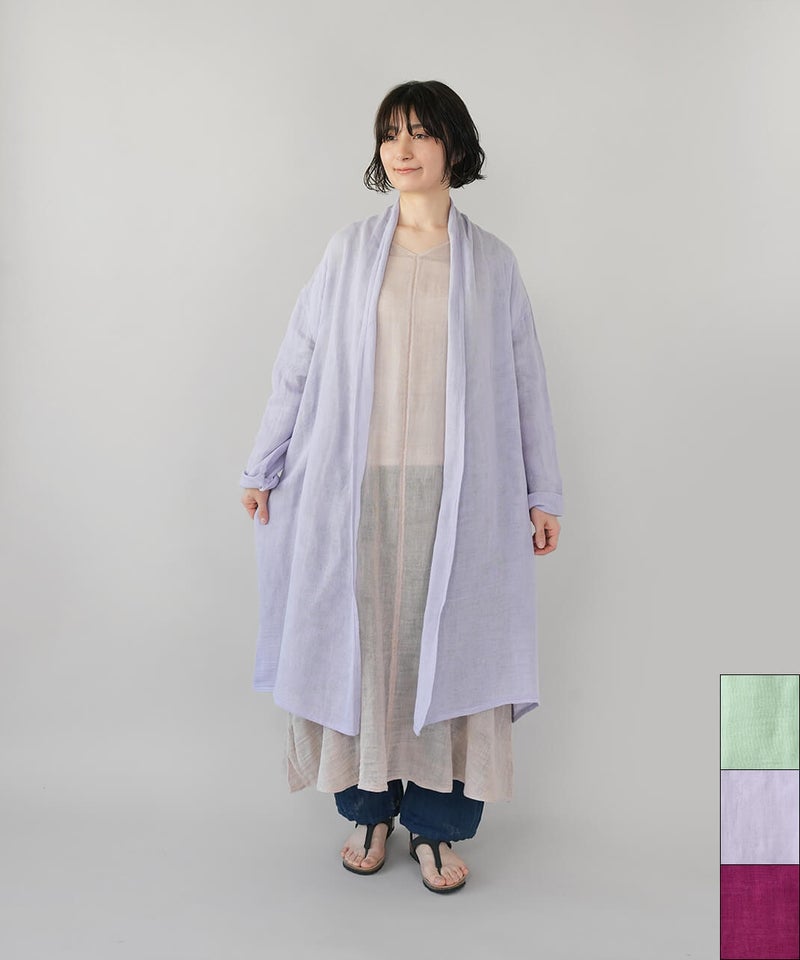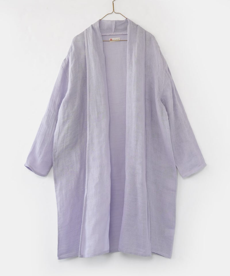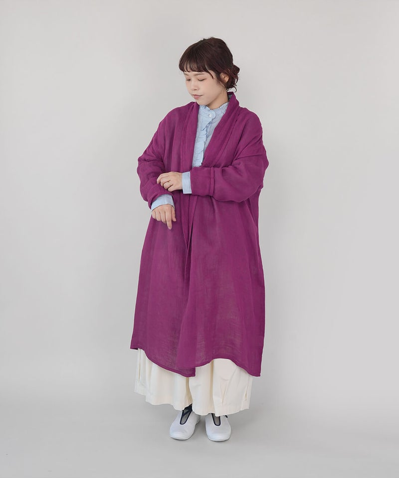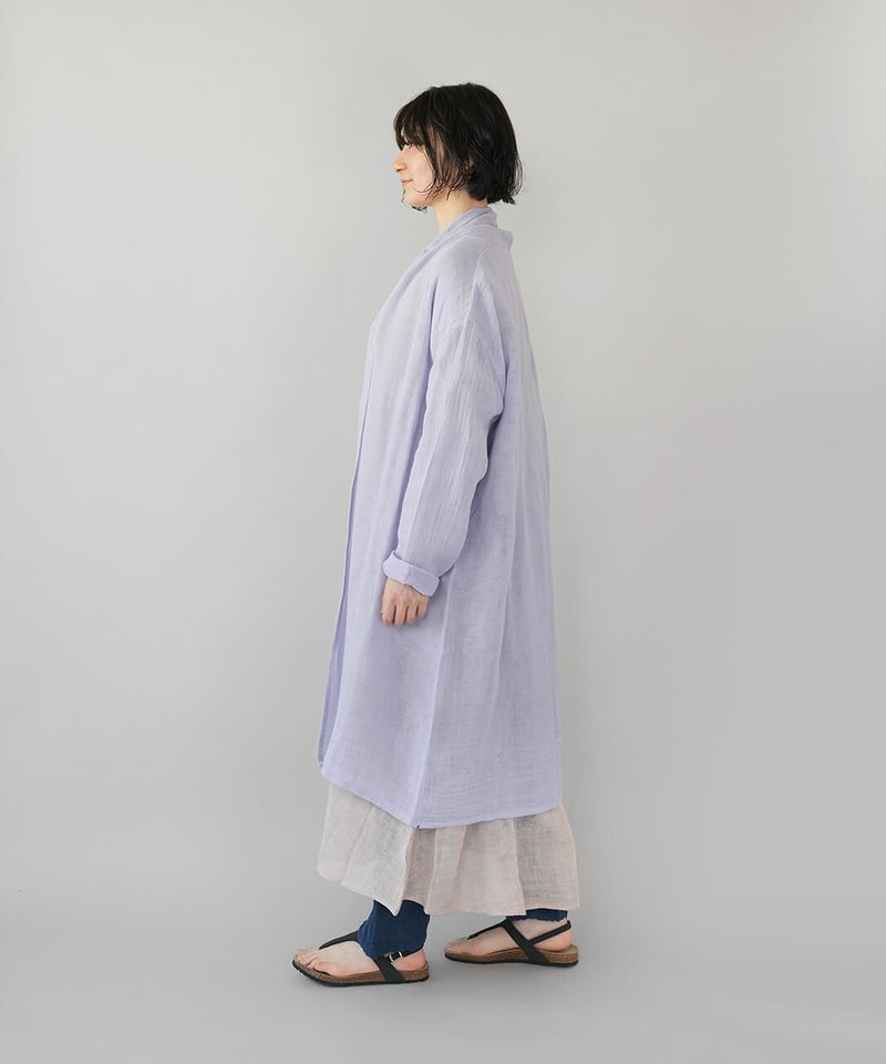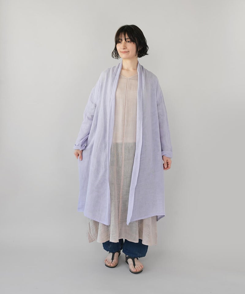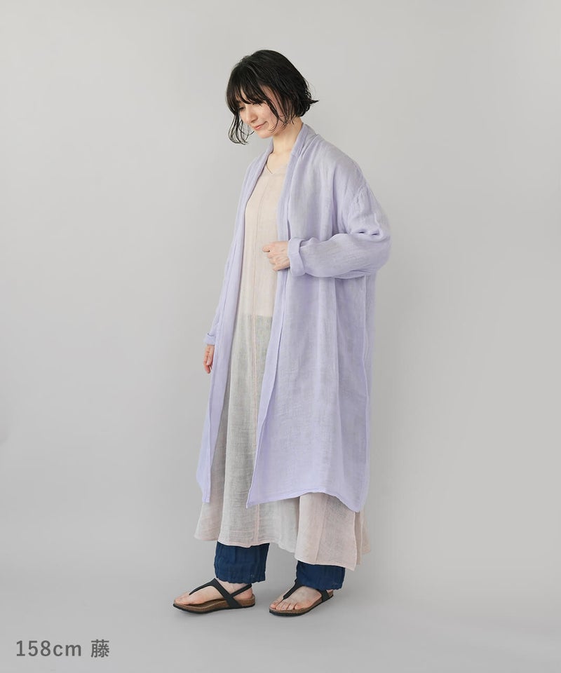 コットン100%の蚊帳生地をたっぷりと使用したカーディガンです。首元をやさしく包み込むショールカラーが、自然なドレープを生み、ふんわりとしたシルエットに。軽やかでさっと羽織れる気軽さも魅力。首まわりのうっかり日焼けをさりげなく防いでくれるのもうれしいポイントです。やさしいカラー展開で、コーディネートのアクセントとしても活躍します。●特徴・お取り扱いについて●初めてご使用になる際は糊がついておりますので、水またはぬるま湯で洗ってからご使用ください。洗うと収縮しますが、何回も洗ううちにふんわりとした風合いが出て馴染んでいきます。蚊帳生地独特の風合いをお楽しみください。蚊帳生地は織り目が粗い素材のため、縫製後に行う製品洗いの過程で生地が収縮し、お届け時のサイズには表記より3~4cm程度の個体差が生じる場合がございます。収縮の程度は、色によって異なることがございます。また、ご家庭でのお洗濯やご使用により、さらに寸法に変化が生じます。あらかじめご了承ください。表面のシワは、蚊帳生地特有の風合いとしてお楽しみください。洗うほどにやわらかくなる、コットン100%の蚊帳生地を2枚重ねています。ご使用の際は、表面の引っかかりにご注意ください。漂白剤はご使用いただけません。天然繊維のため、多少色落ちする場合がございます。●蚊帳生地の特徴●もともと寝る際の蚊よけとして吊られていた蚊帳に使われていた生地です。織り目が粗く、風通しの良い素材です。空気を通すために糸と糸の間を広くとって織り上げる製法で、非常に軽く、やわらかさに富んでいます。なお、織物のため伸縮性はありません。●蚊帳生地の歴史●奈良の地場産業である蚊帳は、江戸時代より盛んに生産され、現在も受け継がれています。蚊帳は中国から伝わり、当初は貴族などが使用していましたが、江戸時代には庶民にも広く普及しました。