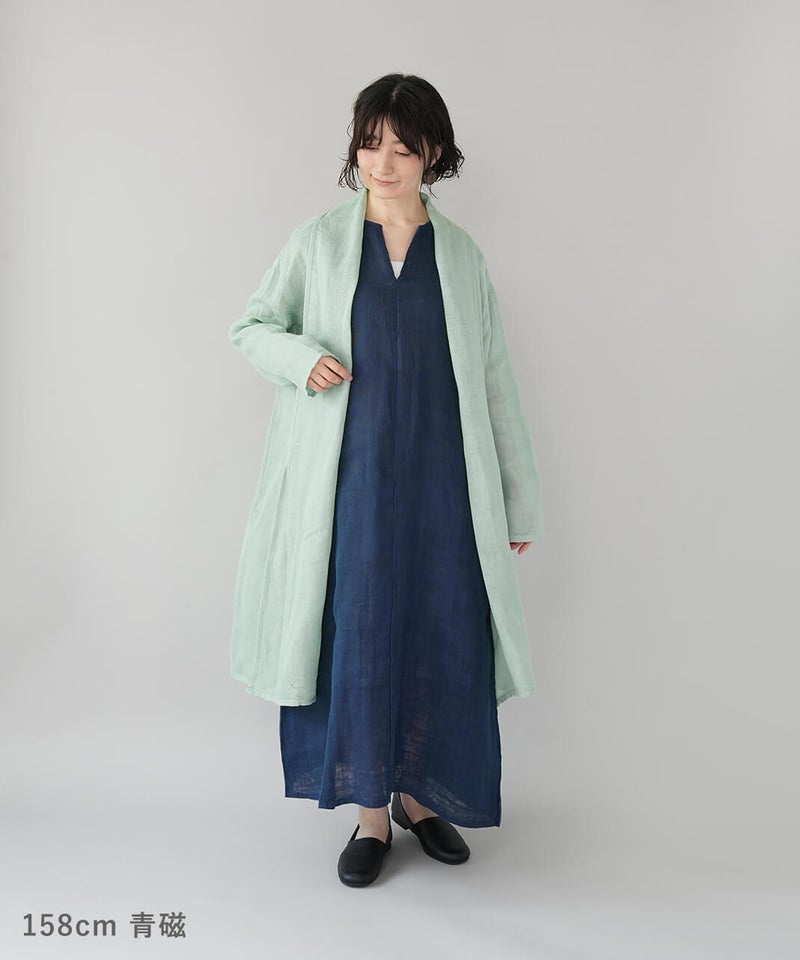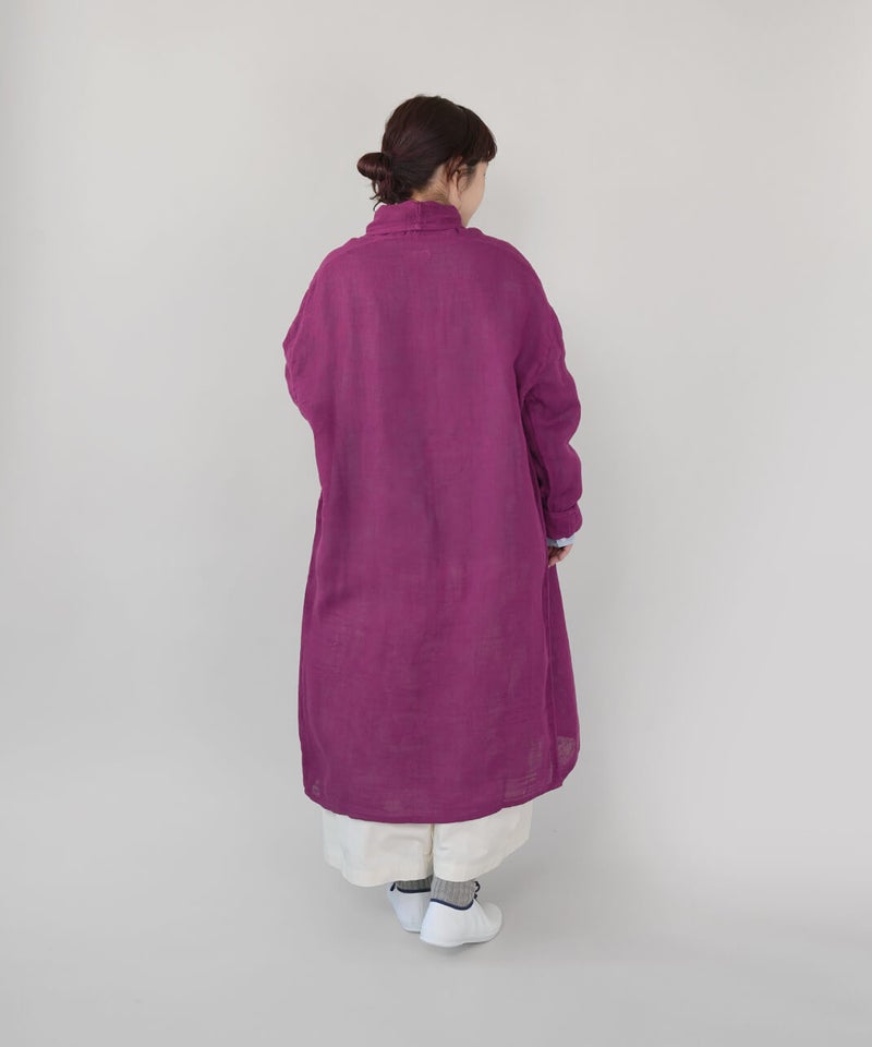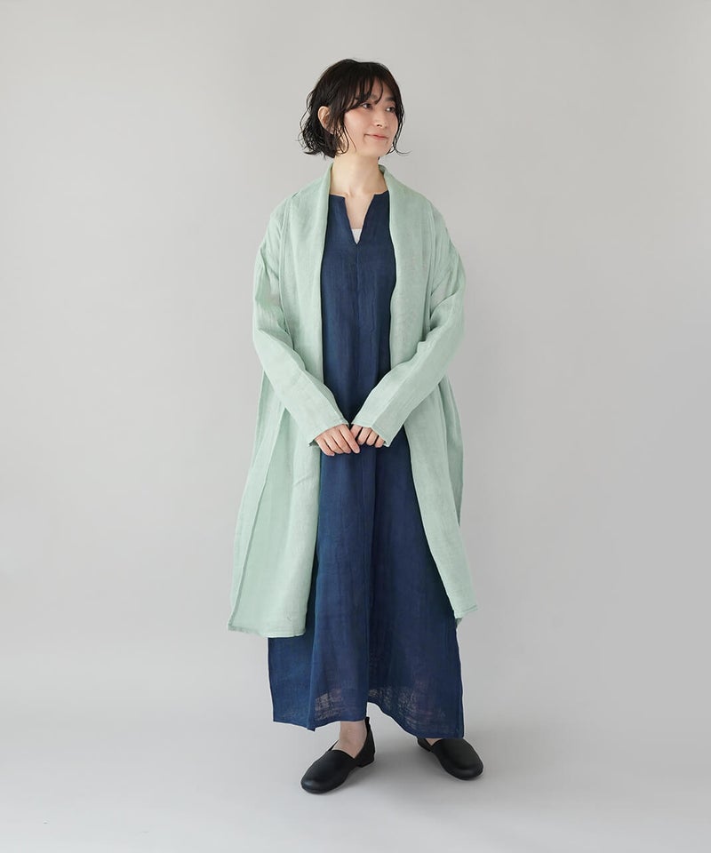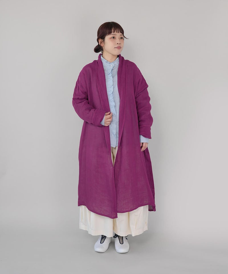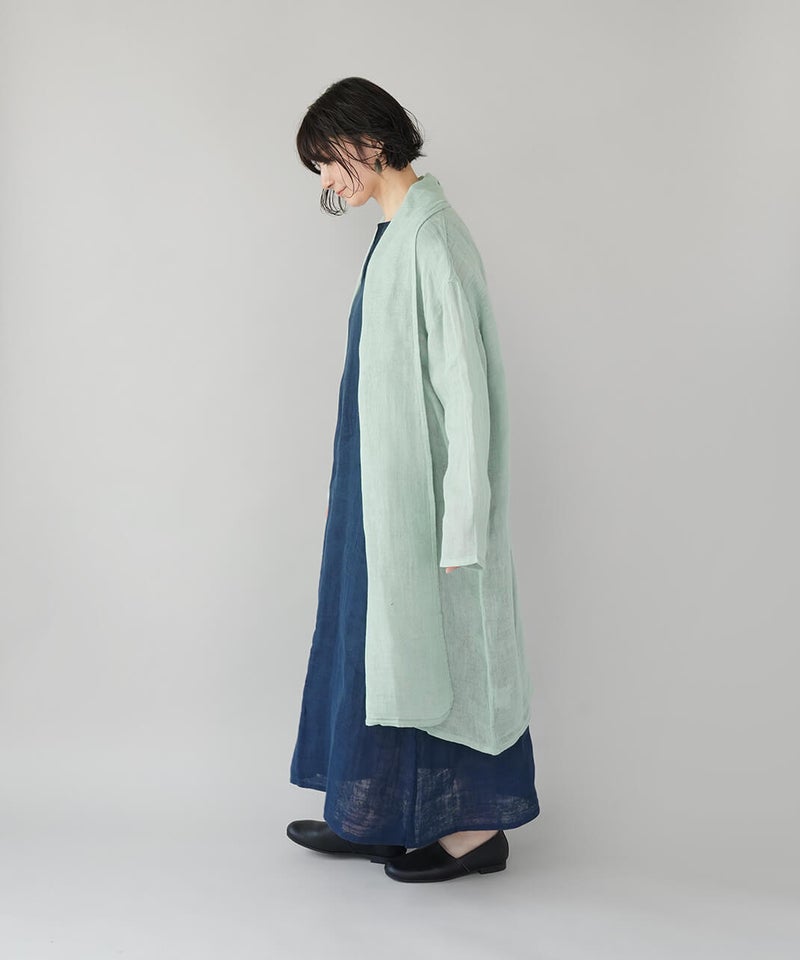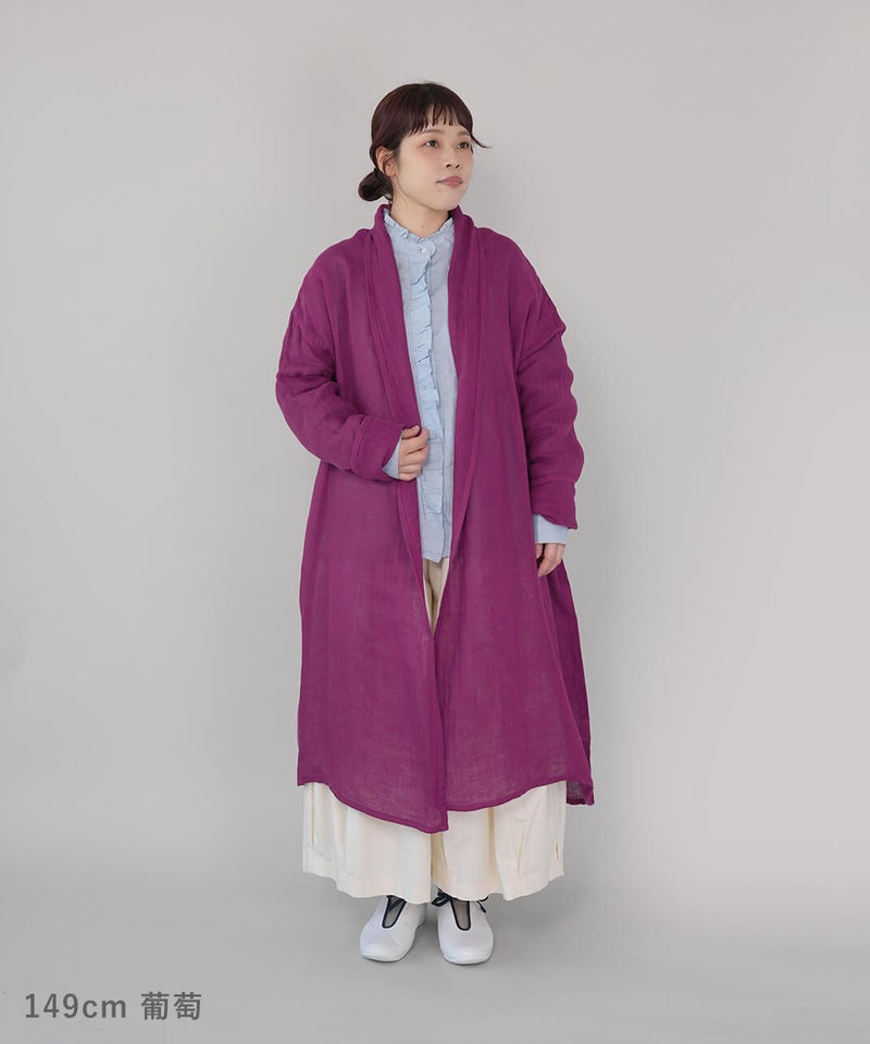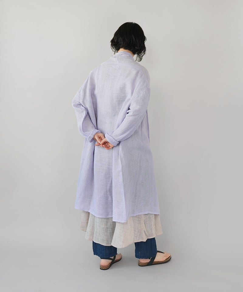 コットン100%の蚊帳生地をたっぷりと使用したカーディガンです。首元をやさしく包み込むショールカラーが、自然なドレープを生み、ふんわりとしたシルエットに。軽やかでさっと羽織れる気軽さも魅力。首まわりのうっかり日焼けをさりげなく防いでくれるのもうれしいポイントです。やさしいカラー展開で、コーディネートのアクセントとしても活躍します。●特徴・お取り扱いについて●初めてご使用になる際は糊がついておりますので、水またはぬるま湯で洗ってからご使用ください。洗うと収縮しますが、何回も洗ううちにふんわりとした風合いが出て馴染んでいきます。蚊帳生地独特の風合いをお楽しみください。蚊帳生地は織り目が粗い素材のため、縫製後に行う製品洗いの過程で生地が収縮し、お届け時のサイズには表記より3~4cm程度の個体差が生じる場合がございます。収縮の程度は、色によって異なることがございます。また、ご家庭でのお洗濯やご使用により、さらに寸法に変化が生じます。あらかじめご了承ください。表面のシワは、蚊帳生地特有の風合いとしてお楽しみください。洗うほどにやわらかくなる、コットン100%の蚊帳生地を2枚重ねています。ご使用の際は、表面の引っかかりにご注意ください。漂白剤はご使用いただけません。天然繊維のため、多少色落ちする場合がございます。●蚊帳生地の特徴●もともと寝る際の蚊よけとして吊られていた蚊帳に使われていた生地です。織り目が粗く、風通しの良い素材です。空気を通すために糸と糸の間を広くとって織り上げる製法で、非常に軽く、やわらかさに富んでいます。なお、織物のため伸縮性はありません。●蚊帳生地の歴史●奈良の地場産業である蚊帳は、江戸時代より盛んに生産され、現在も受け継がれています。蚊帳は中国から伝わり、当初は貴族などが使用していましたが、江戸時代には庶民にも広く普及しました。