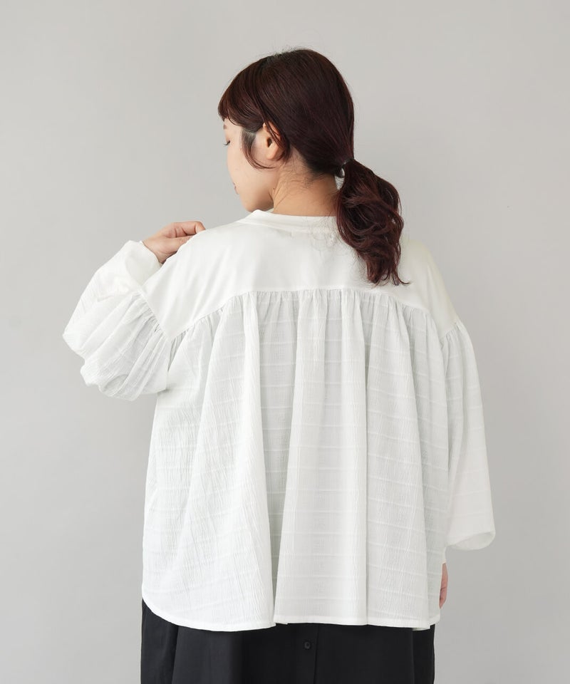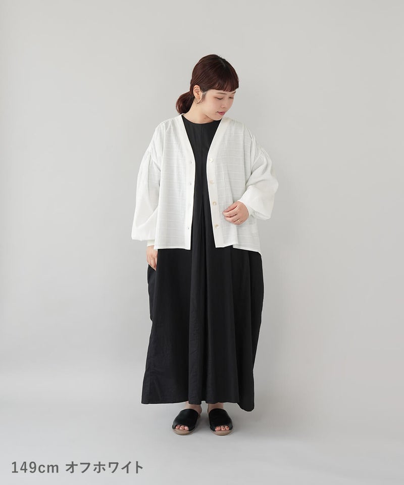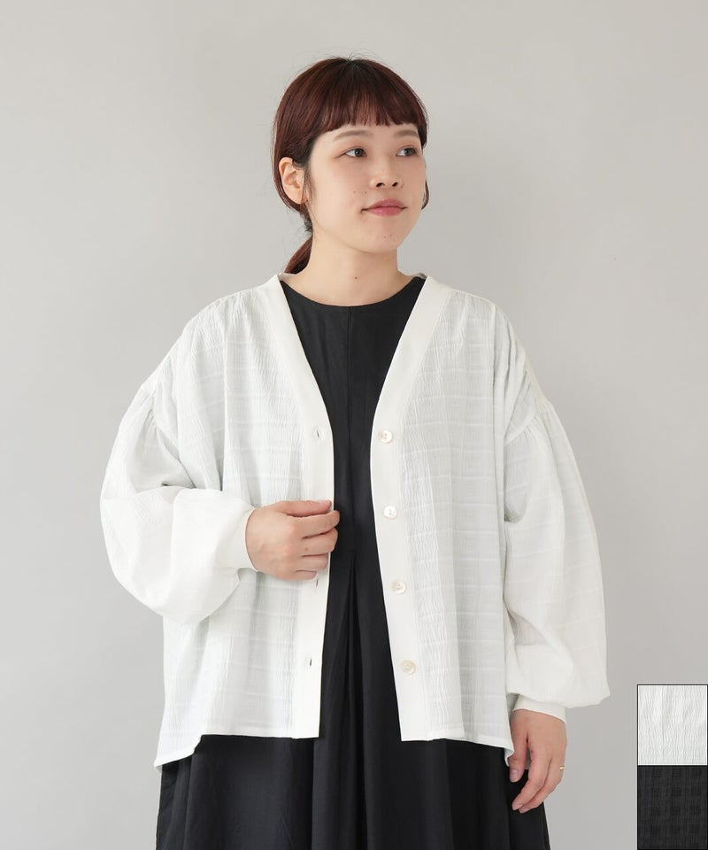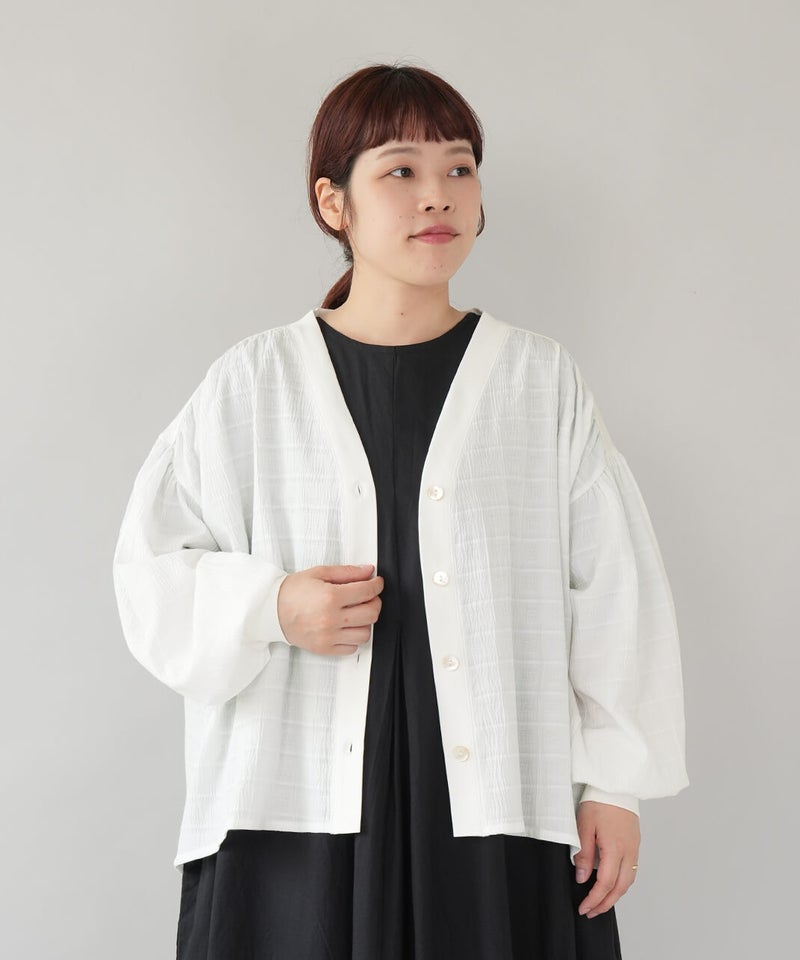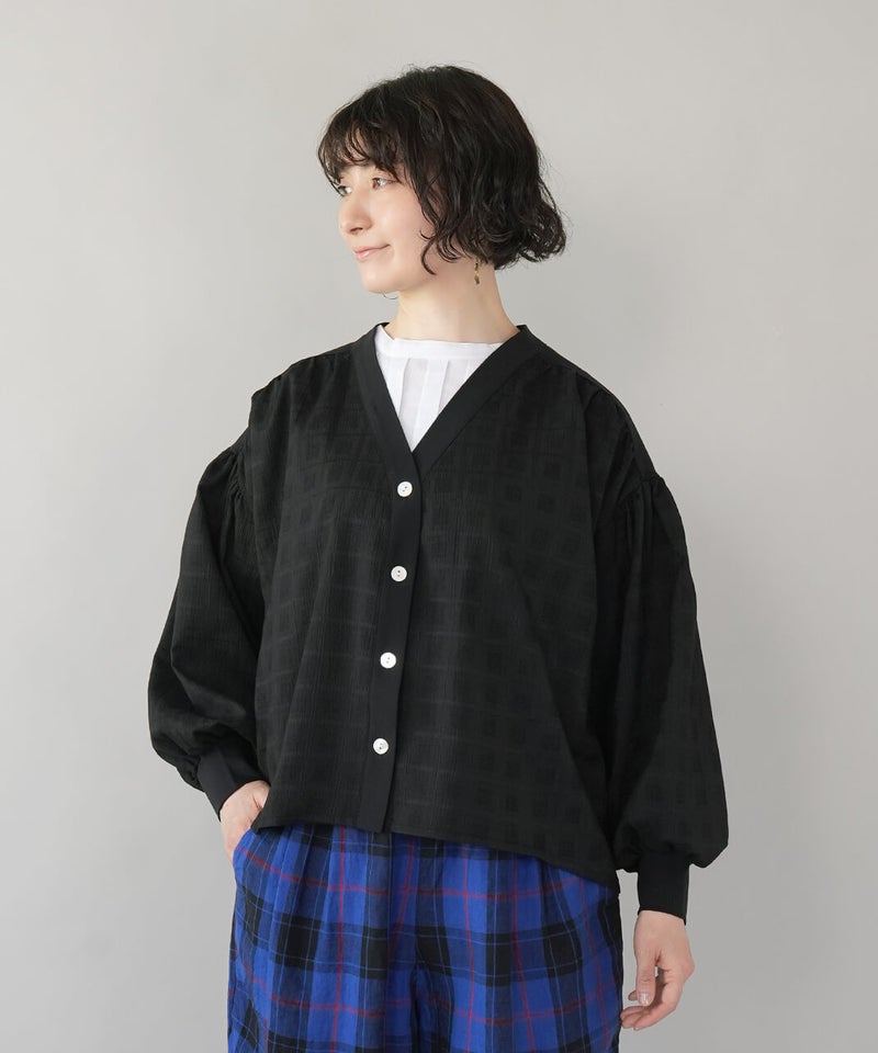 立体的なチェック柄のドビー織りの生地に、やわらかな光沢のさらりとしたフライス素材を組み合わせた、軽やかなカーディガンです。ギャザーを入れることでボリュームのあるシルエットの袖がポイント。首もとはすっきりとしたVネックに。異なる素材を合わせることで、羽織るだけで装いにアクセントを添えてくれます。後ろにもギャザーが施され、動きのあるやわらかなシルエットに。表情が感じられる1枚です。シンプルなコーディネートにも自然となじみながら、ほどよい存在感を添えてくれます。