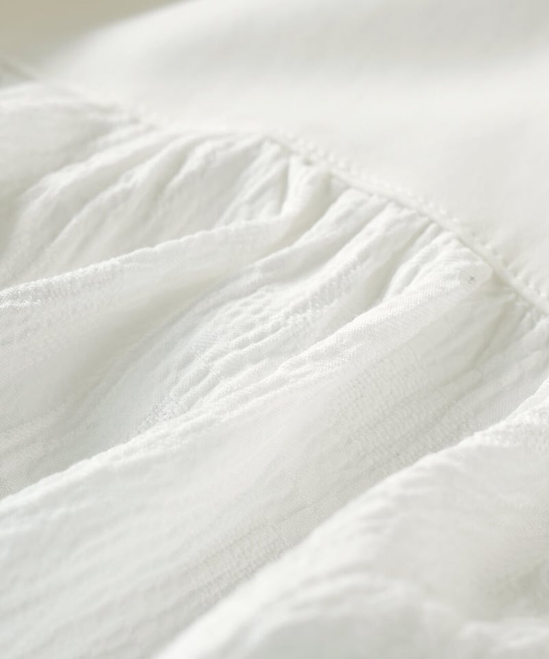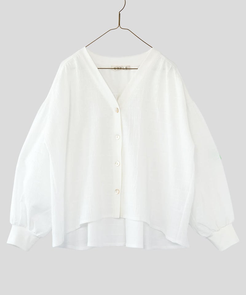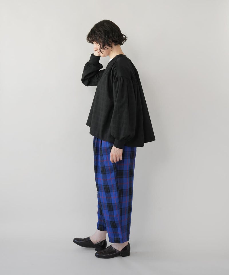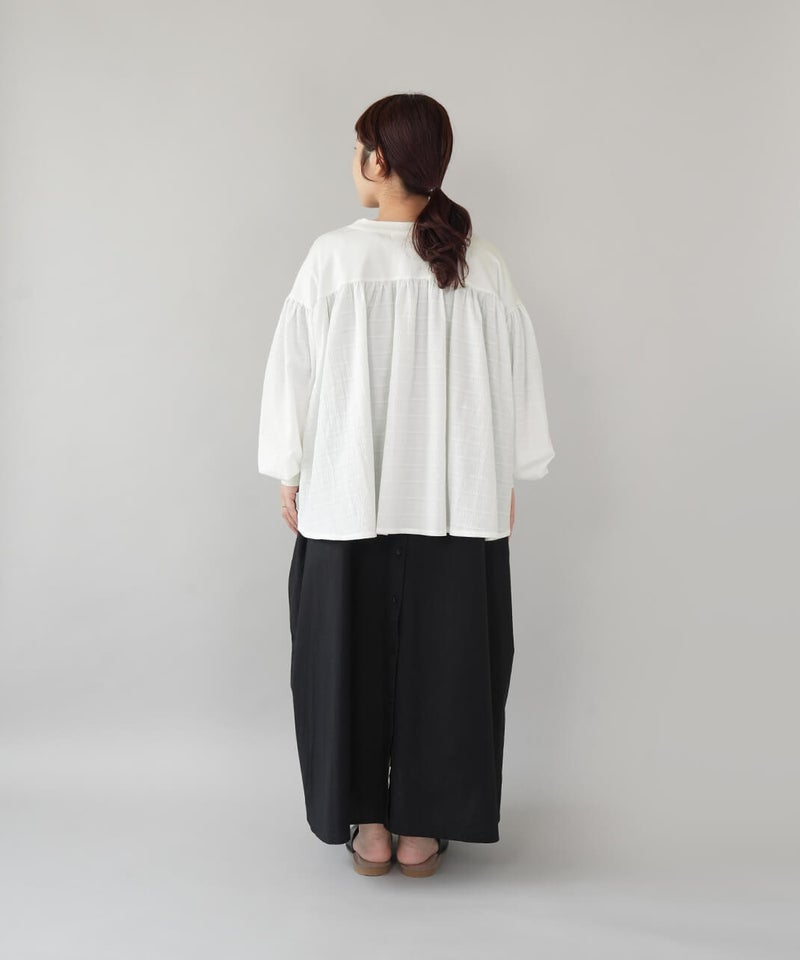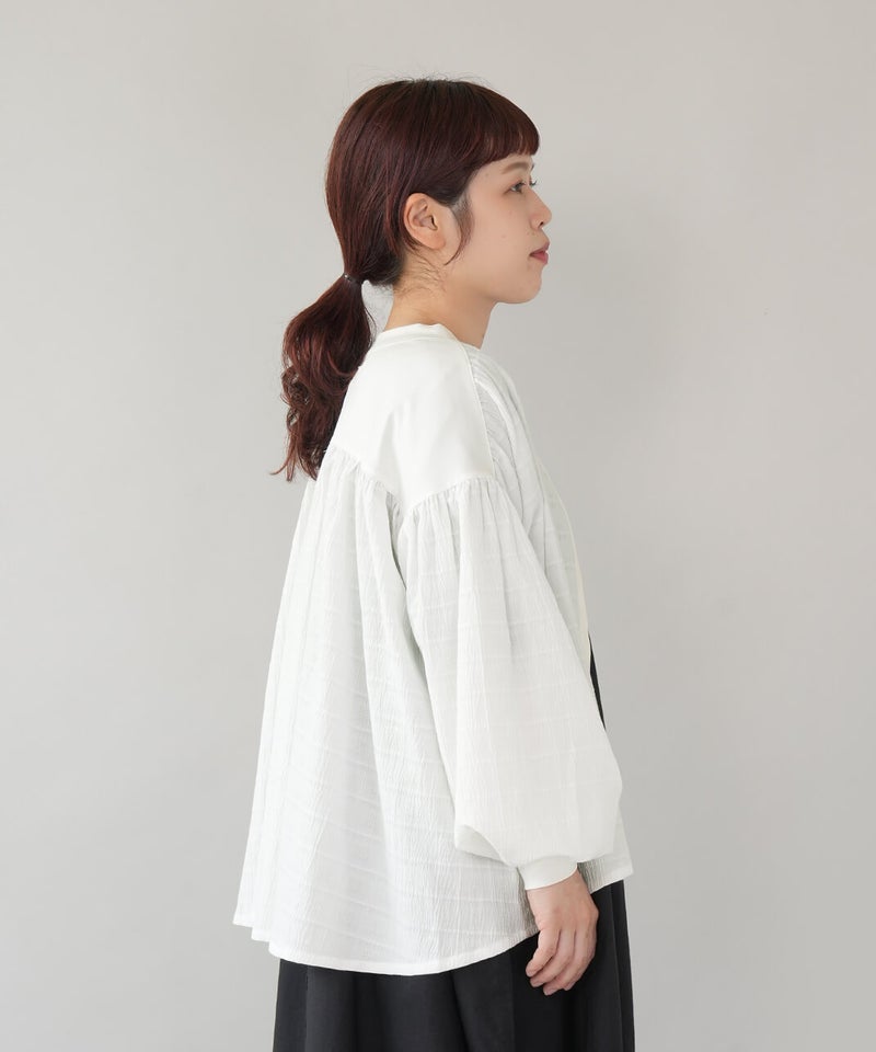 立体的なチェック柄のドビー織りの生地に、やわらかな光沢のさらりとしたフライス素材を組み合わせた、軽やかなカーディガンです。ギャザーを入れることでボリュームのあるシルエットの袖がポイント。首もとはすっきりとしたVネックに。異なる素材を合わせることで、羽織るだけで装いにアクセントを添えてくれます。後ろにもギャザーが施され、動きのあるやわらかなシルエットに。表情が感じられる1枚です。シンプルなコーディネートにも自然となじみながら、ほどよい存在感を添えてくれます。