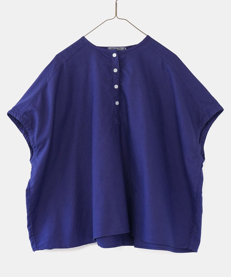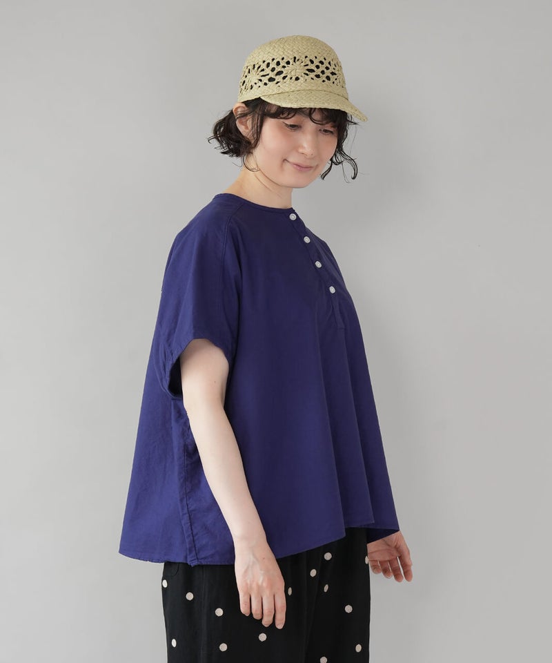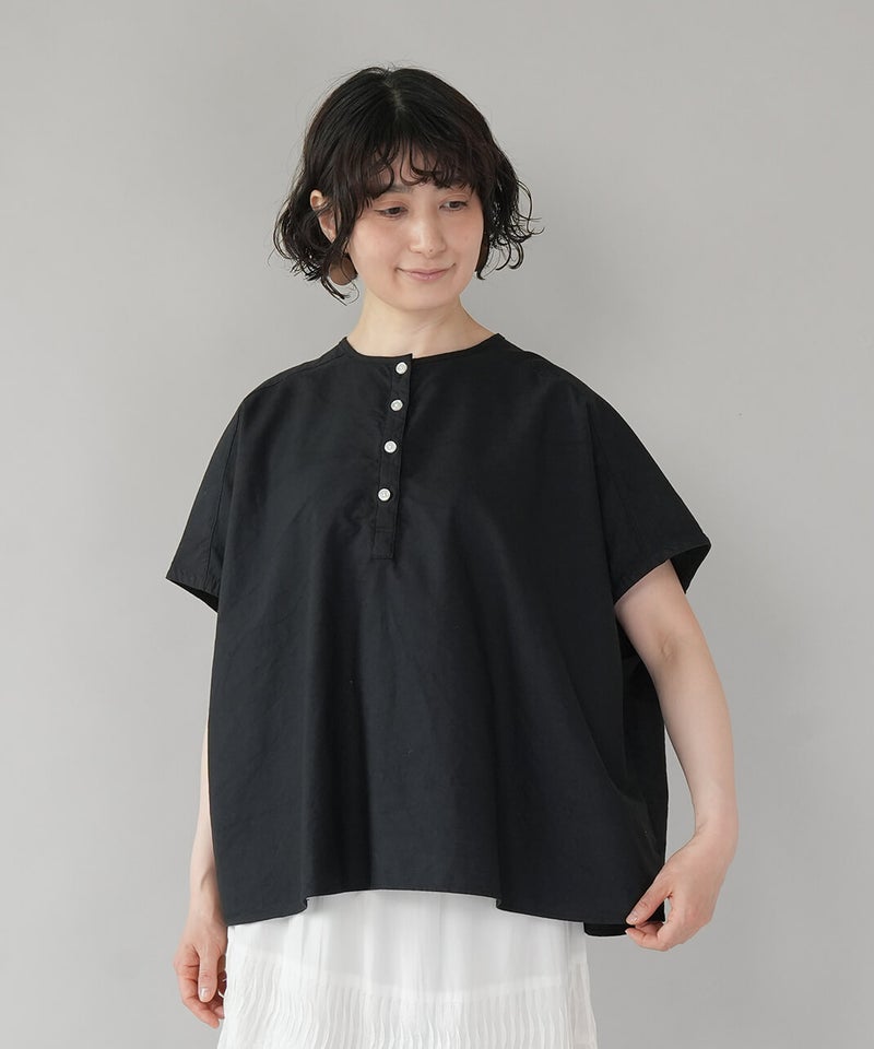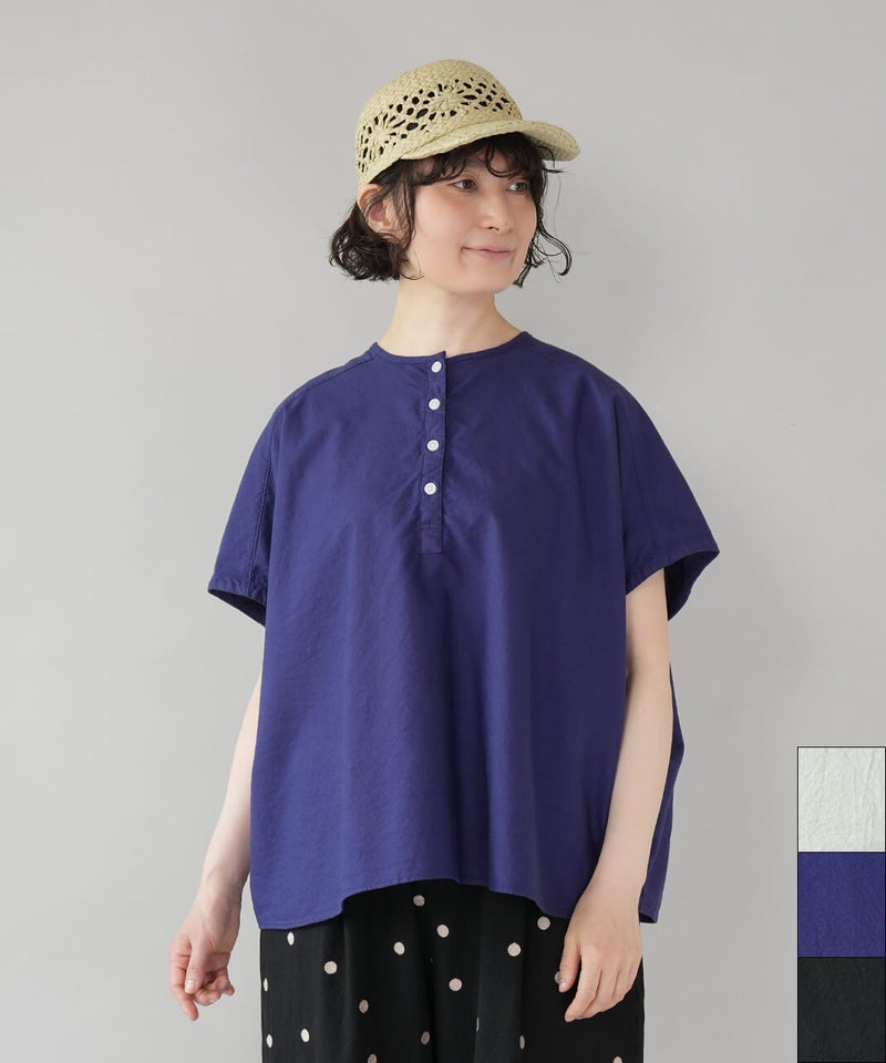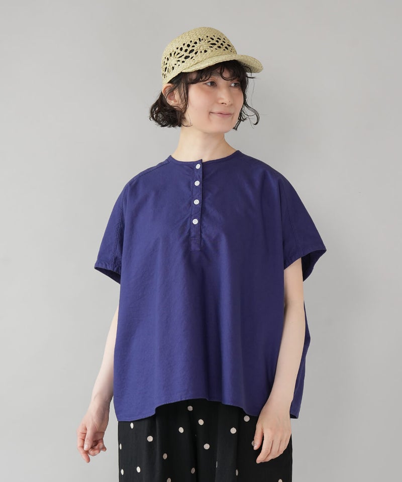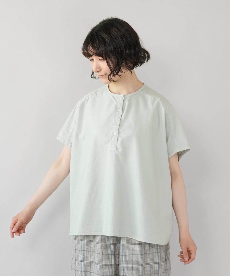 丈夫なオックス生地に製品染めを施して、ナチュラルな風合いに仕上げたブラウスです。やわらかく肌になじむ着心地で、シンプルで毎日手に取りたくなる1着です。肩まわりはワイドなフレンチスリーブにして、ゆったりとしたボックスシルエットに。首もとはシンプルなヘンリーネック。さりげない抜け感があり、すっきりとした印象です。Tシャツのような感覚で気軽に着られるので、パンツにもスカートにも合わせやすく、コーディネートの幅も広がります。