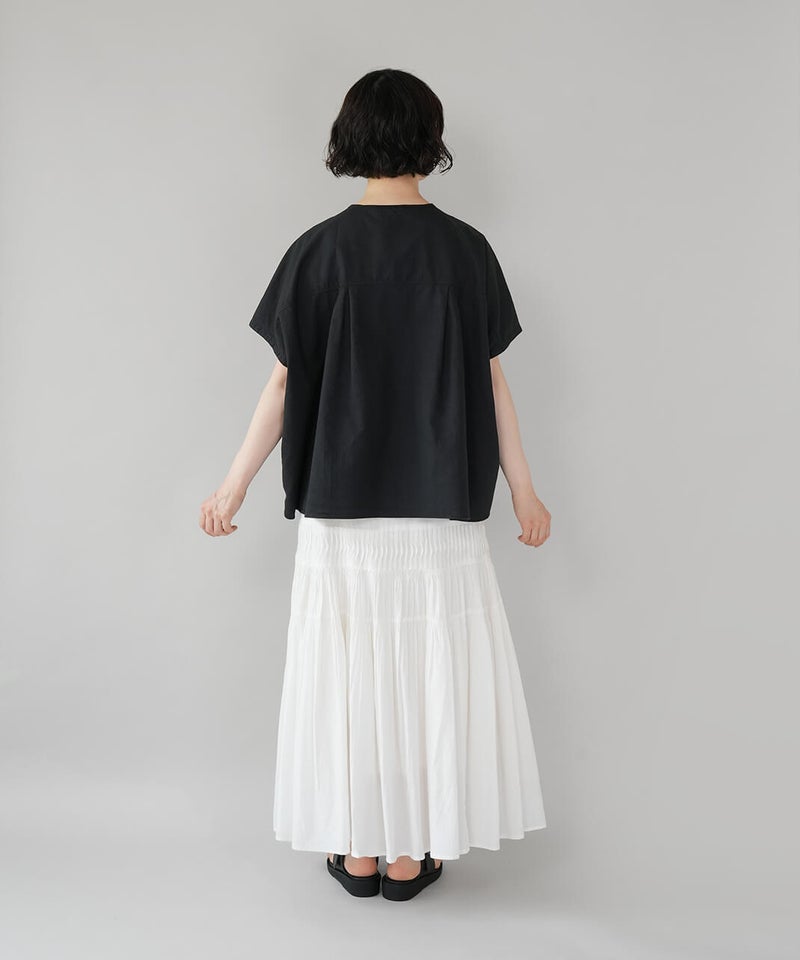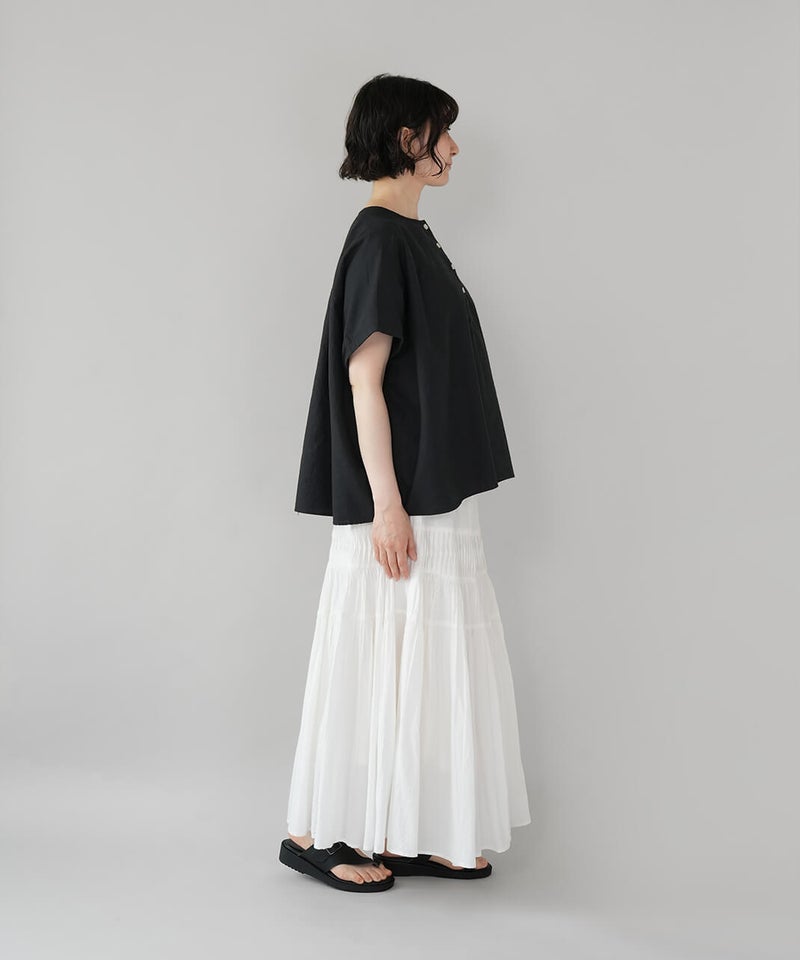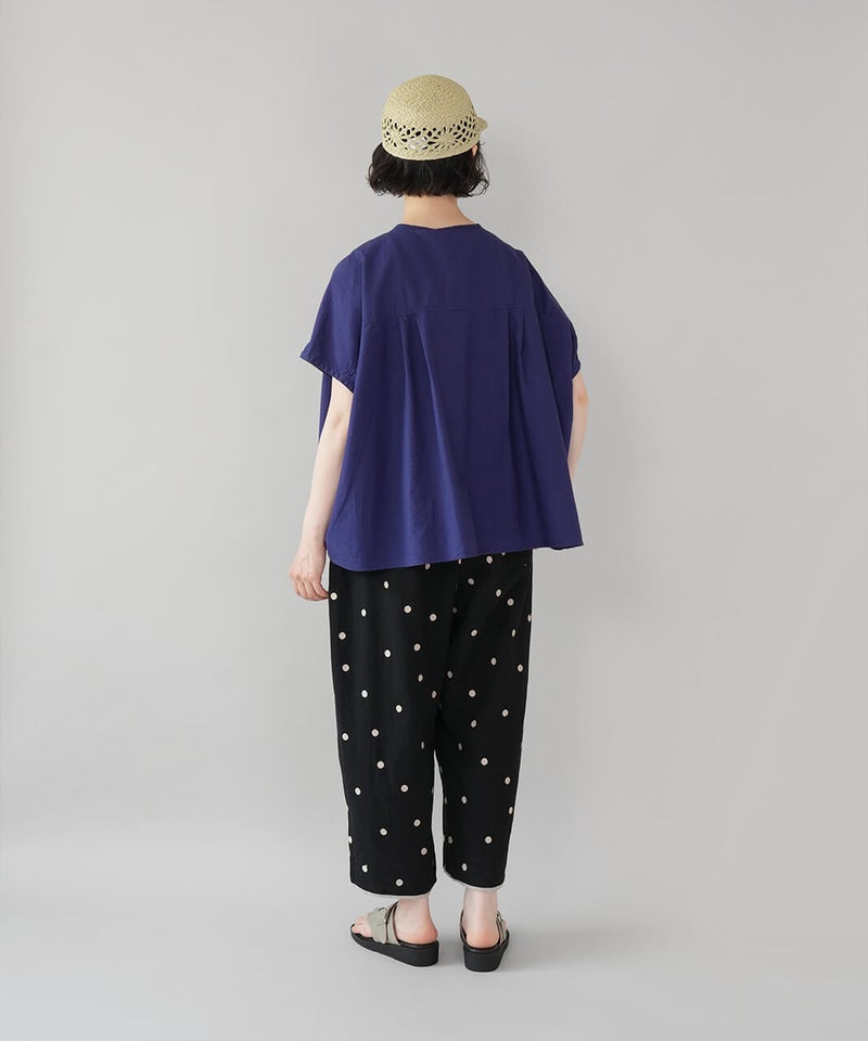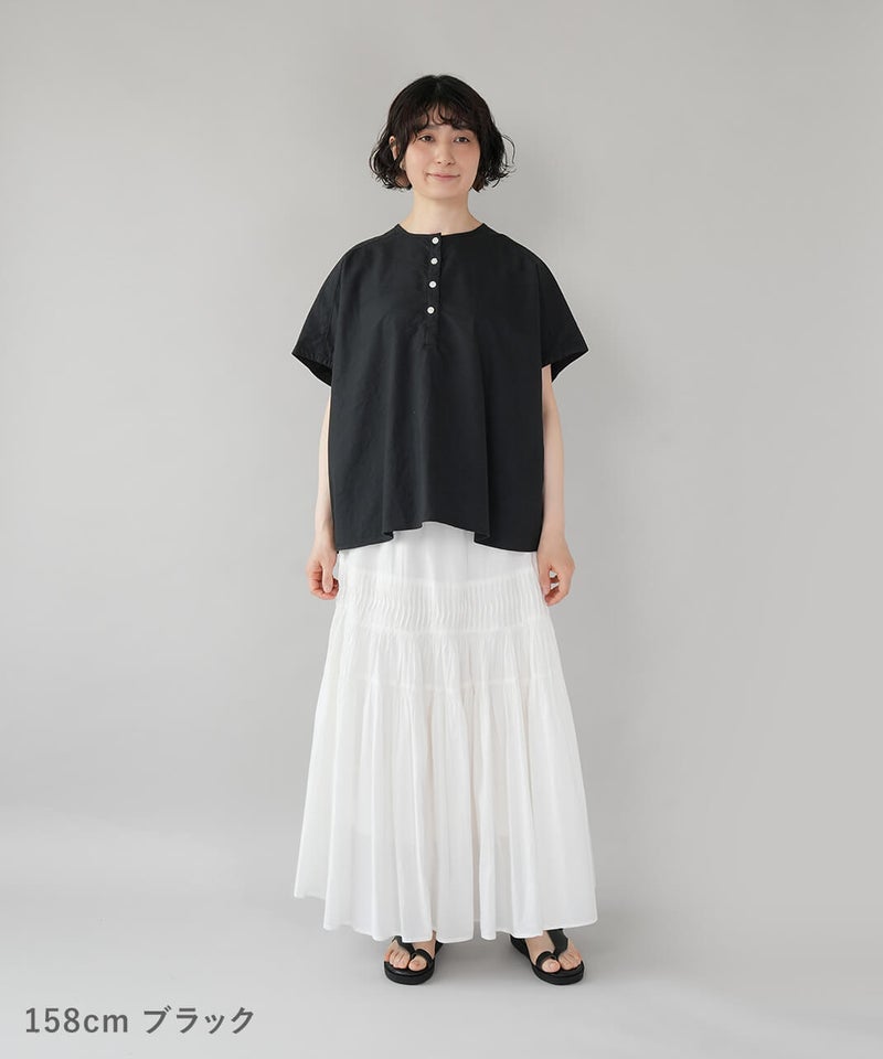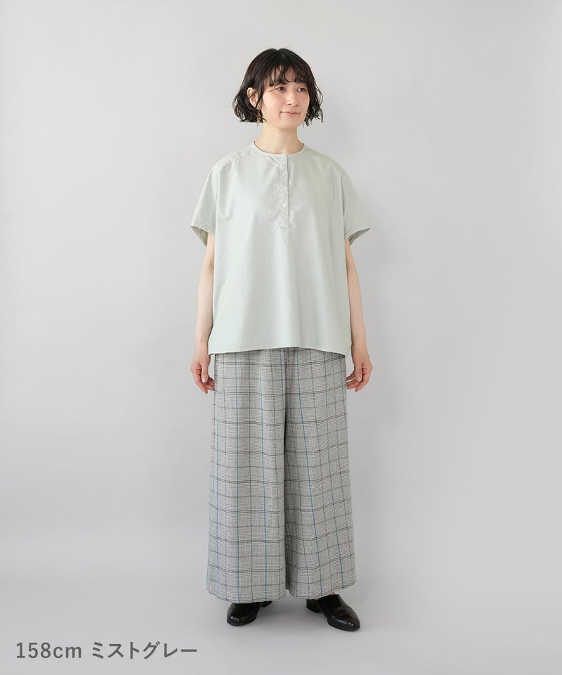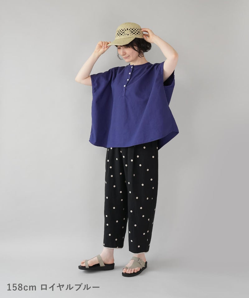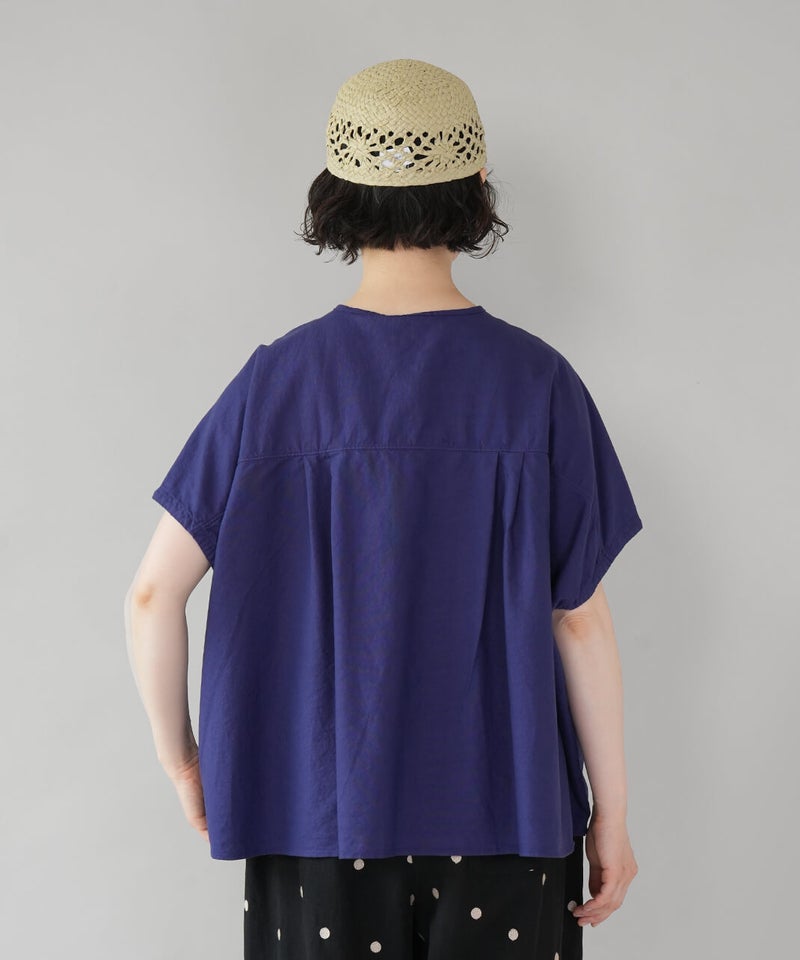 丈夫なオックス生地に製品染めを施して、ナチュラルな風合いに仕上げたブラウスです。やわらかく肌になじむ着心地で、シンプルで毎日手に取りたくなる1着です。肩まわりはワイドなフレンチスリーブにして、ゆったりとしたボックスシルエットに。首もとはシンプルなヘンリーネック。さりげない抜け感があり、すっきりとした印象です。Tシャツのような感覚で気軽に着られるので、パンツにもスカートにも合わせやすく、コーディネートの幅も広がります。