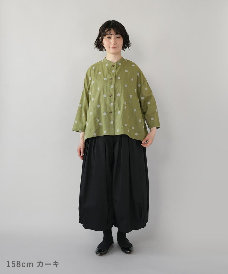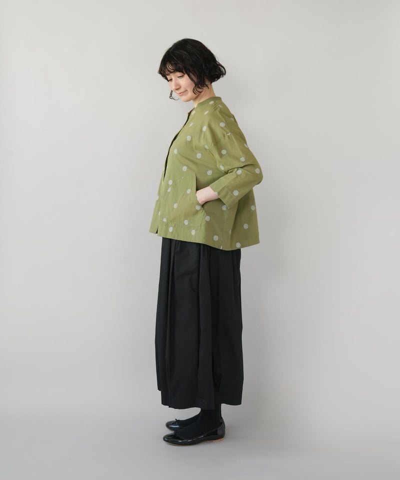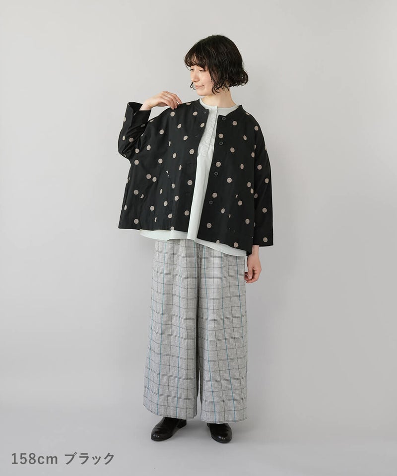 首もとはリブで切り替えて、ややカジュアルな印象に。大きめのボタンも、さりげないアクセントになっています。