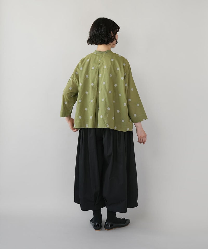 後ろにはタックを入れて、ふんわりと広がるやわらかなシルエットに。動くたびに表情が生まれ、後ろ姿まできれいに見せてくれます。