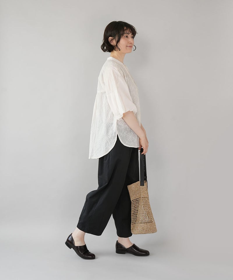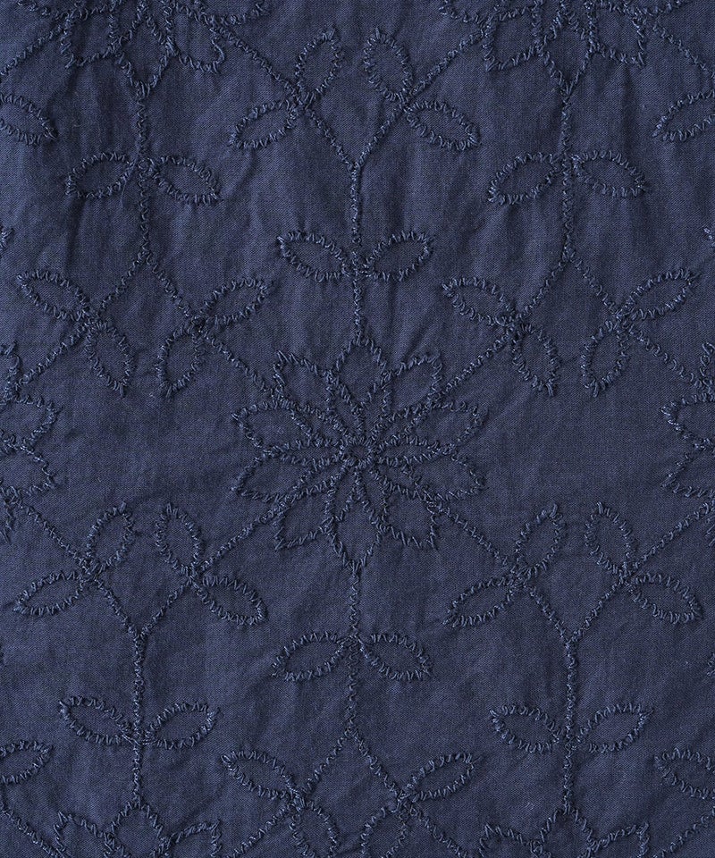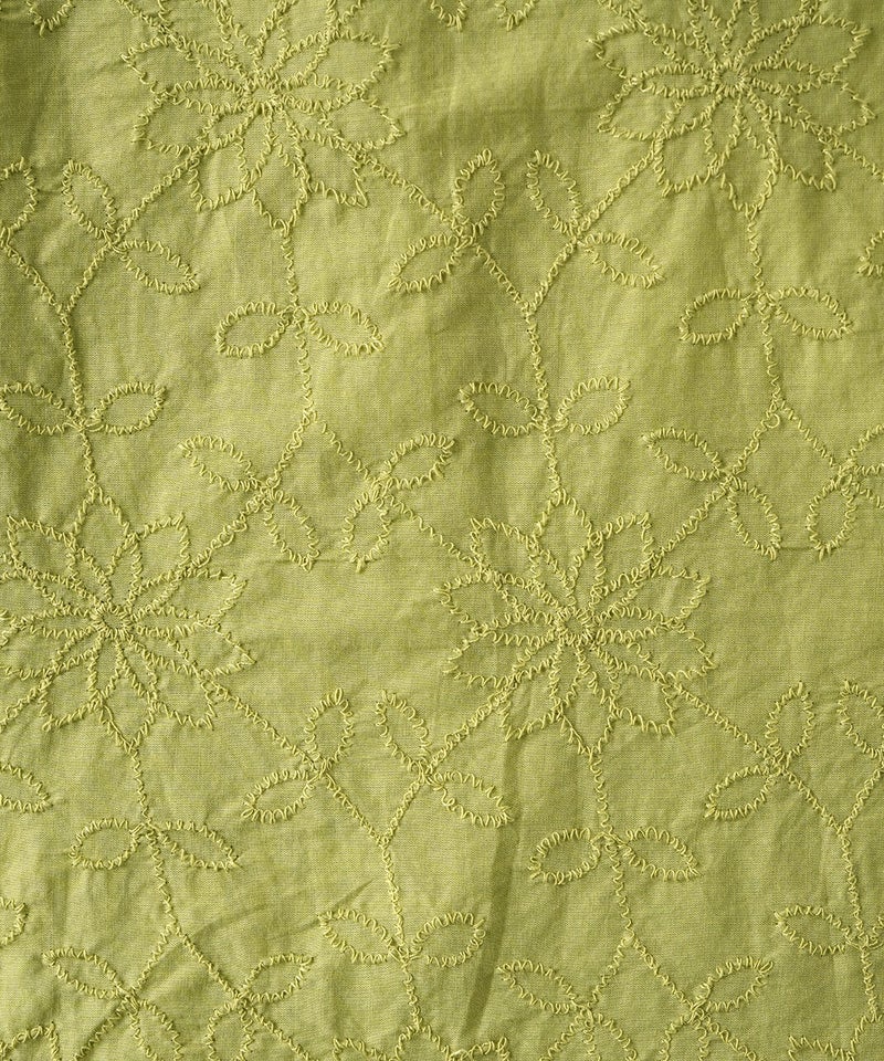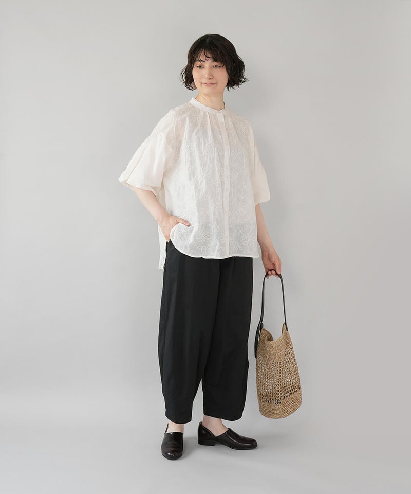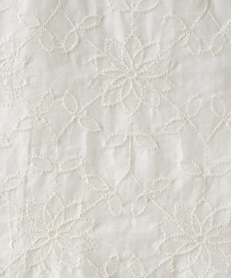 生地と同じ色であしらった花柄のシフリー刺繍が、ほんのりと甘さをプラスしてくれます。