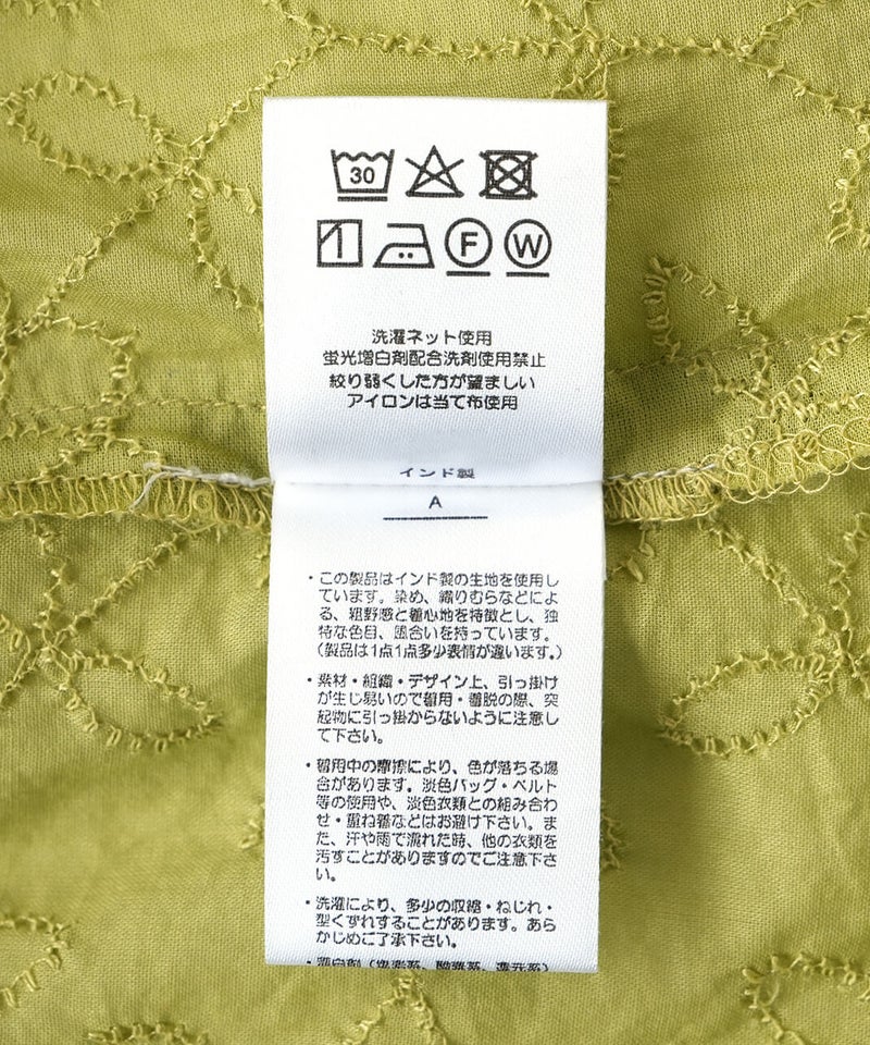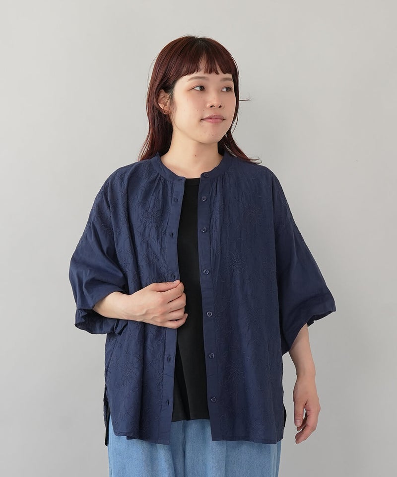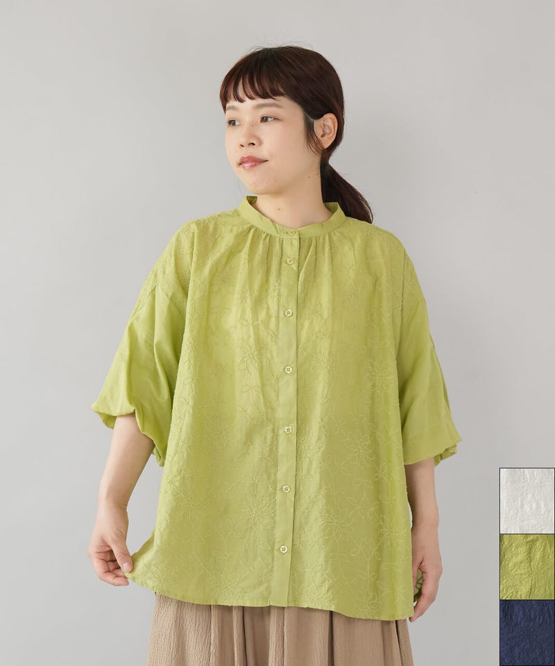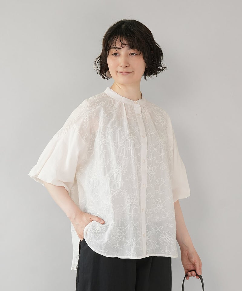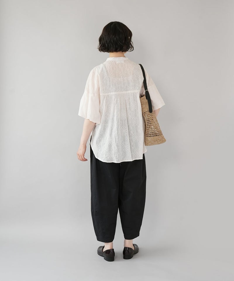 生地と同じ色であしらった花柄のシフリー刺繍が、ほんのりと甘さをプラスしてくれます。