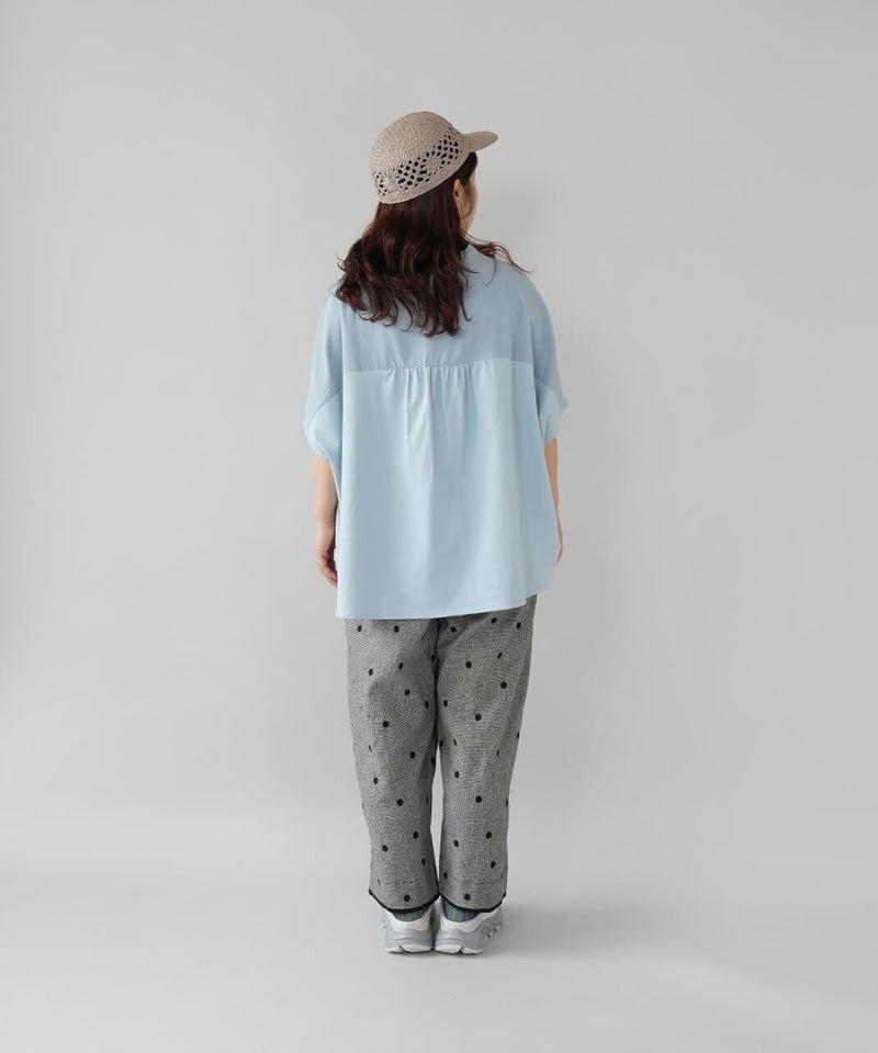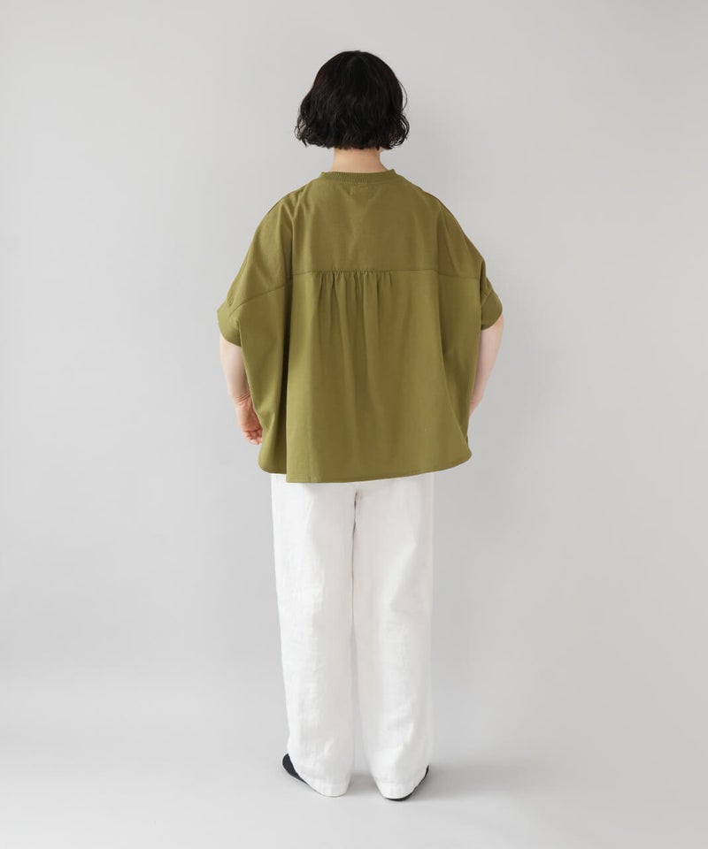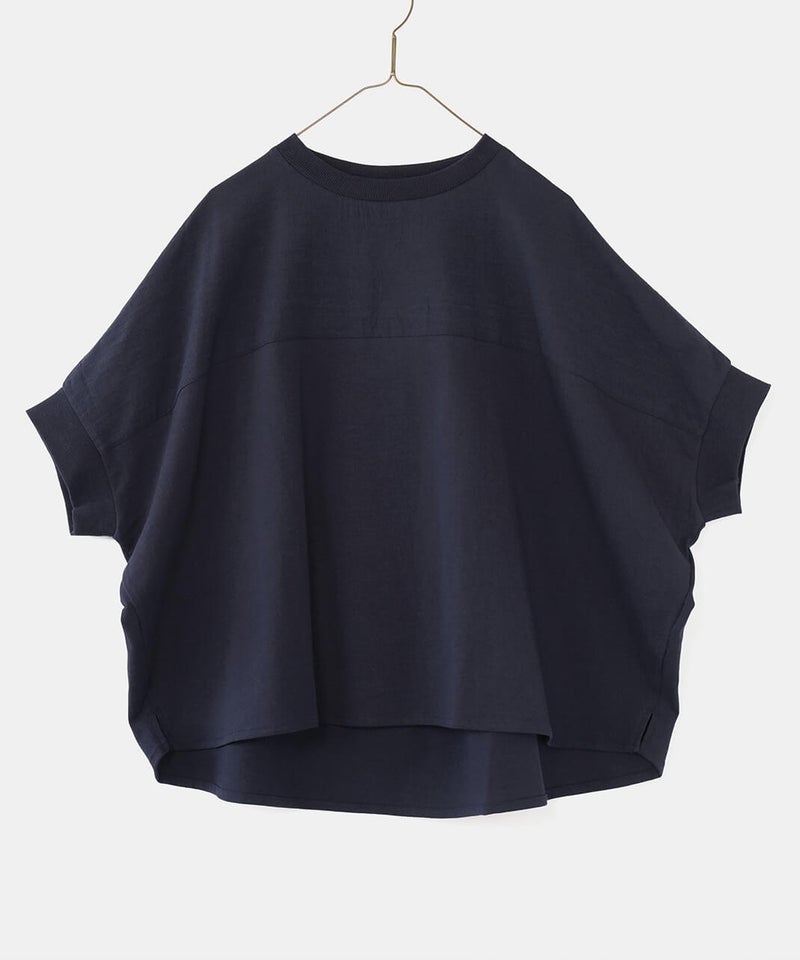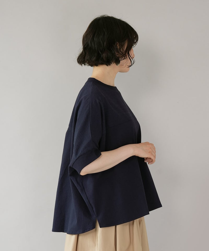 首もとはすっきりとしたクルーネック。袖はドルマンスリーブで、ゆったりとしたシルエットに仕上げました。