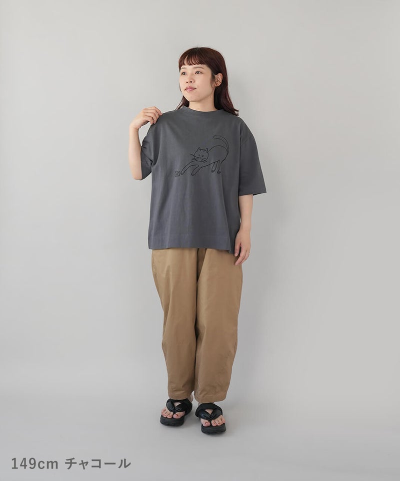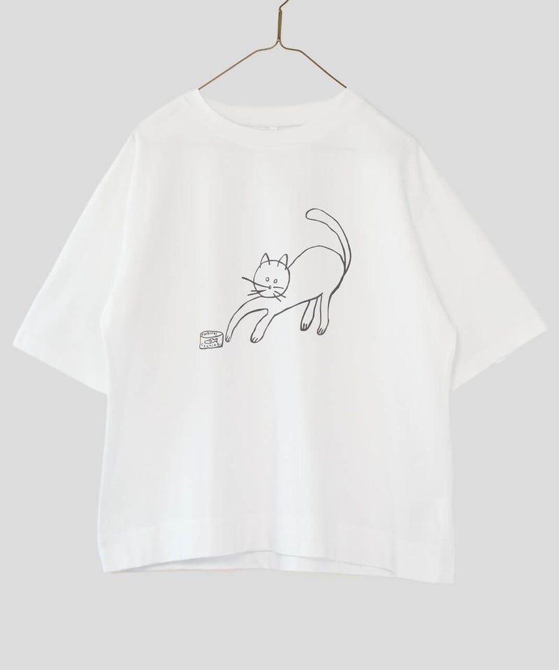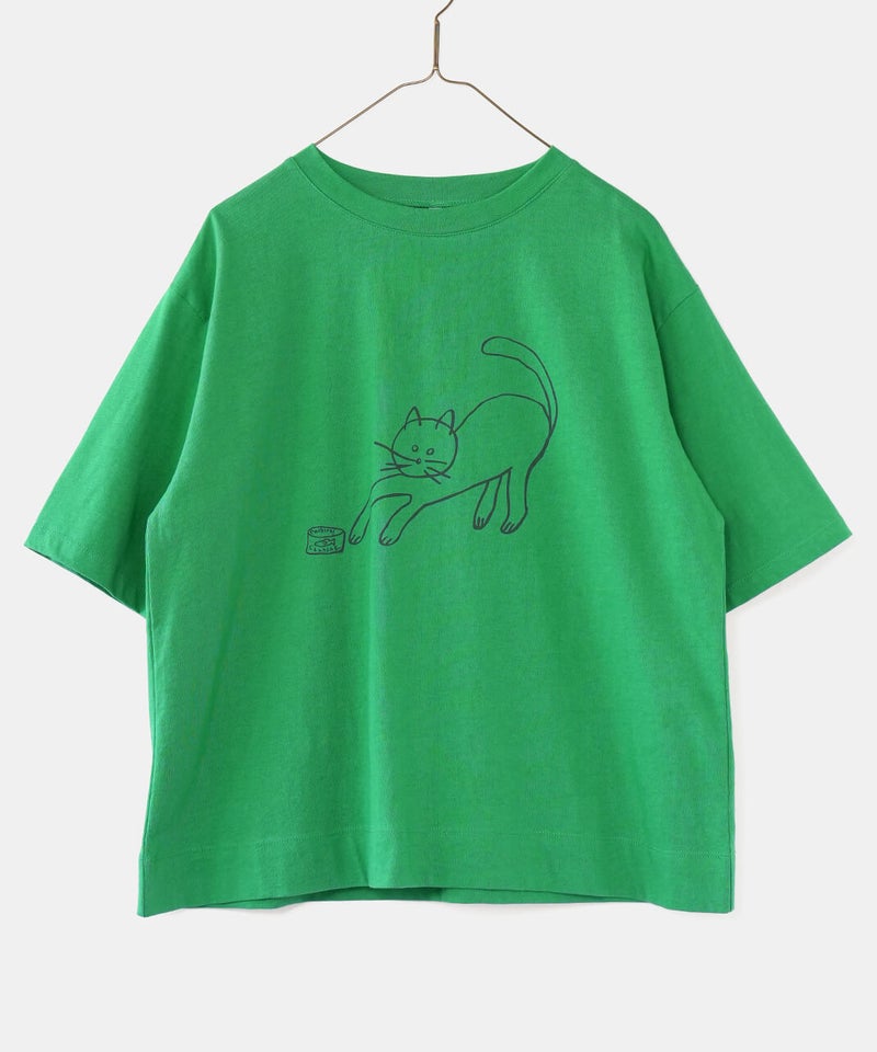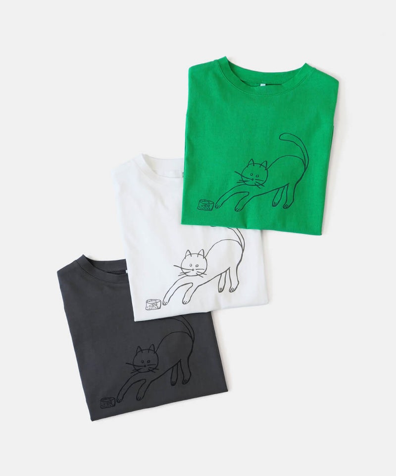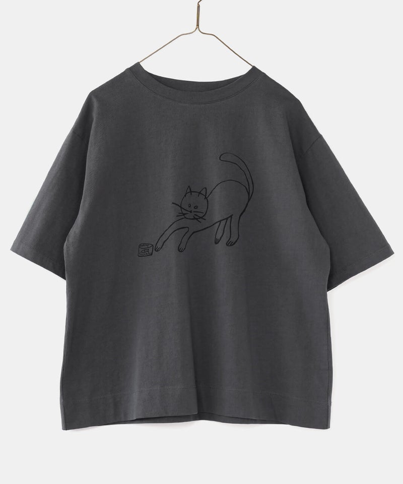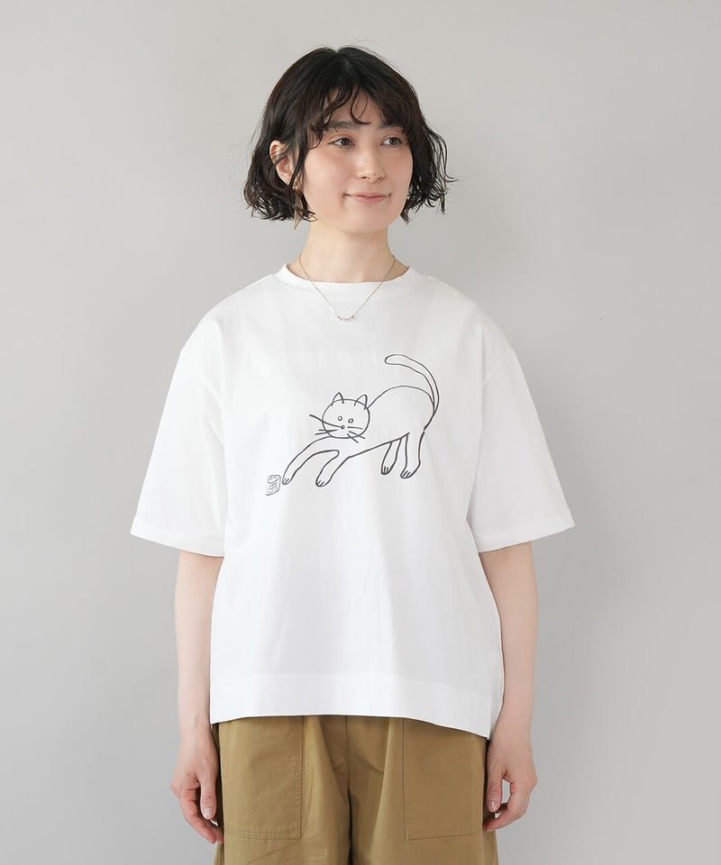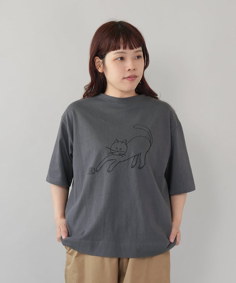 ふっくらとやわらかく、肌にやさしくなじむコットン素材のTシャツです。独特なムラ感やネップのある生地は、ほどよい表情があります。フロントには、手書き風の猫とサバ缶のモチーフのプリント。どこかとぼけた表情と、ゆるやかなタッチがさりげない遊び心を添えてくれます。伸縮性もあり、動きやすくリラックスした着心地。デニムやスカートに合わせて、肩の力を抜いて楽しめる大人のための猫Tシャツです。