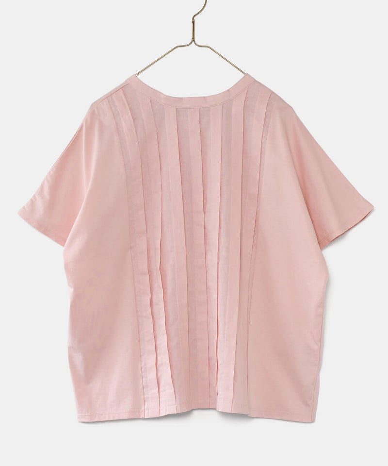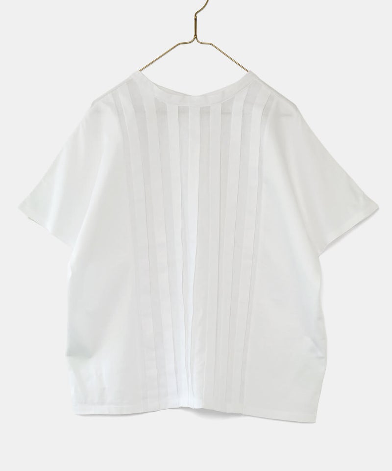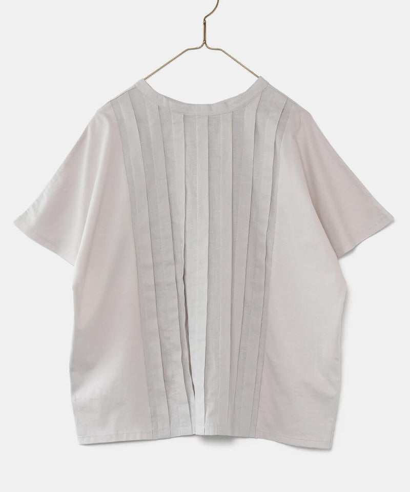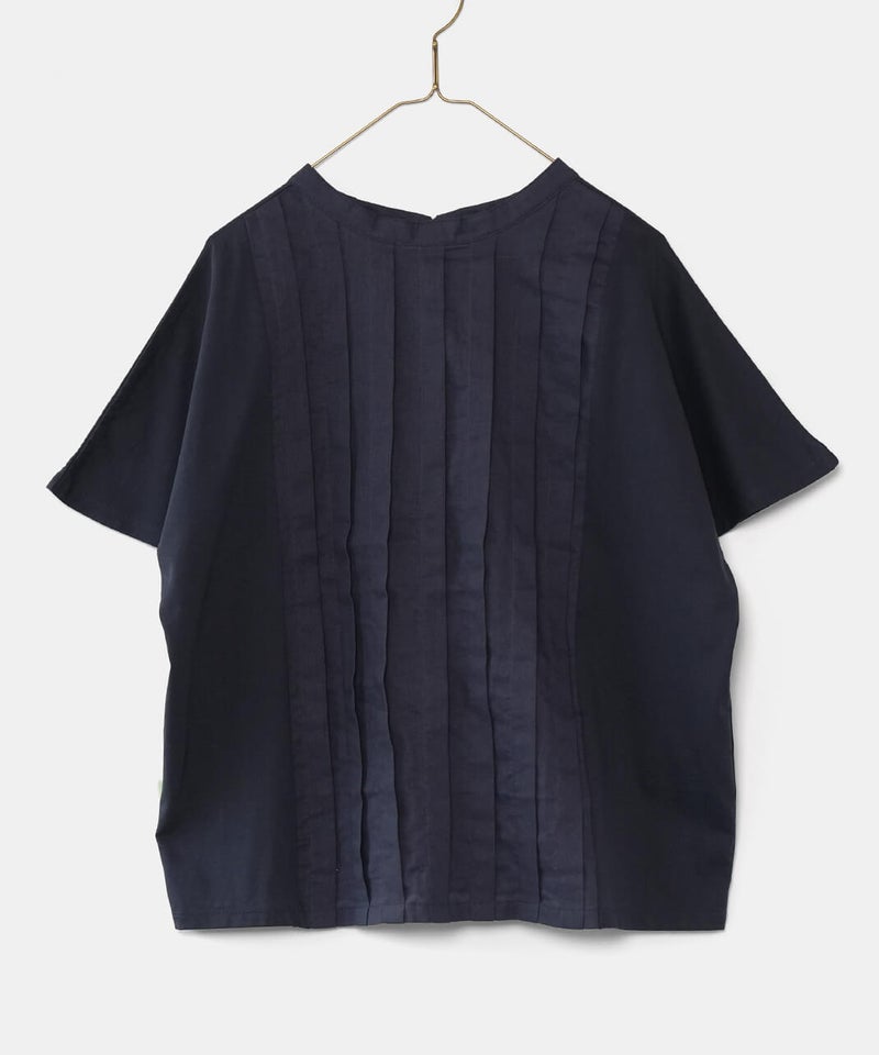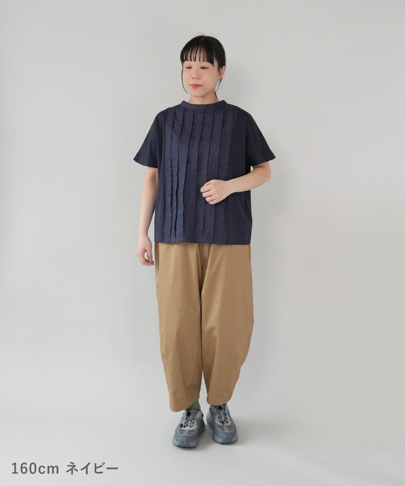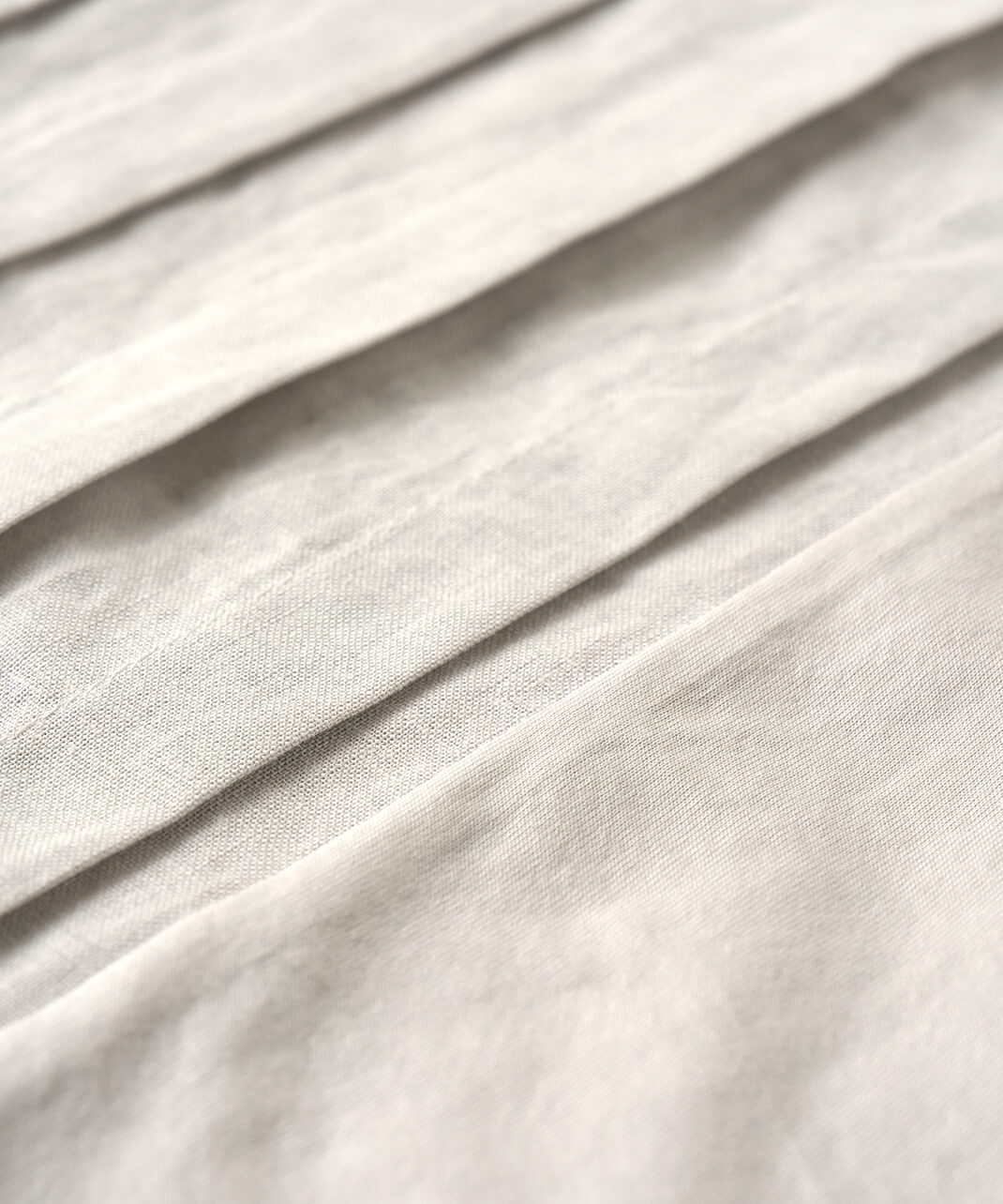 正面はコットンリネンの布帛生地を使用したタックデザイン。やや太めのタック幅は、カジュアルにもきれいめにも着こなせます。