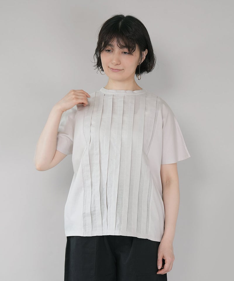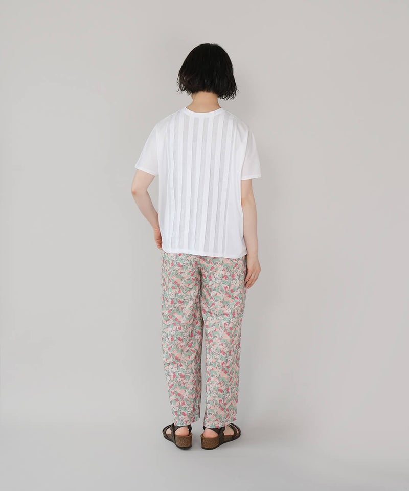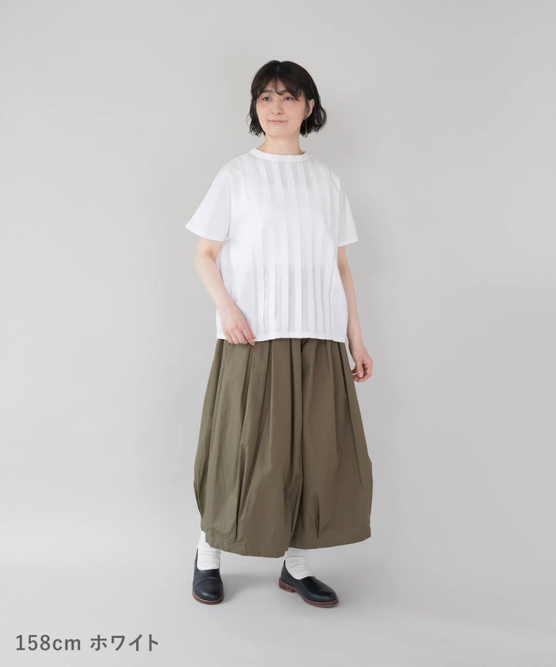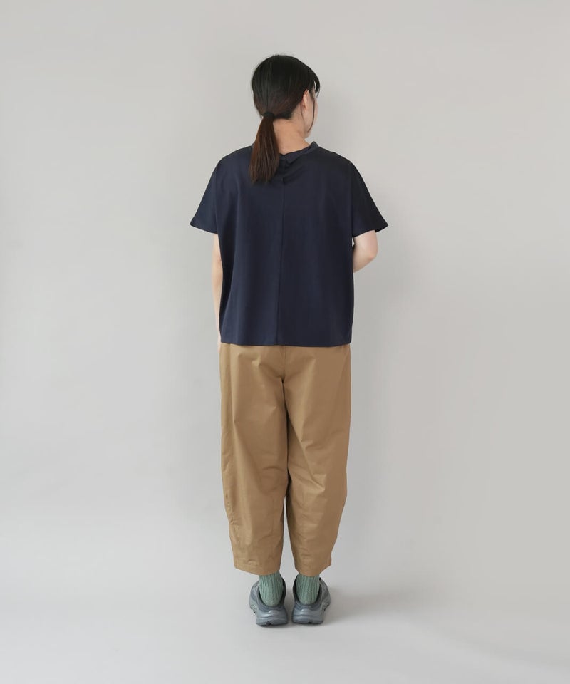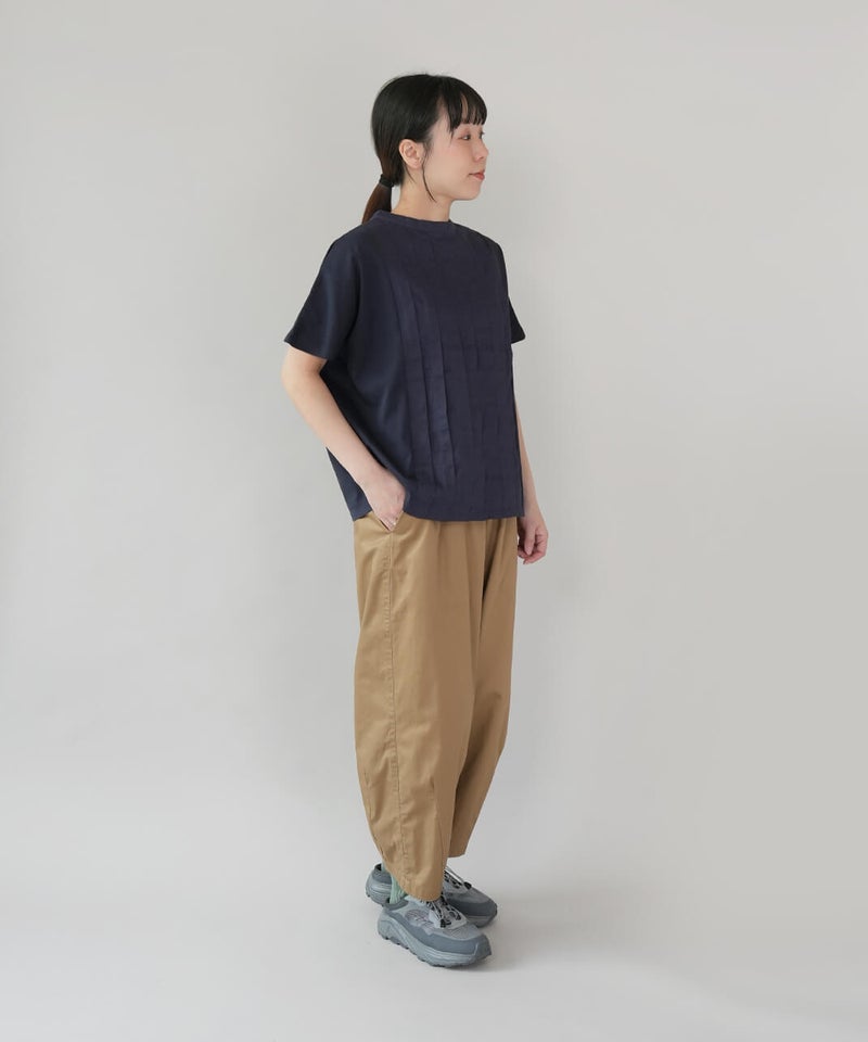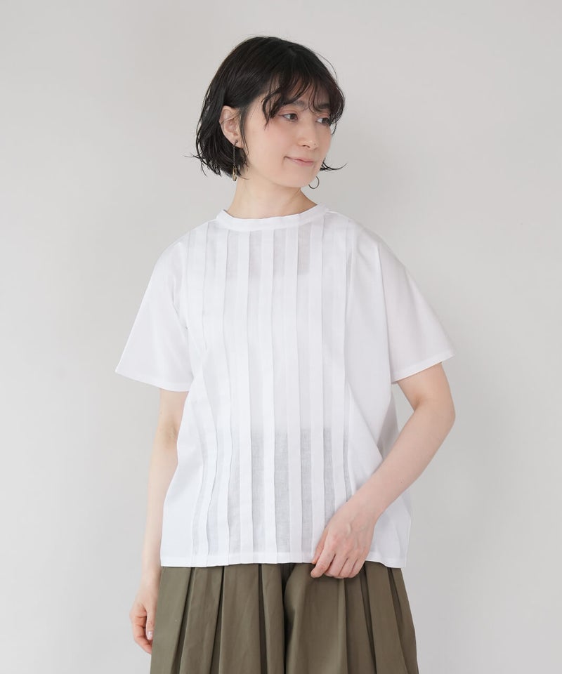 正面はコットンリネンの布帛生地を使用したタックデザイン。やや太めのタック幅は、カジュアルにもきれいめにも着こなせます。