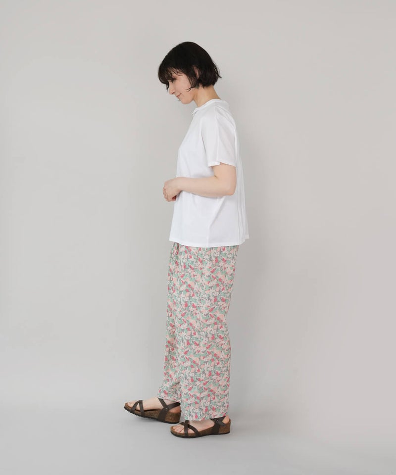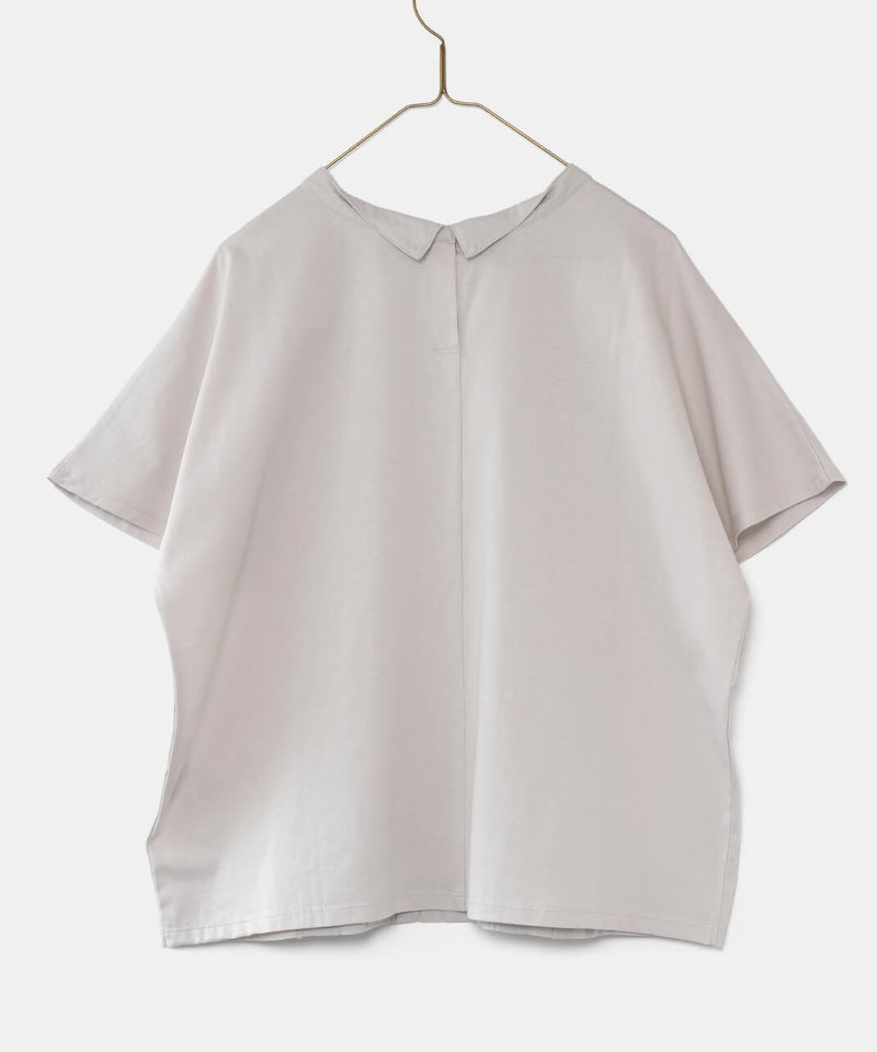 ボタン開きの部分はインナーが見えない仕様です。 シルケット加工を施した生地は、やや光沢があり上品な質感。薄手のコットン天竺をベースにしており、気兼ねなく洗濯機洗いが出来ます。