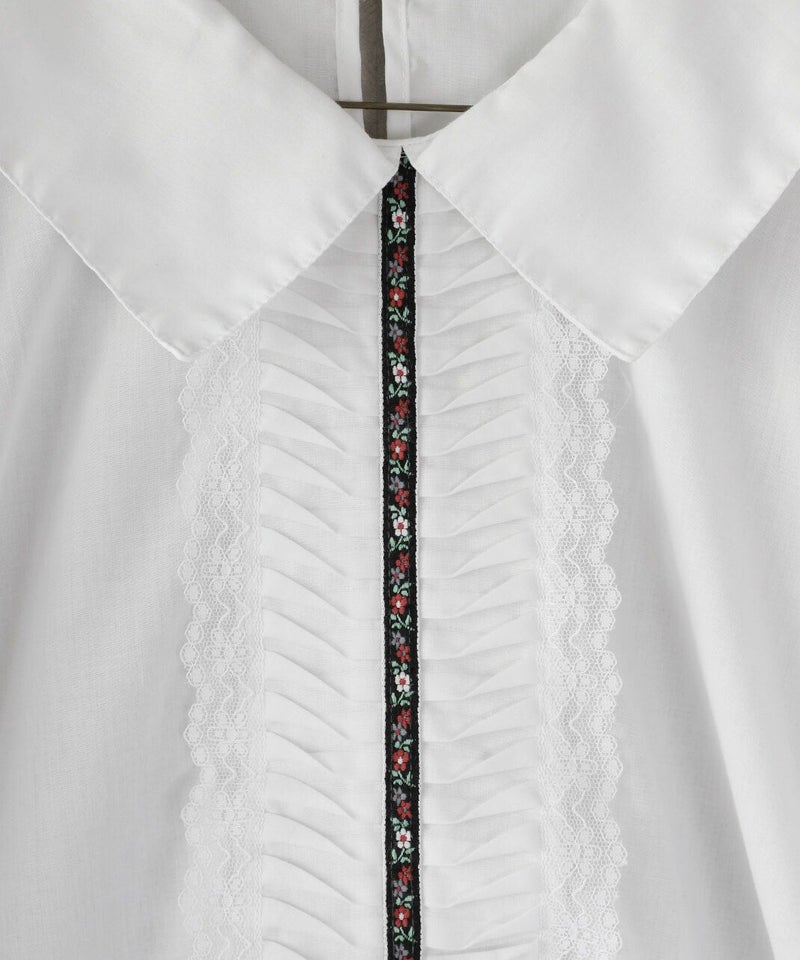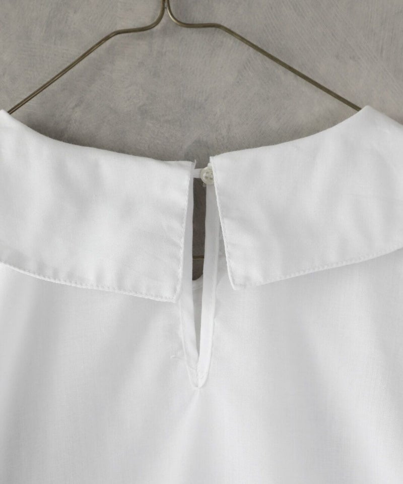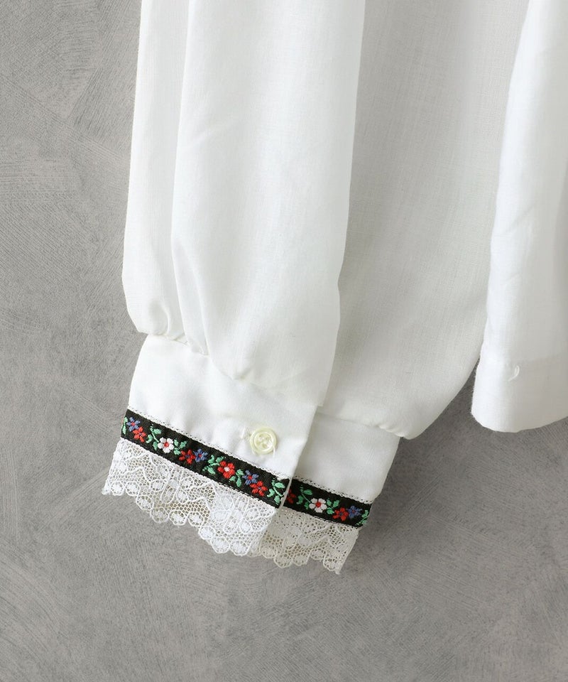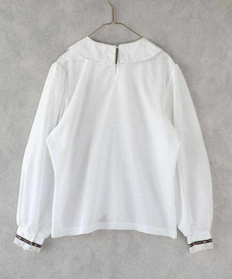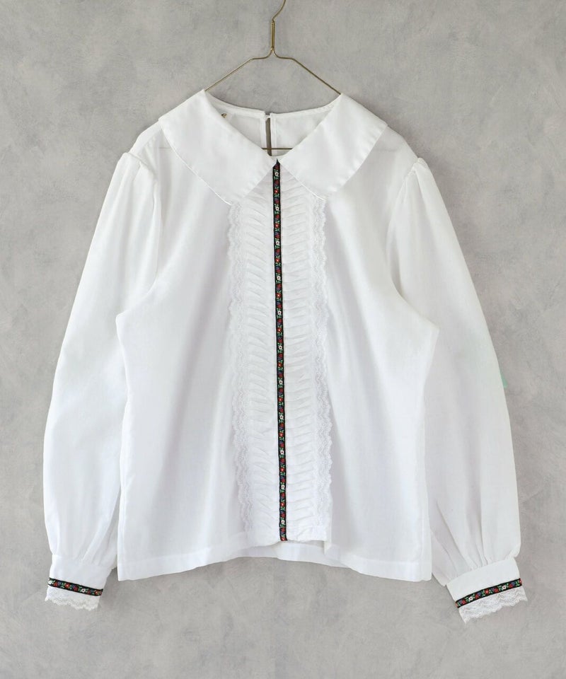 ホワイトコットンのやさしい風合いに、繊細な刺繍やレースが丁寧にあしらわれた一枚。クラシカルで上品な雰囲気が漂うデザインが、さりげなく個性を引き立ててくれます。古着ならではのやわらかな生地感と、一点物として特別な一着をお楽しみください。