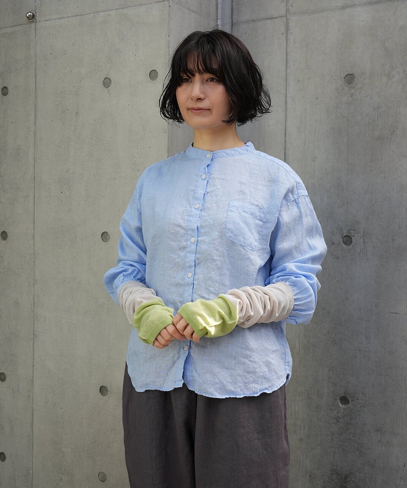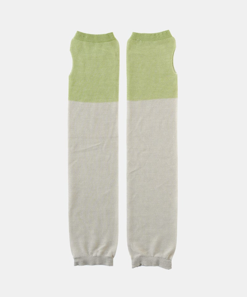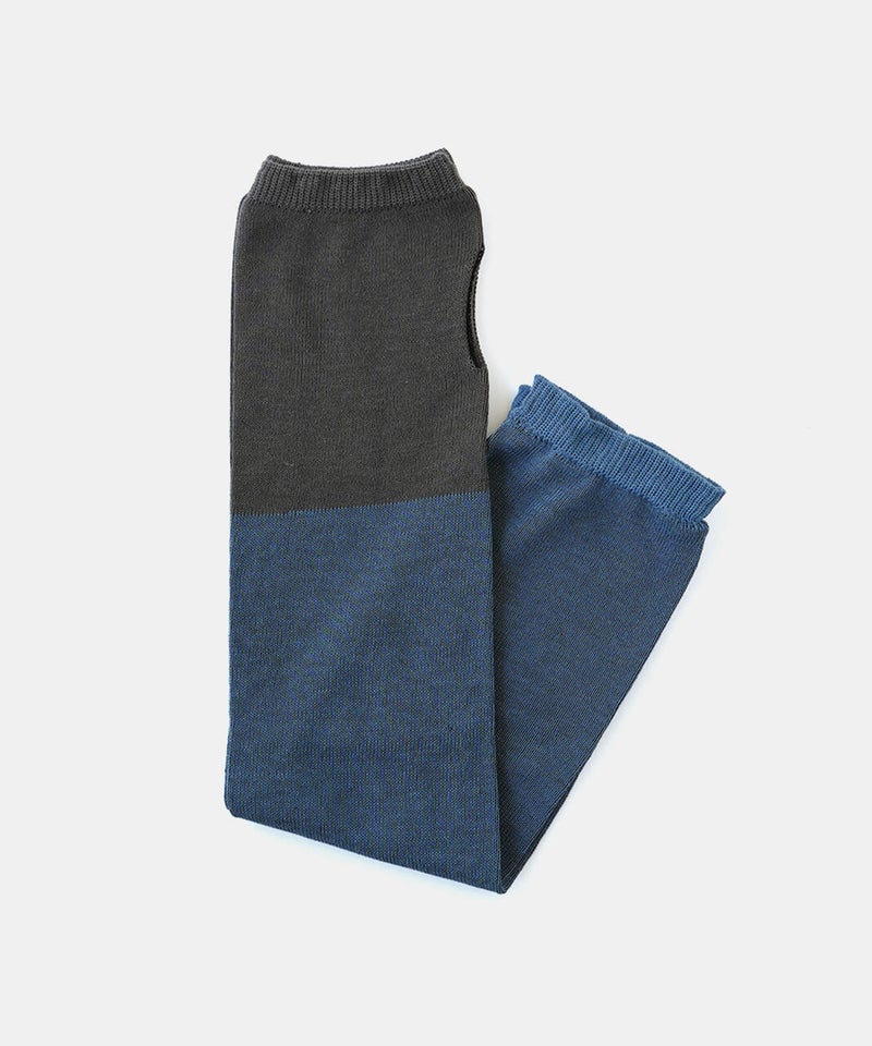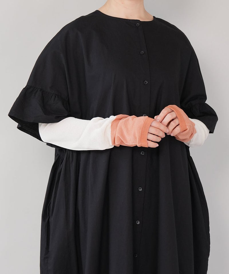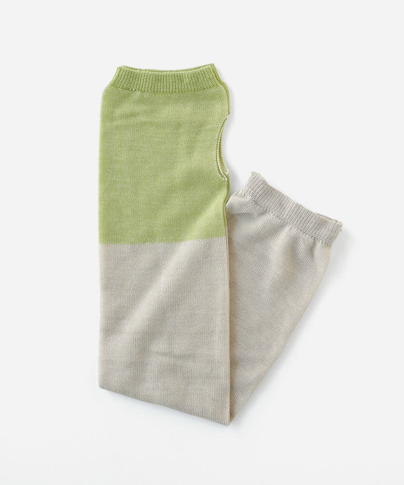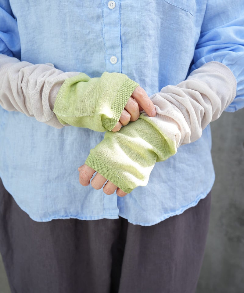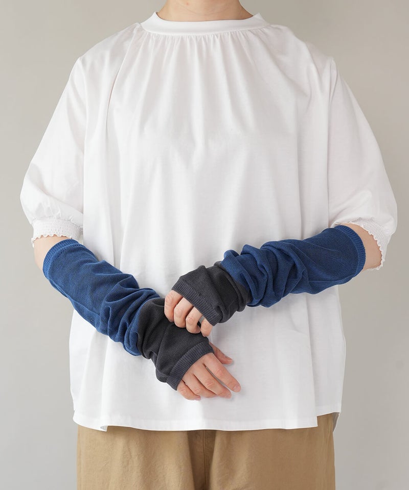 なめらかシルク × さらさらコットン アームカバー肌に当たる内側はシルク、外側は強撚コットンのアームカバーです。肌に当たる内側にはシルクたっぷり生地の内側にはなめらかなシルクを使用し、肌当たりがとても優しいです。シルクには紫外線から肌を守る天然のUVカット効果と保湿効果があり、敏感肌でも安心して身に付けていただけます。抗菌・防臭糸だから清潔・強撚コットンでベタつきを防ぐ外側に使用した強撚コットンは生地に麻のようなシャリ感があり、汗や湿気で張り付きにくくベタつきません。また、コットンには、抗菌・防臭効果のある糸を使用しているので清潔です。菌によるニオイの元を防ぎます。内側をフラットにしたことで、ゴムがなくてもずれ落ちないアームカバーはゴムがないとずれ落ちてしまいますが、できるだけ締め付けや跡がつかないように、内側のみ編み地をフラットにしゴムを抜いています。UVカット率れんが色 84%以上うぐいす色 80%以上灰白色 78%以上墨 89%以上青色 82%以上mumokuteki別注カラー定番の機能性はそのままにコーディネートの幅を広げる別注カラーは、5色展開です。ベーシックに使える落ち着いた色合いから、スタイリングのアクセントになるカラーまでラインナップ。ウェアやスタイリングに合わせて選べるカラー展開で、日常のコーディネートにも映えるアームカバーです。mumokutekiでしか買えない別注カラーは、ご自分用にはもちろん、ギフトにおすすめです。シルク製品のお洗濯方法①洗い桶に40℃以下の水を用意し、用途欄に毛・絹を含む中性洗剤を適量溶かして、押し洗いします。手洗いは難しい場合は、洗濯ネットに入れ、弱流水でお洗濯します。※水温が冷たすぎると・熱すぎると繊維が縮む原因になります。②たっぷりの水で、押し洗いしながら最低2~3回すすぎます。すすぎ終わったら、手で軽く絞り、タオルなどで優しく押さえて水気を拭き取ります。③風通しのいい場所で、形を整えて陰干し、または室内干しをします。直射日光に当たると変色や劣化に繋がりますので、ご注意ください。④しっかりと乾燥させ、風通しがよく涼しい場所に、防虫剤や乾燥剤を一緒に収納します。湿気が多い場所での保管は、カビや虫食いの原因となります。