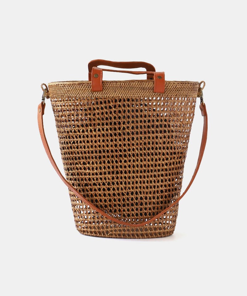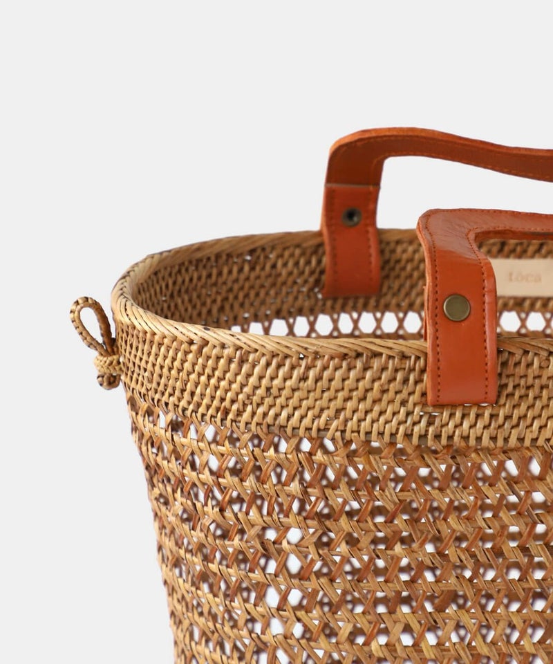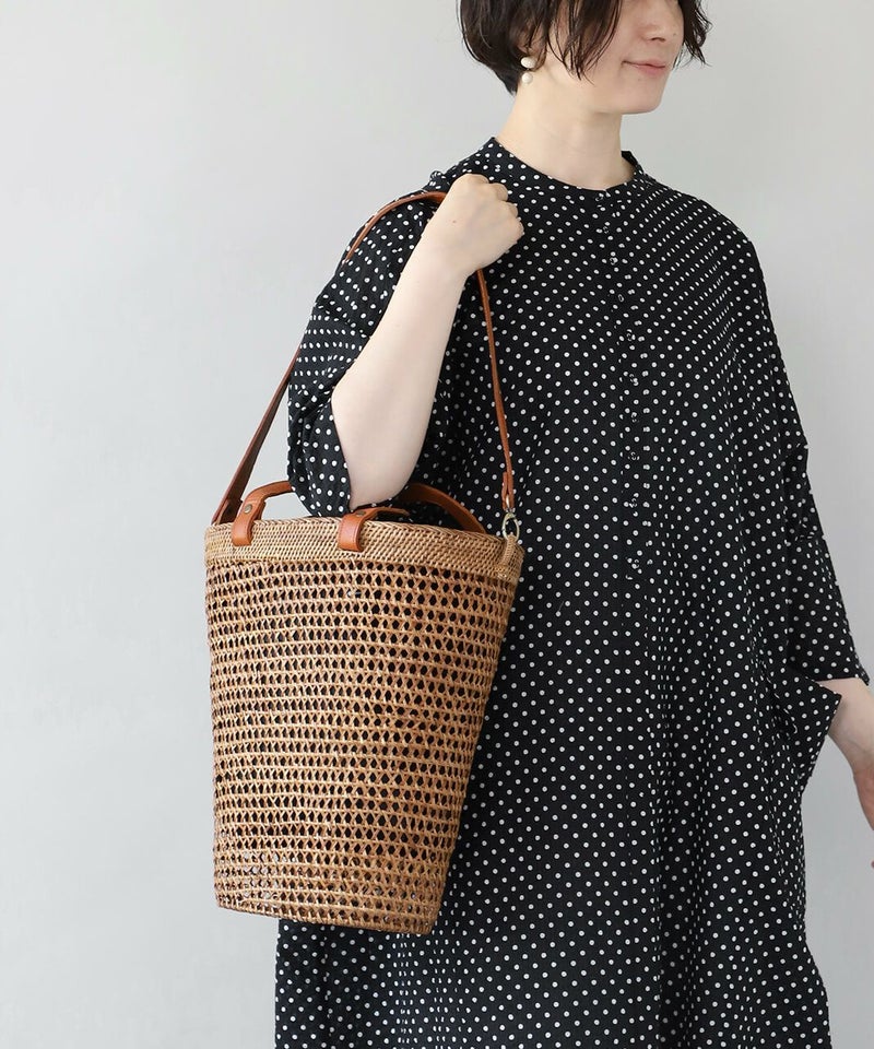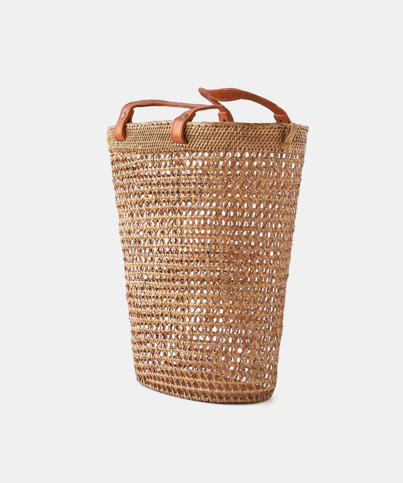 天然草木(アタ)を編み込んだバケツ型のかごバッグ。