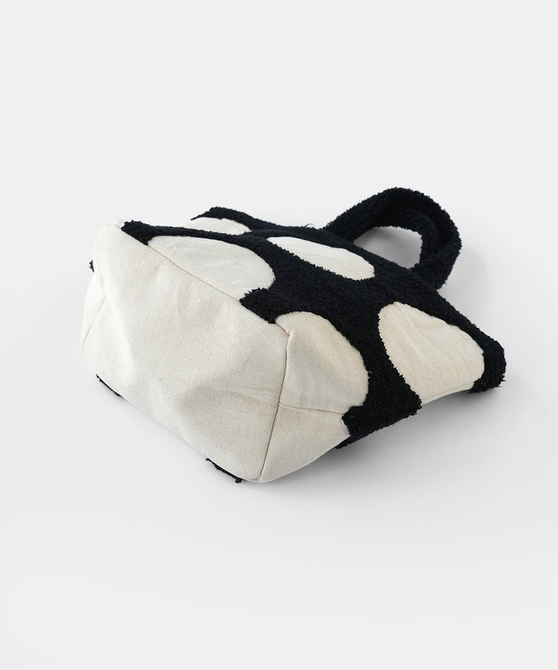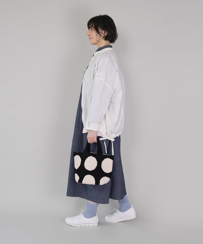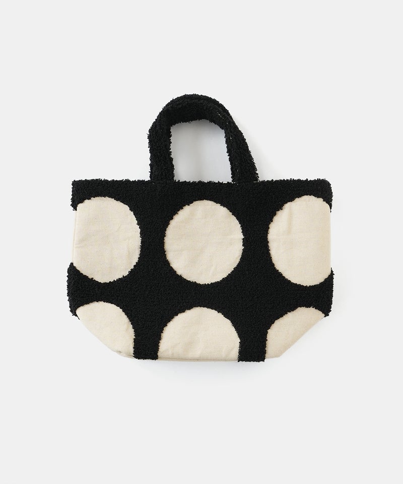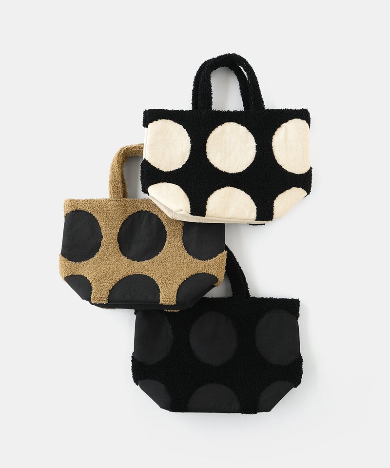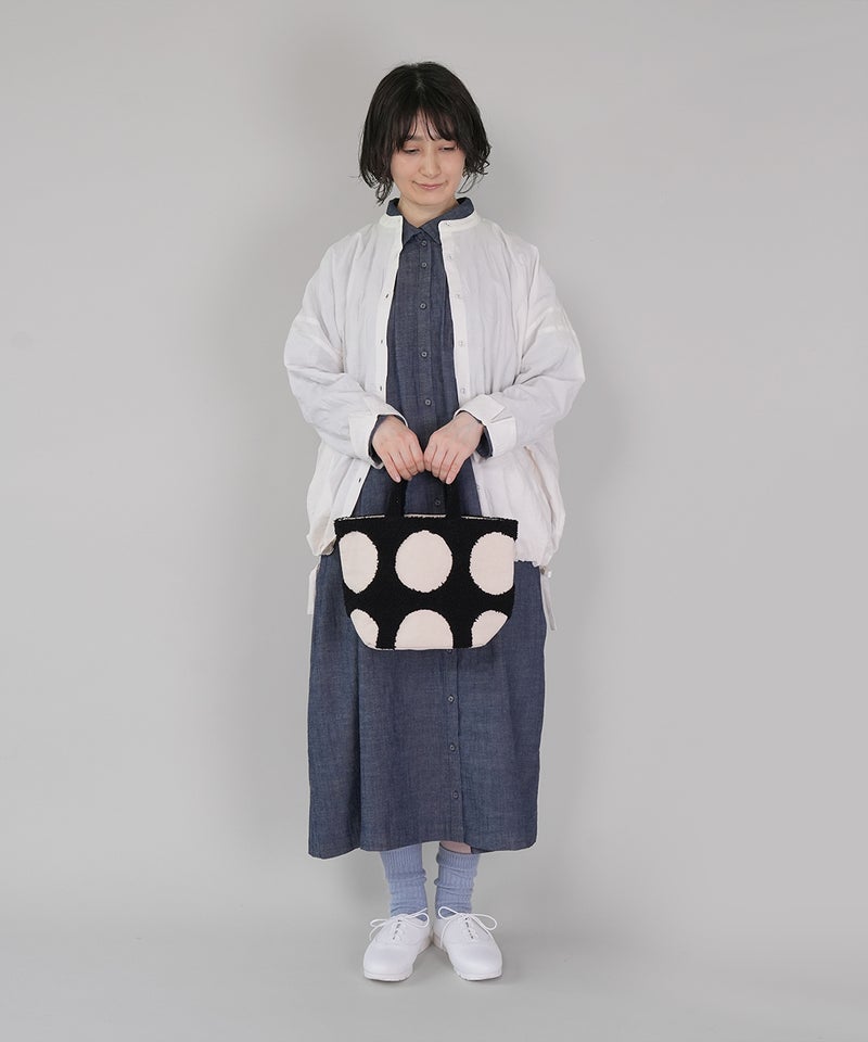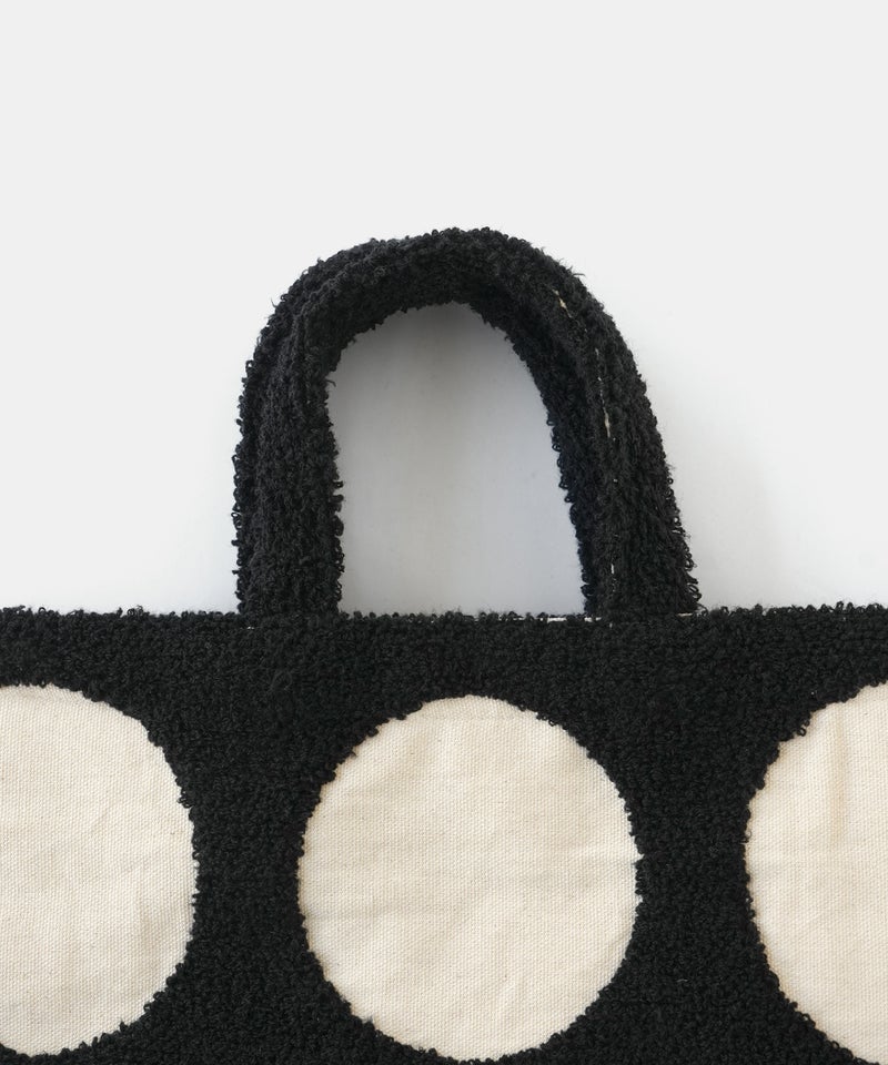 パンチング刺繍のループパイルで立体的に柄を表現した、ドット柄のトートバッグです。凹凸感のあるモチーフが印象的で、ほどよい存在感があります。落ち着いた配色でナチュラルにもカジュアルにもなじむデザインは、シンプルなコーディネートにおすすめです。