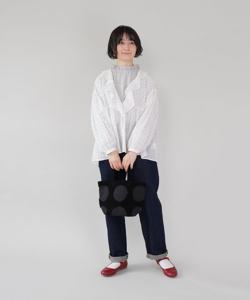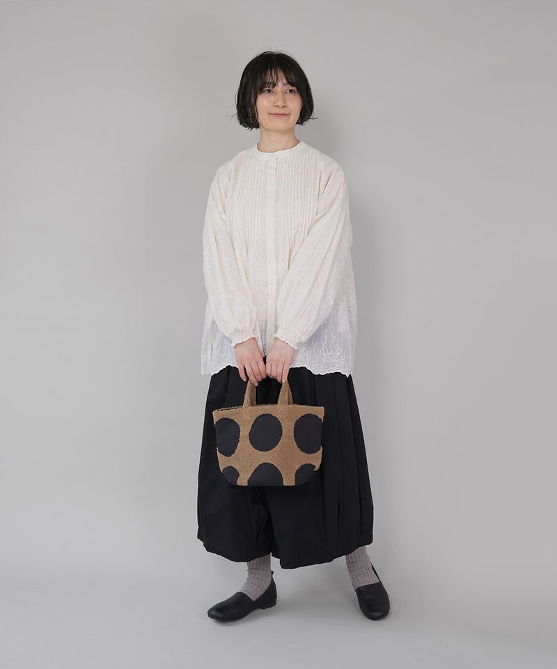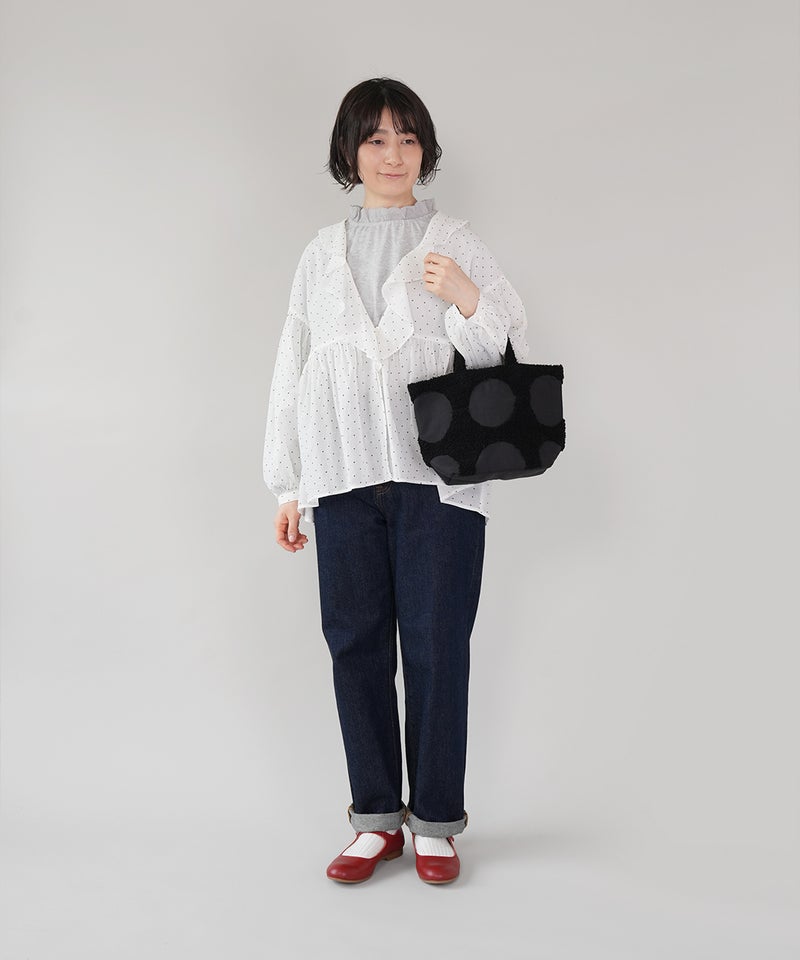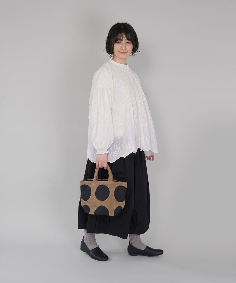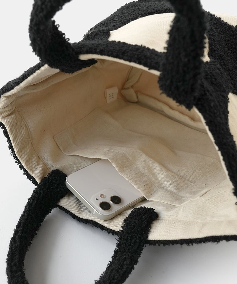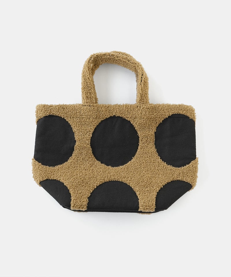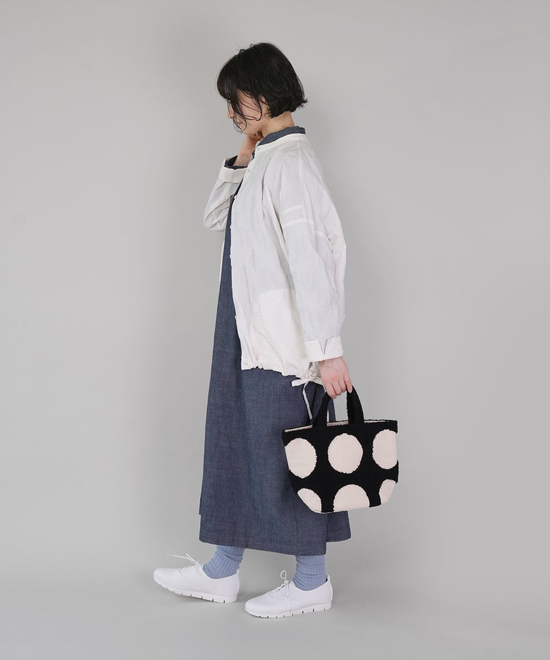 パンチング刺繍のループパイルで立体的に柄を表現した、ドット柄のトートバッグです。凹凸感のあるモチーフが印象的で、ほどよい存在感があります。落ち着いた配色でナチュラルにもカジュアルにもなじむデザインは、シンプルなコーディネートにおすすめです。